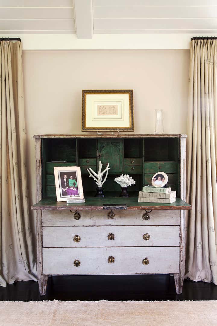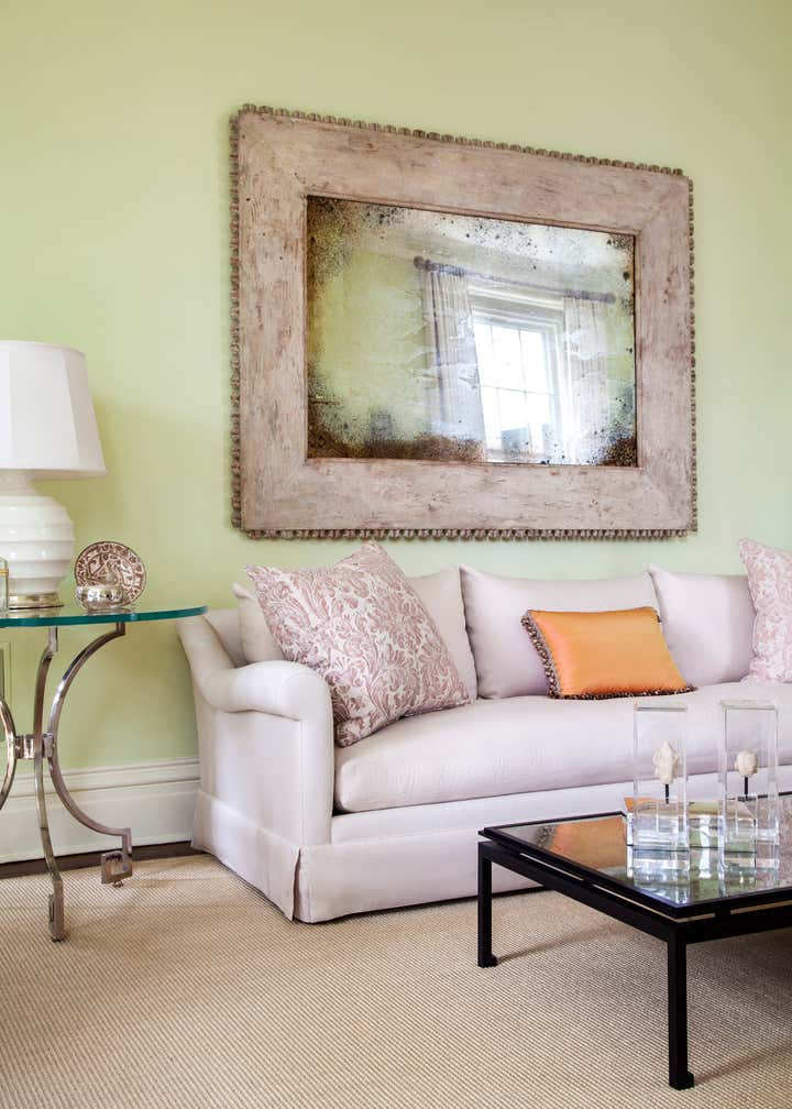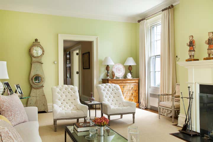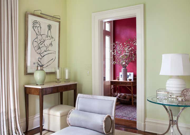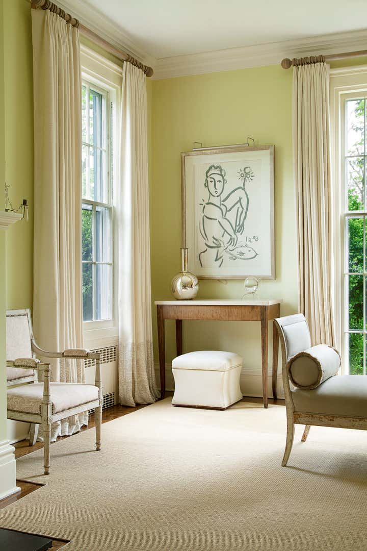 A stunning renovation and addition to a historic Federal house, by architect Robert Orr. Donald Kaufman selected the mint green paint for the drawing room; custom-made upholstered pieces, art, antiques and fabrics by Robert Kime, Quadrille and Fortuny, amongst others.