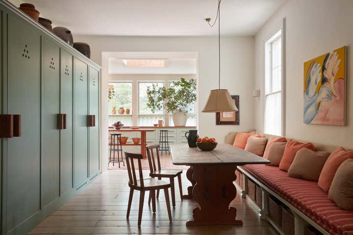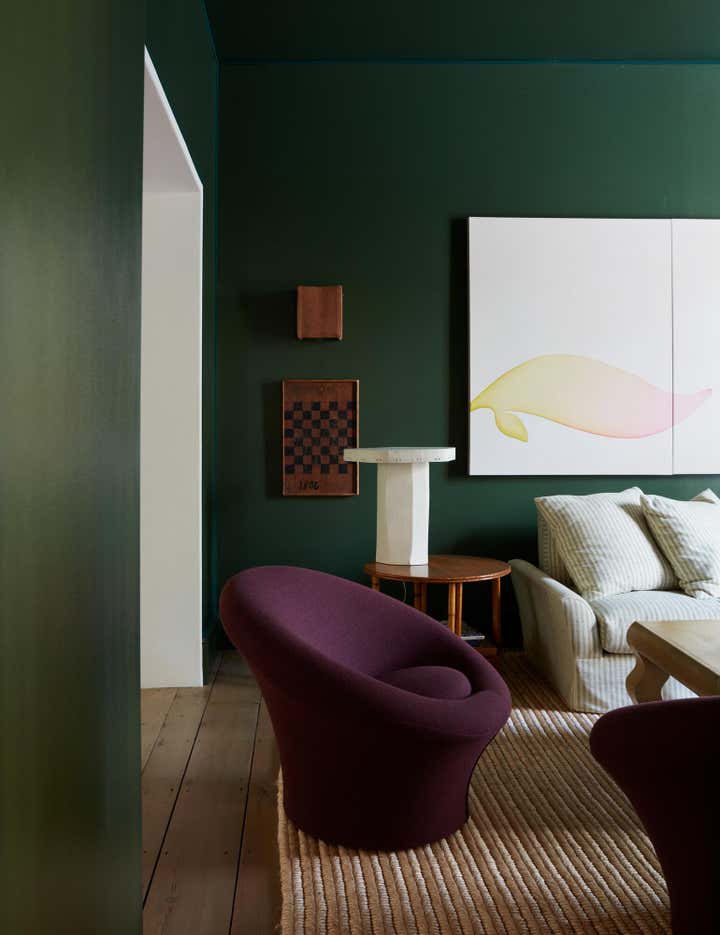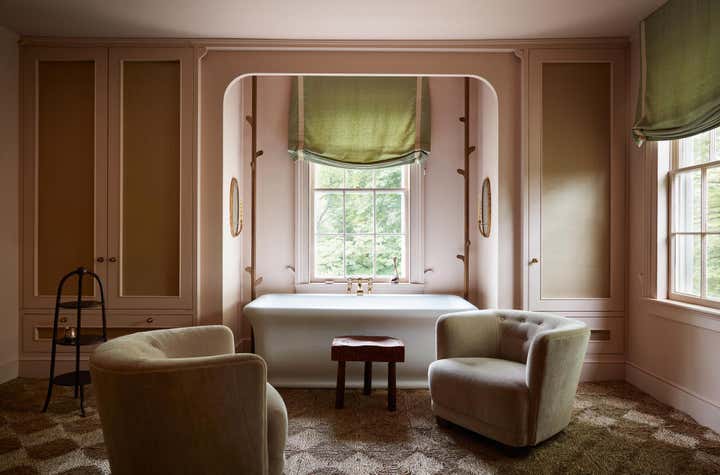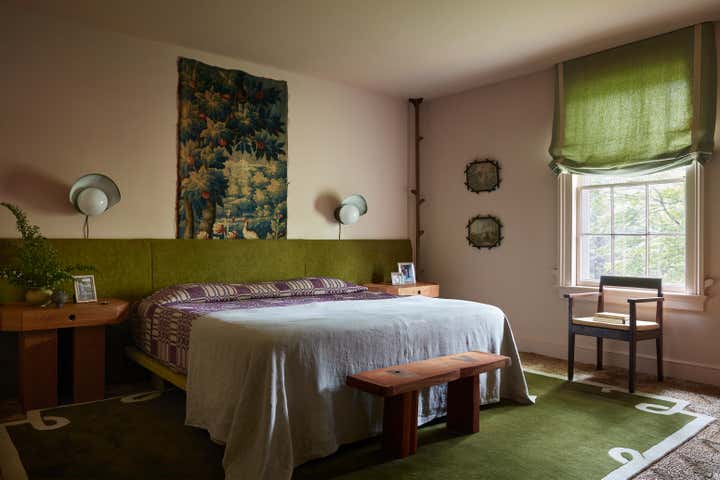 Touches of green pick up the verdant lawn unspooling out front — a wall-length silk headboard the color of moss; Nordic Knots rugs in piquant olive. As Goethe recommended, green is “for rooms to live in constantly.”