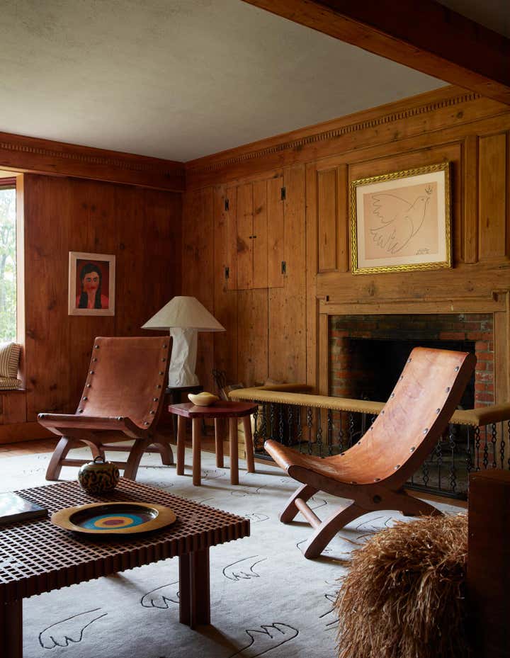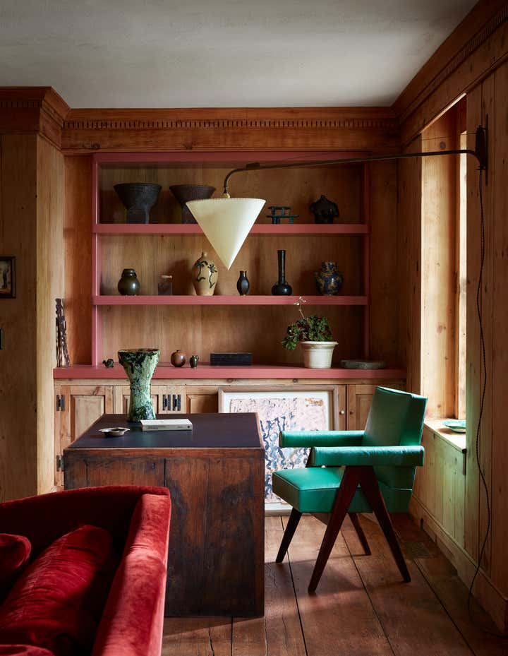 Contributions from friends mingle with the studio’s recurring forms. Matt Merkel Hess's quixotic ceramic wall works play off the home’s original Federal-era Americana wallpaper, unearthed under layers of paint; the work of Peter Schlesinger and Purvis Young finds harmony with pieces by Landon Metz and Green River Project.