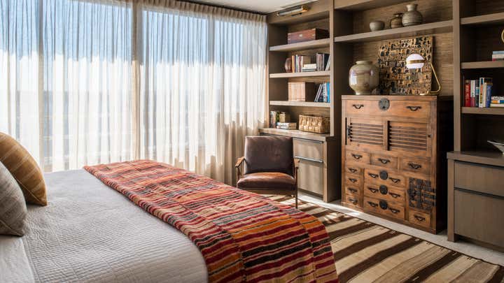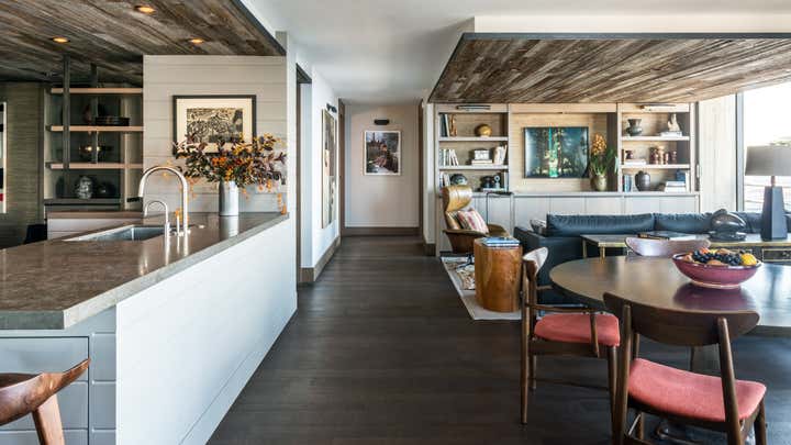 This downtown condominium was stripped to the studs to create a warm but masculine urban retreat for an Alaskan bachelor. The team created an open plan with a bright shell into which was added a rich textural blend of warm woods, grey stone, and woven wall coverings. Art and furnishings were selected to reflect a strong Northwest influence, complimenting panoramic views stretching from downtown Seattle to the Olympic Peninsula. The combined result is a casually-eclectic home with a tangible sense of soul and history.