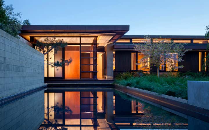 Conceived as a series of interconnected pavilions enclosing a garden, the courtyard-house typology is utilized to achieve private interiority within the suburban context. The strategic interplay of light and shadow, expansion and contraction, solidity and lightness is used to derive spatial richness. The house incorporates fuel cell and solar panel technologies, passive cooling, greywater reclamation, and extensive use of reclaimed finish materials.