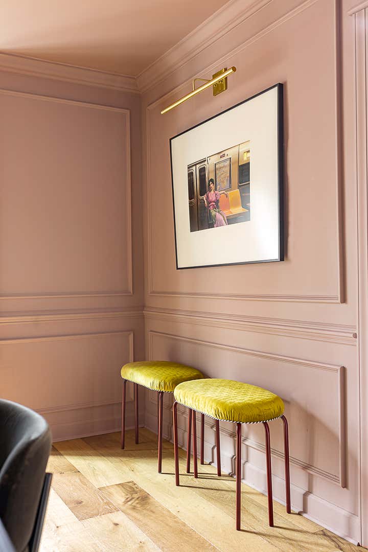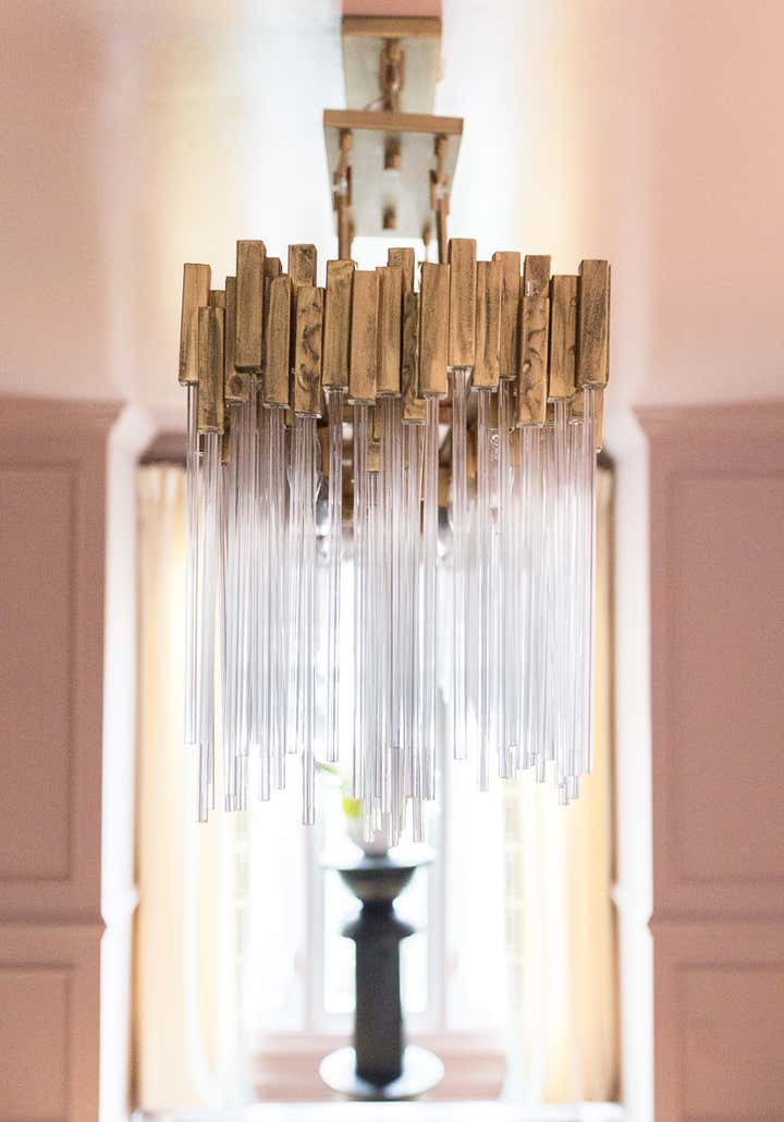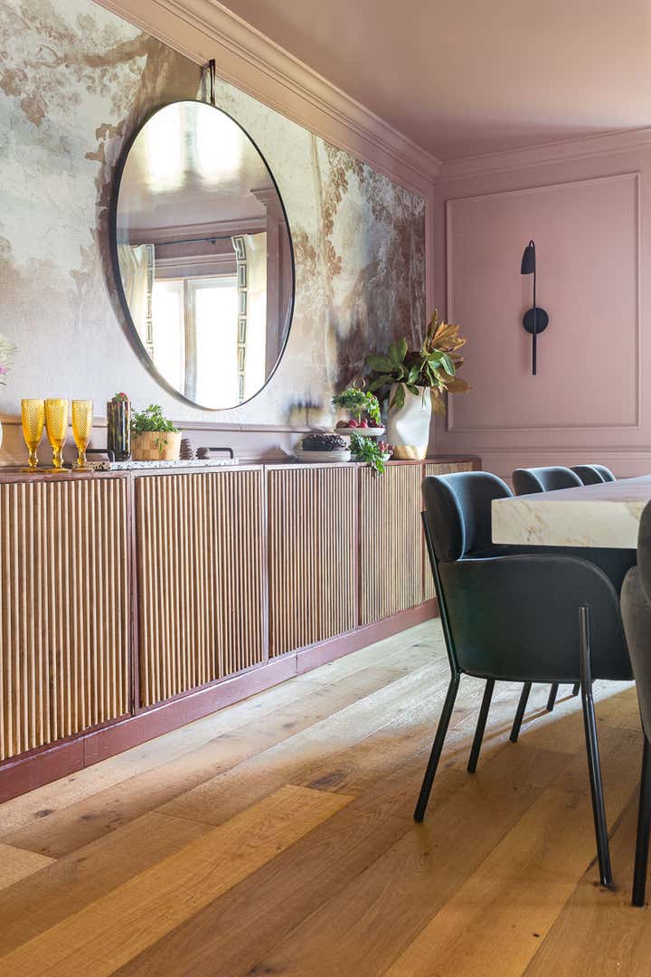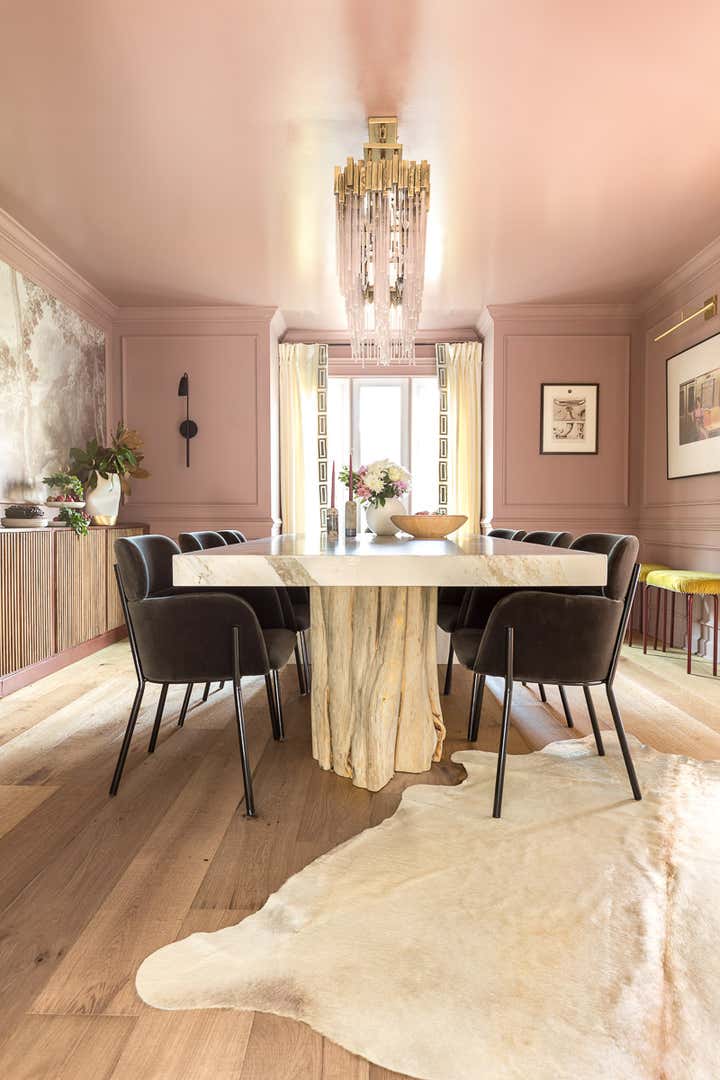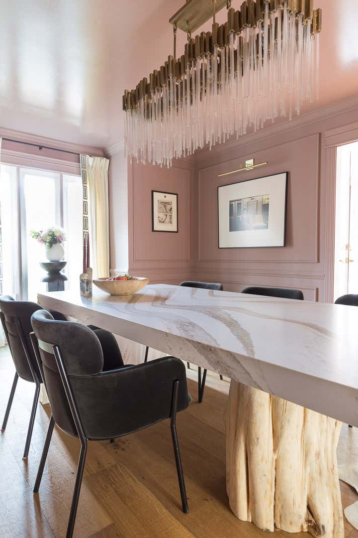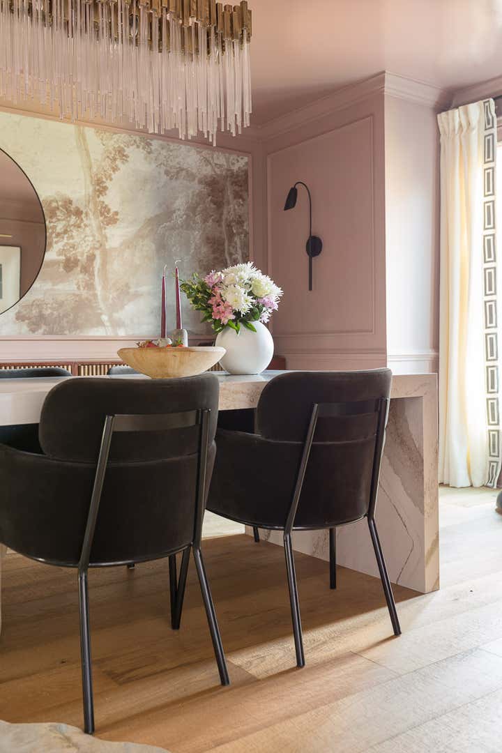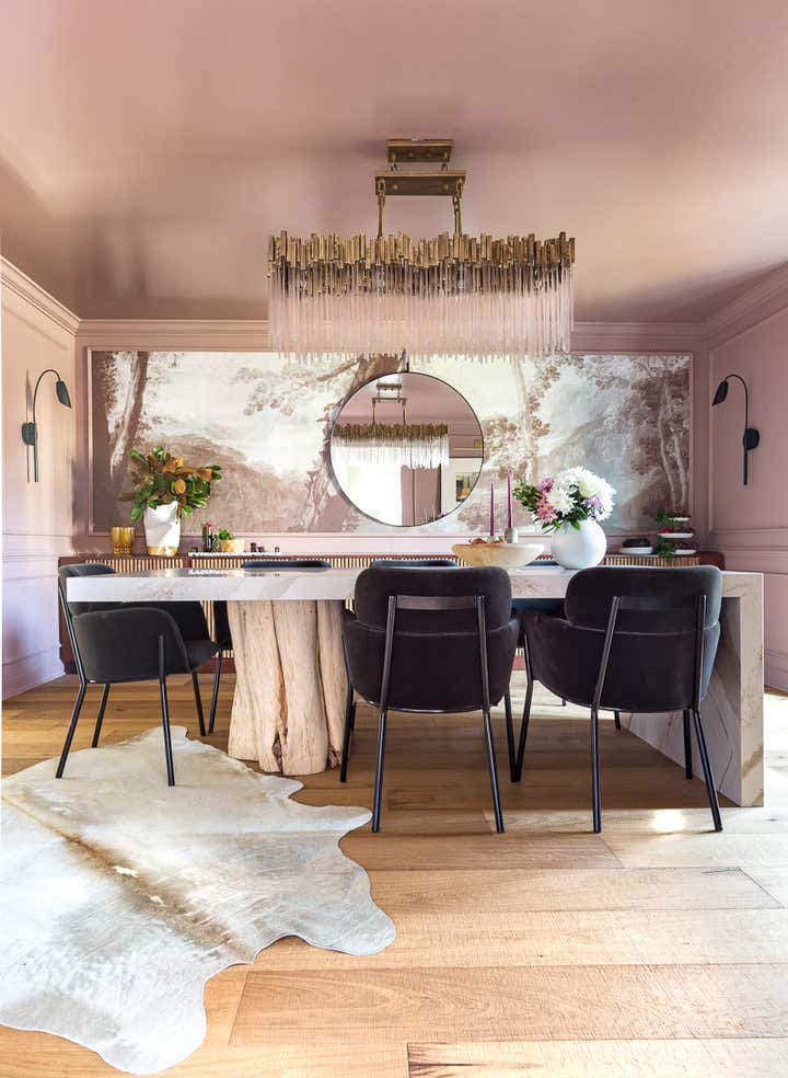 Opposites and contrasts are the basis for the magic behind this dining room. The feminity of the Farrow and Ball (Sulking Room Pink) walls and crystal chandelier are balanced by the earthy and more masculine elements of the custom table and charcoal chairs. The custom mural adds the perfect amount of pattern and interest.