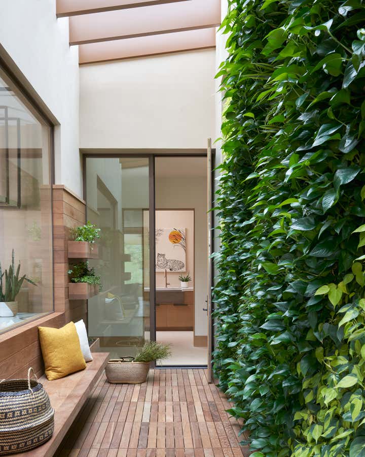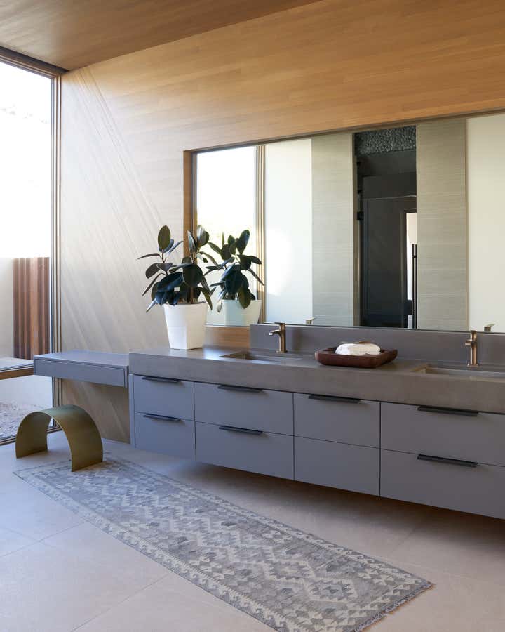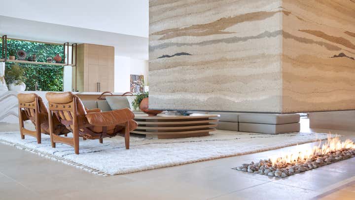 The suspended fireplace of the Great Room and the Primary Bedroom’s double-side fireplace are clad in rammed earth using pigmented dirt pounded in a form.
