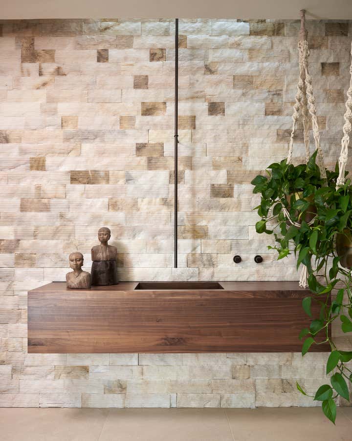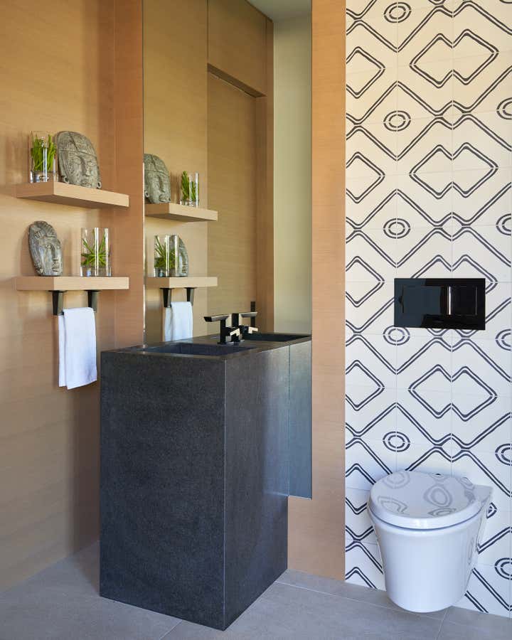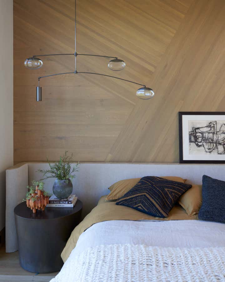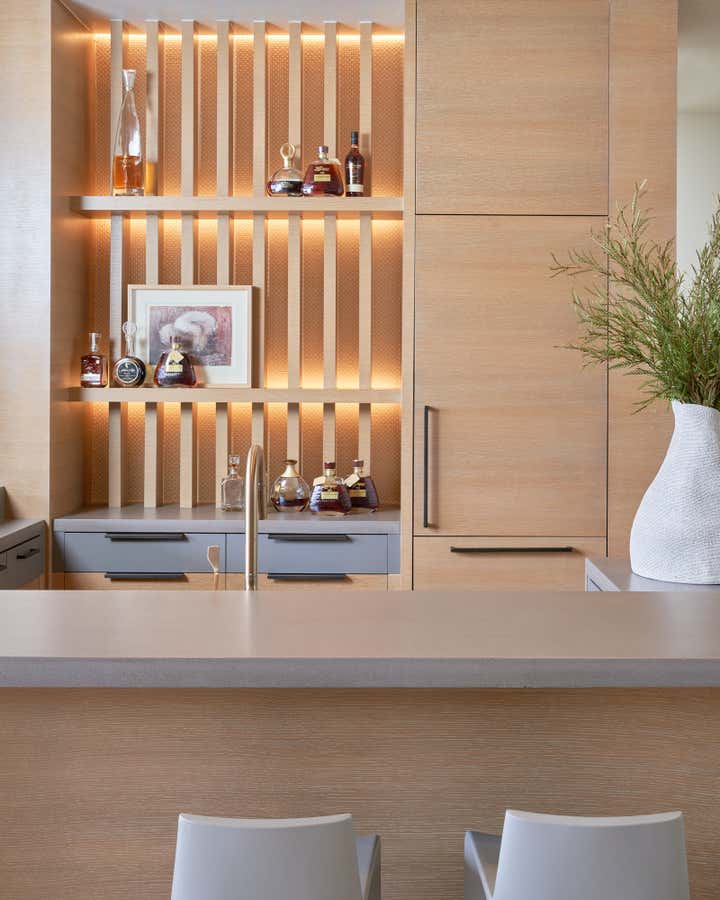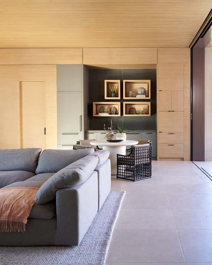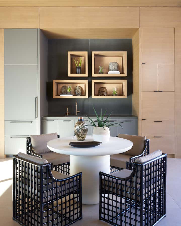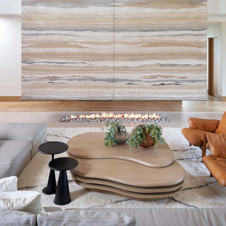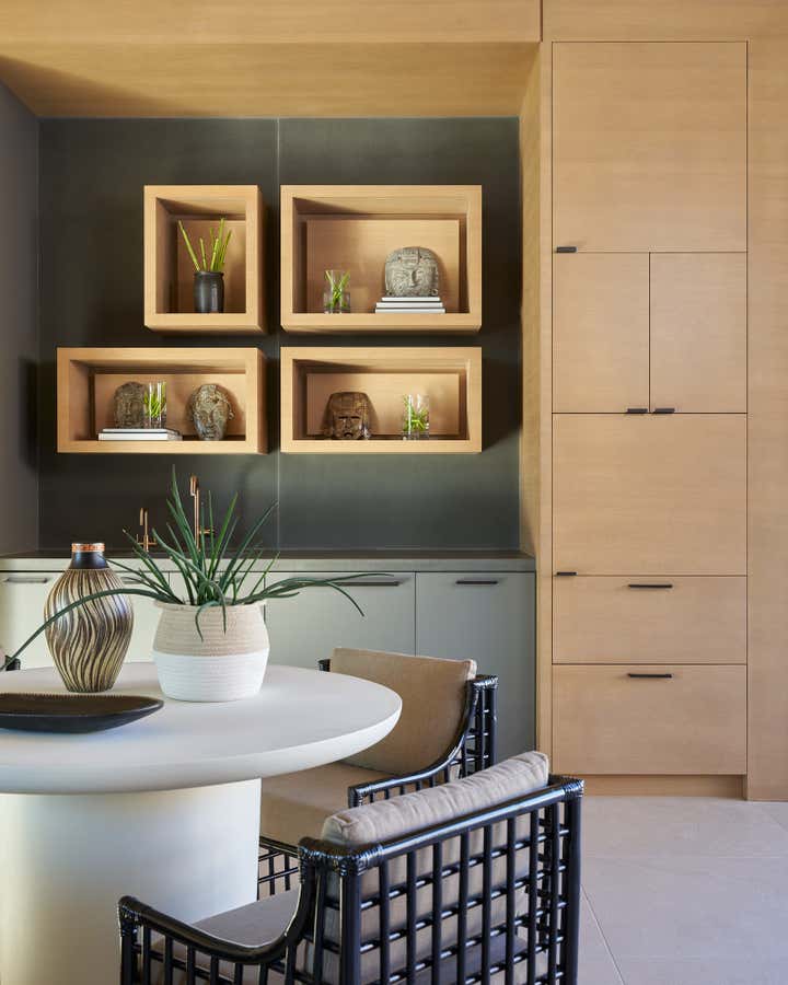 To honor the concept of “dwelling” and the owner’s Guatemalan roots, tribal and ethnic nods are used throughout the home’s furnishings such as textiles, pottery, and even carved Mayan masks. Modern Italian pieces are mixed with vintage finds, such as the 1960’s cognac leather Brazilian lounge chairs. The Great Room is grounded by a bespoke white oak coffee table designed by the designer as a one of a kind is inspired by canyon wall strata layers, it adds organic movement to soften the space.