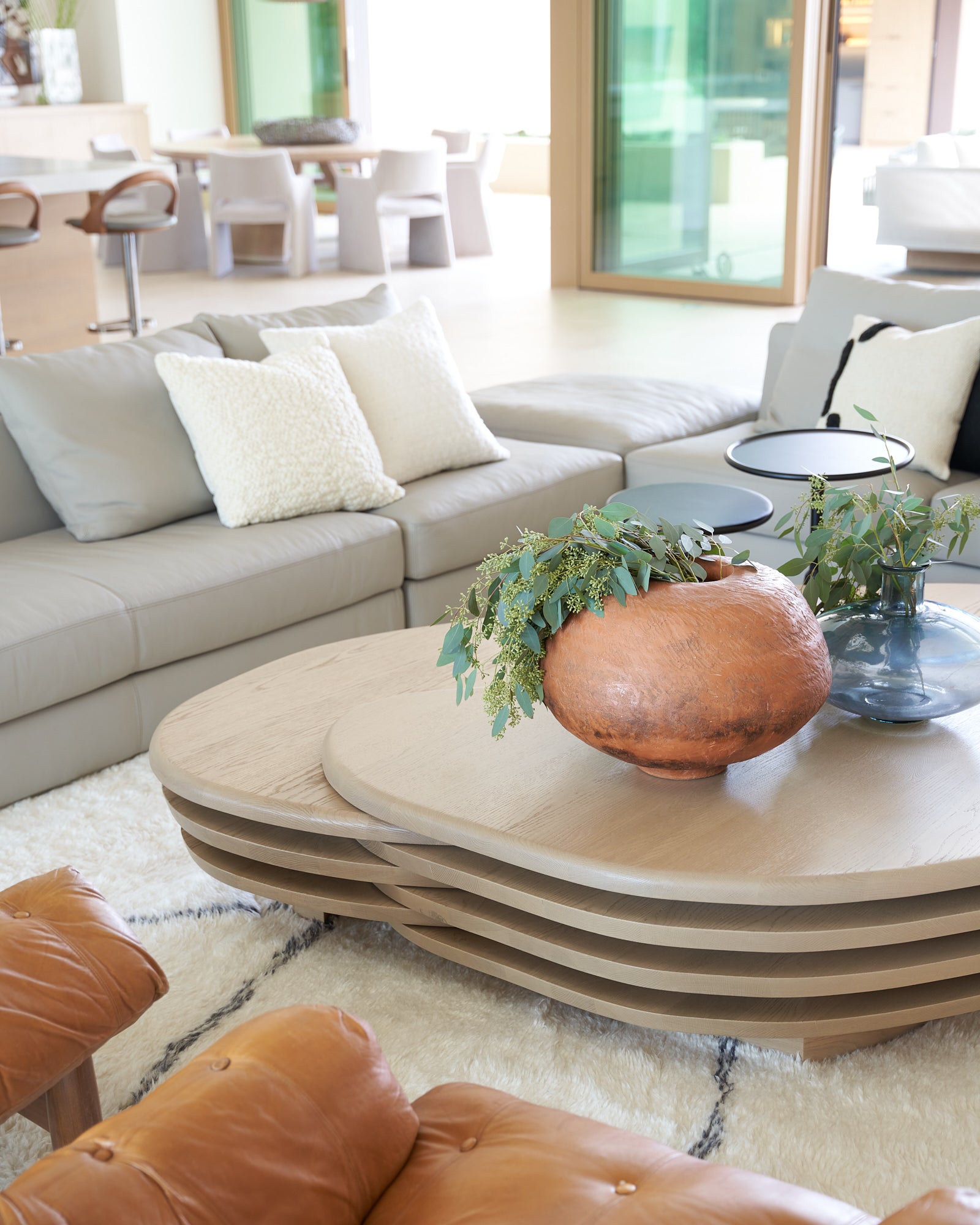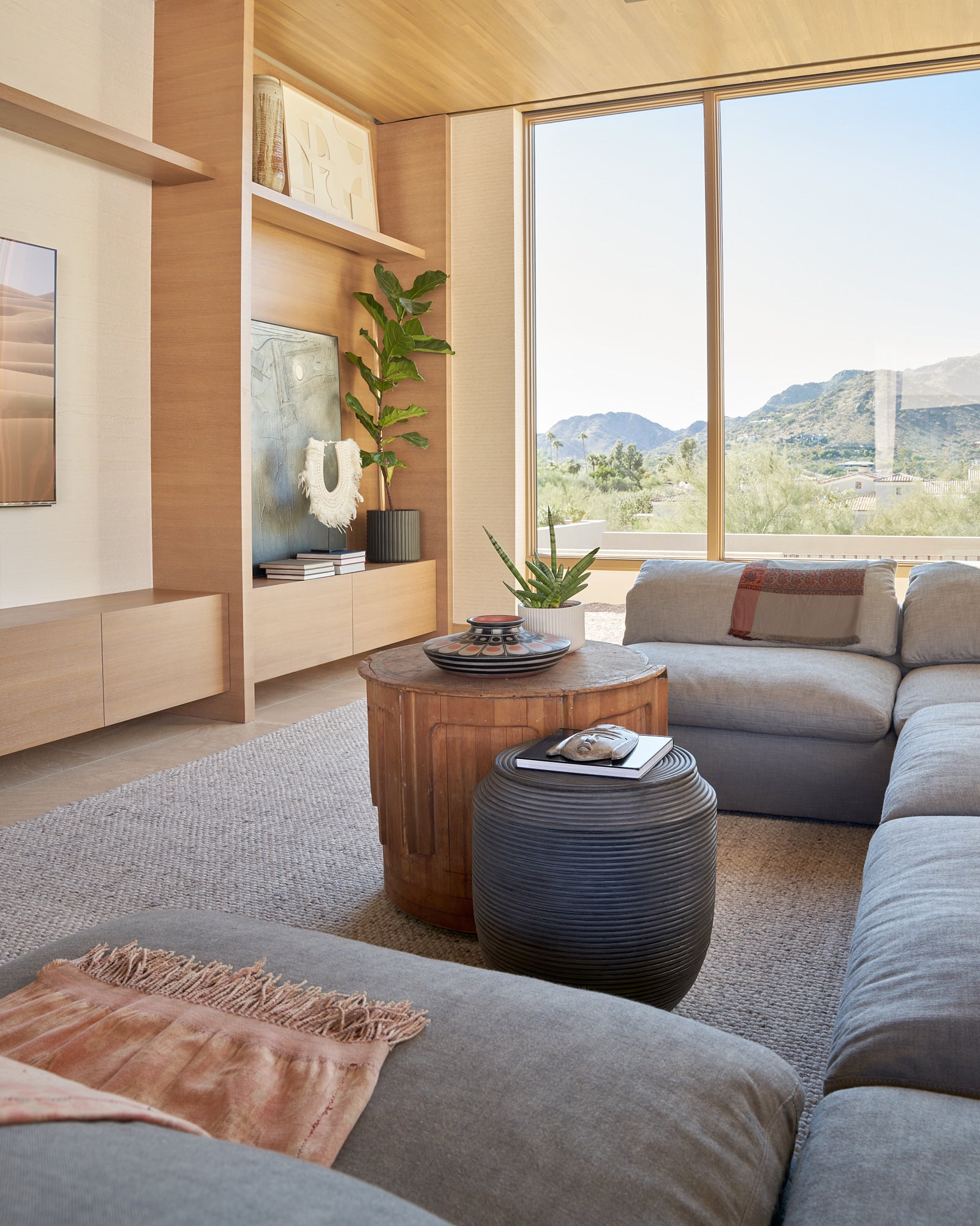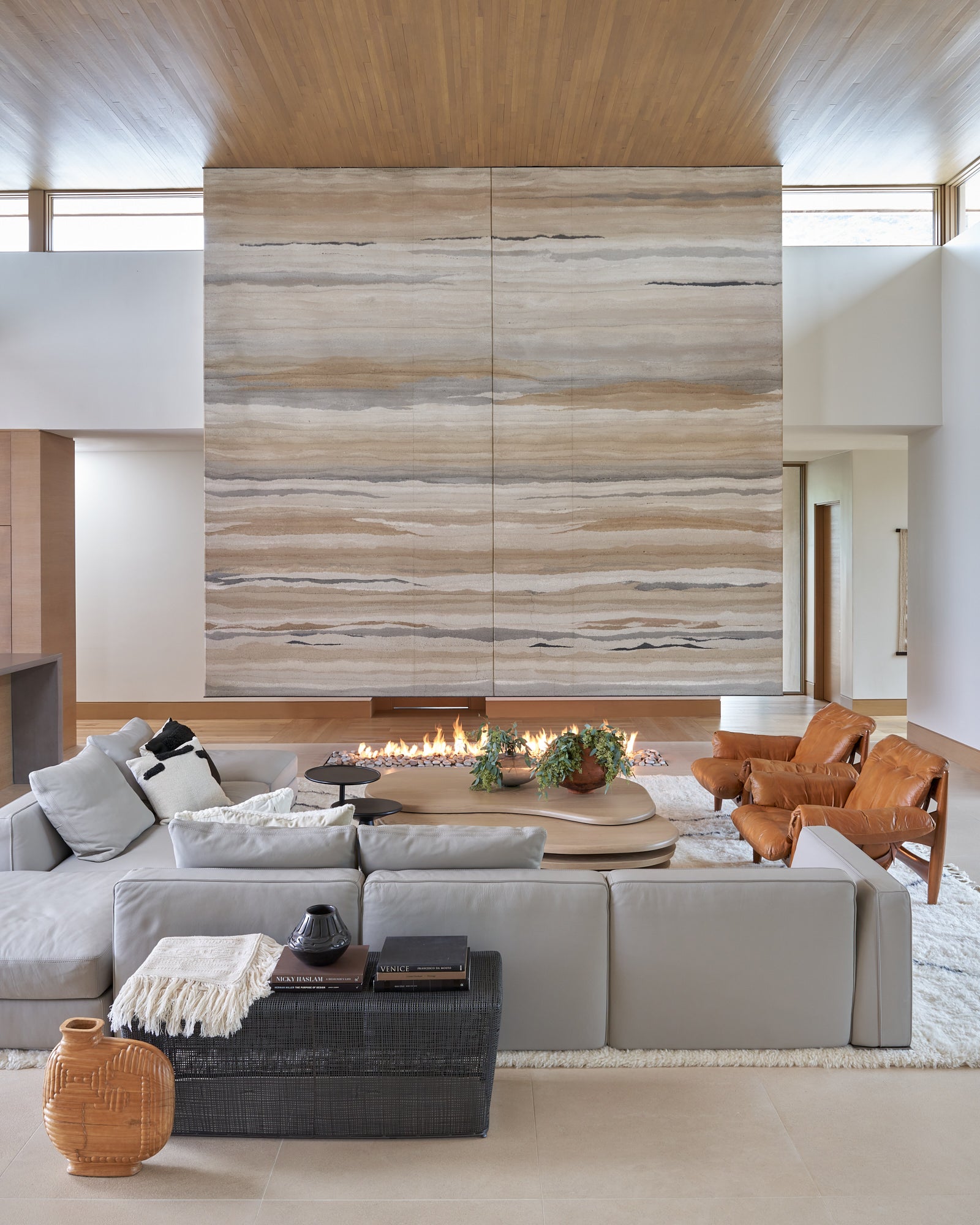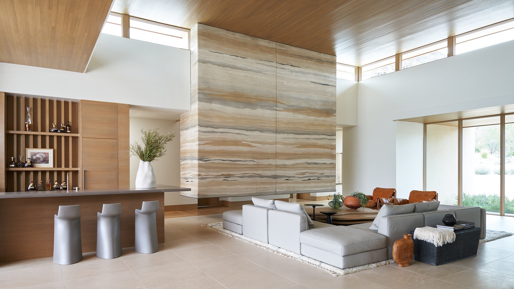 To honor the concept of “dwelling” and the owner’s Guatemalan roots, tribal and ethnic nods are used throughout the home’s furnishings such as textiles, pottery, and even carved Mayan masks. Modern Italian pieces are mixed with vintage finds, such as the 1960’s cognac leather Brazilian lounge chairs. The Great Room is grounded by a bespoke white oak coffee table designed by the designer as a one of a kind is inspired by canyon wall strata layers, it adds organic movement to soften the space.