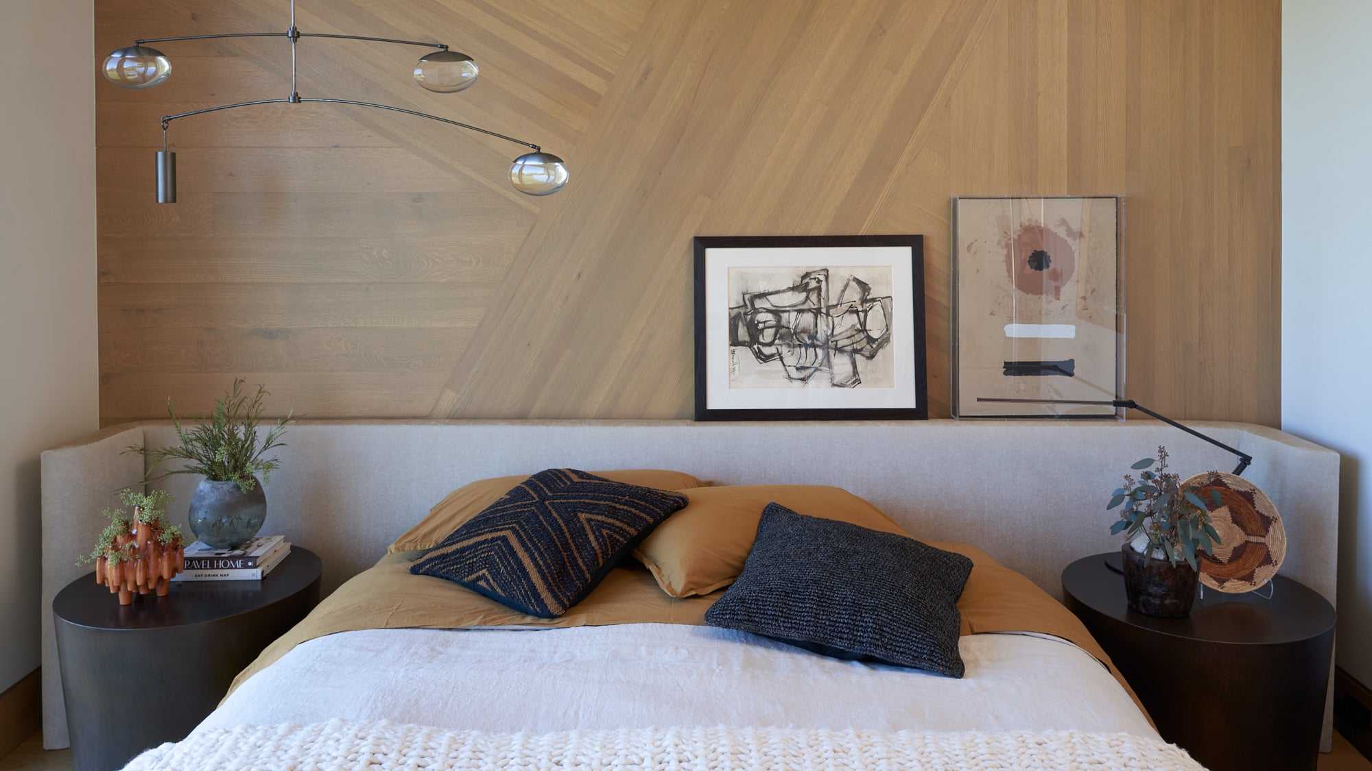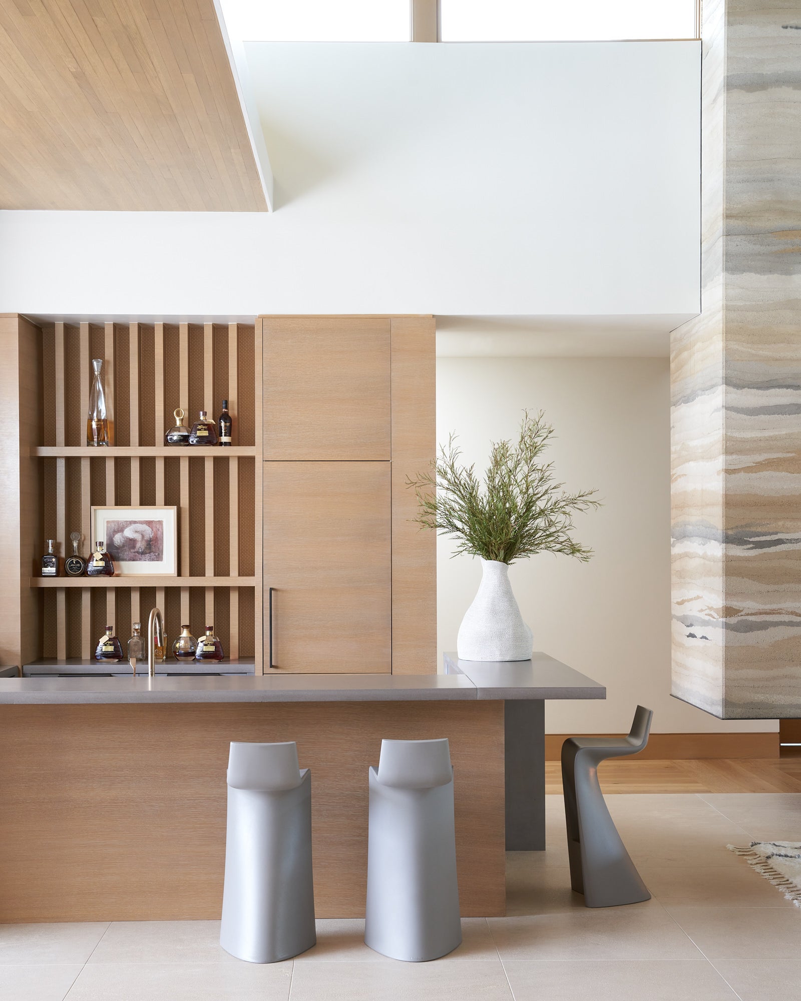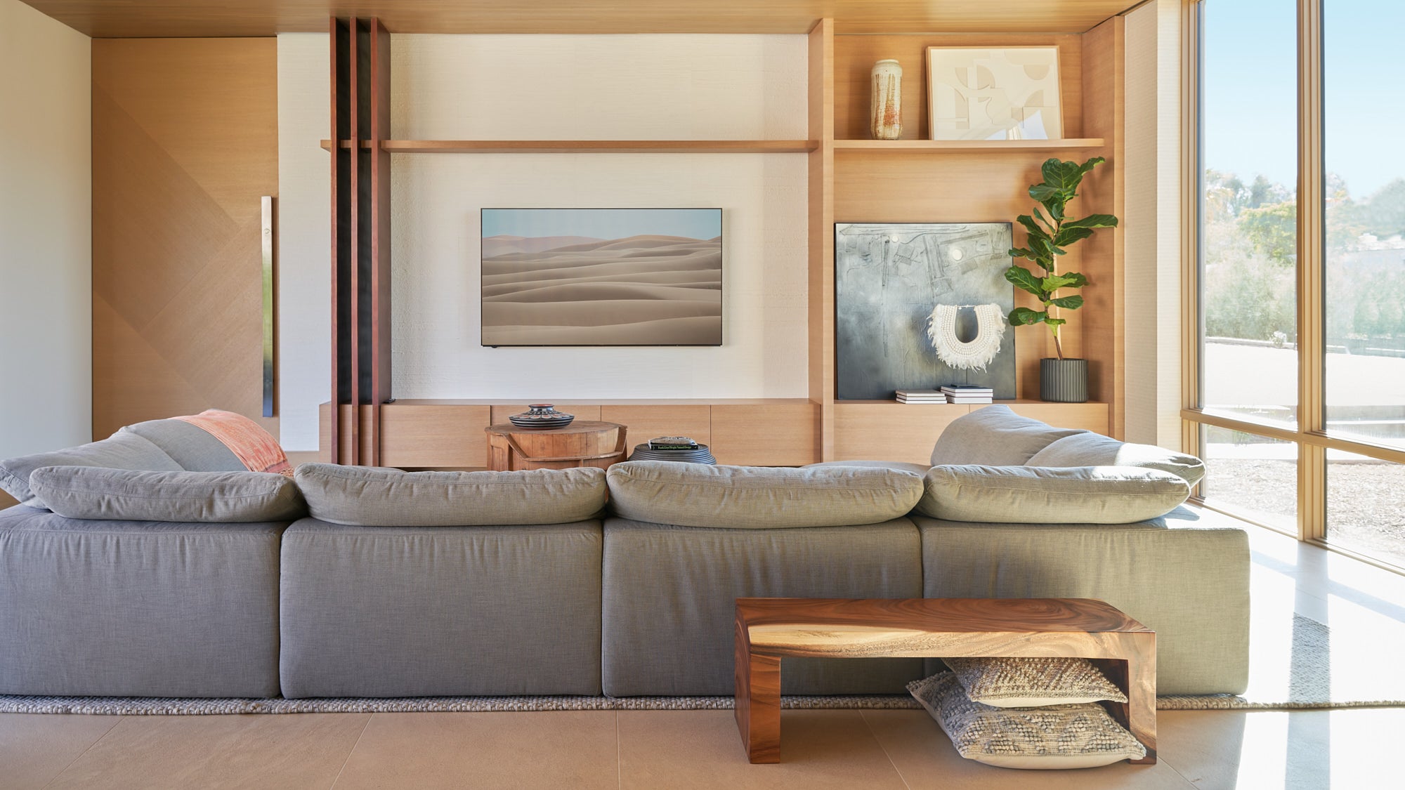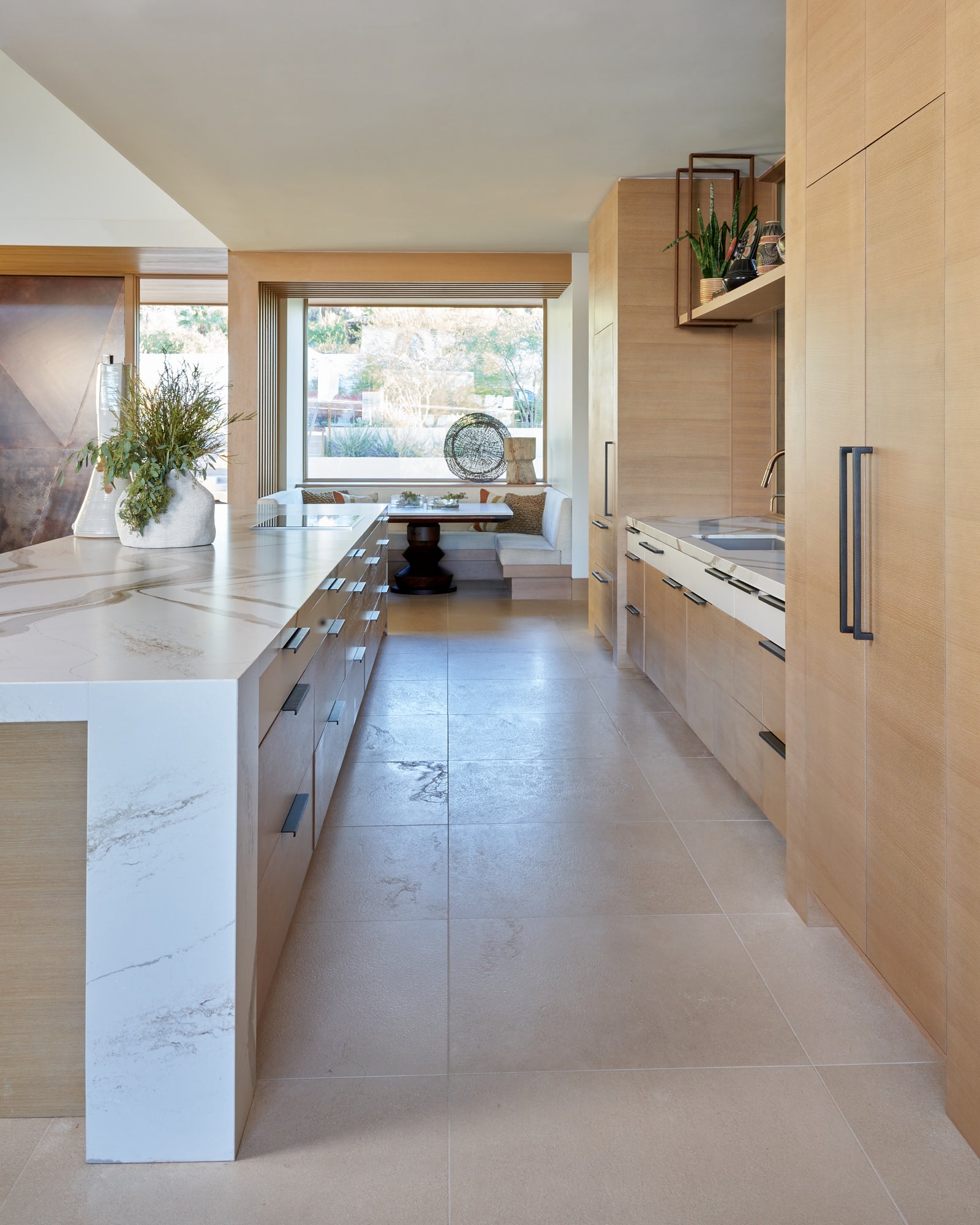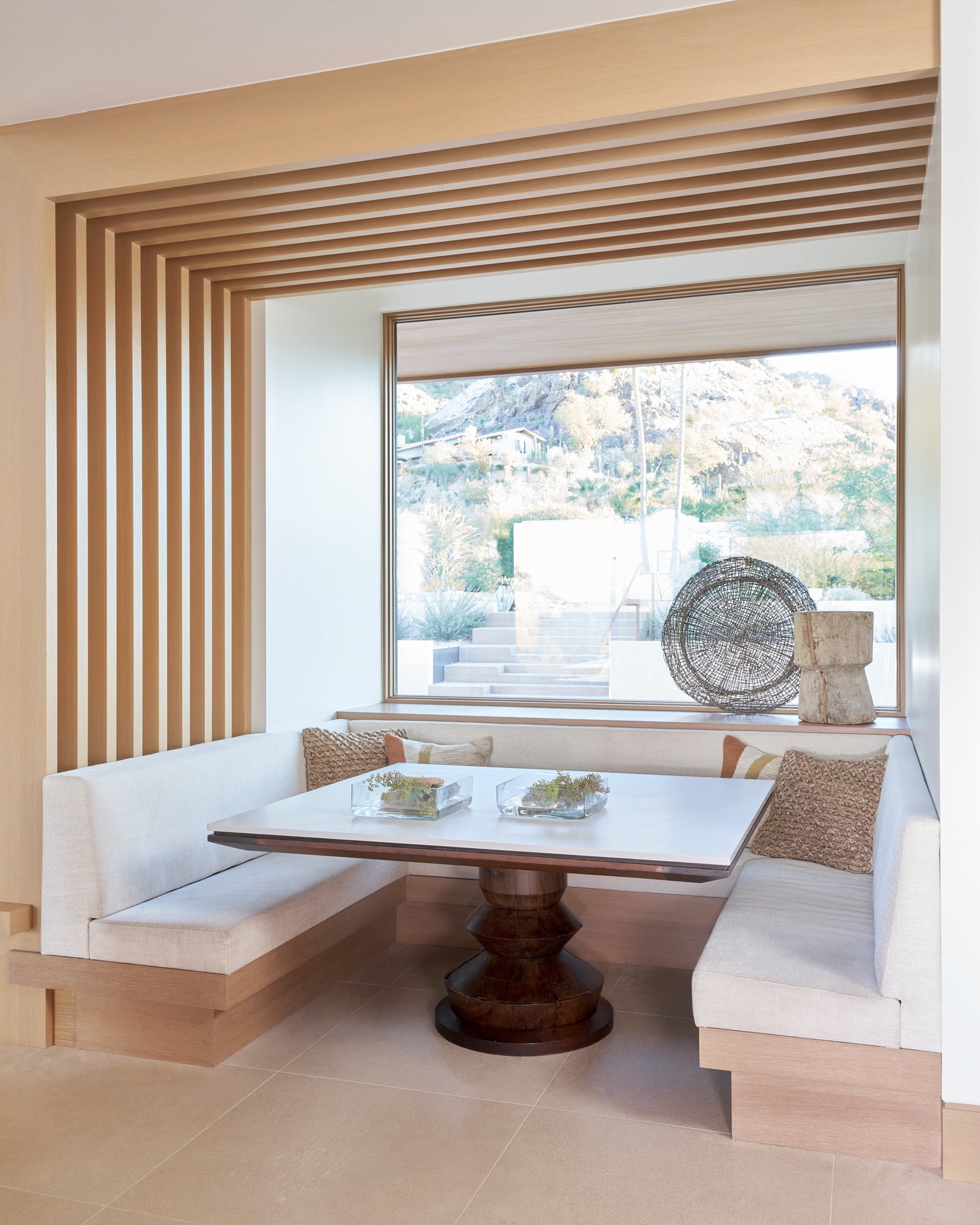 To honor the concept of “dwelling” and the owner’s Guatemalan roots, tribal and ethnic nods are used throughout the home’s furnishings such as textiles, pottery, and even carved Mayan masks. Modern Italian pieces are mixed with vintage finds, such as the 1960’s cognac leather Brazilian lounge chairs. The Great Room is grounded by a bespoke white oak coffee table designed by the designer as a one of a kind is inspired by canyon wall strata layers, it adds organic movement to soften the space.