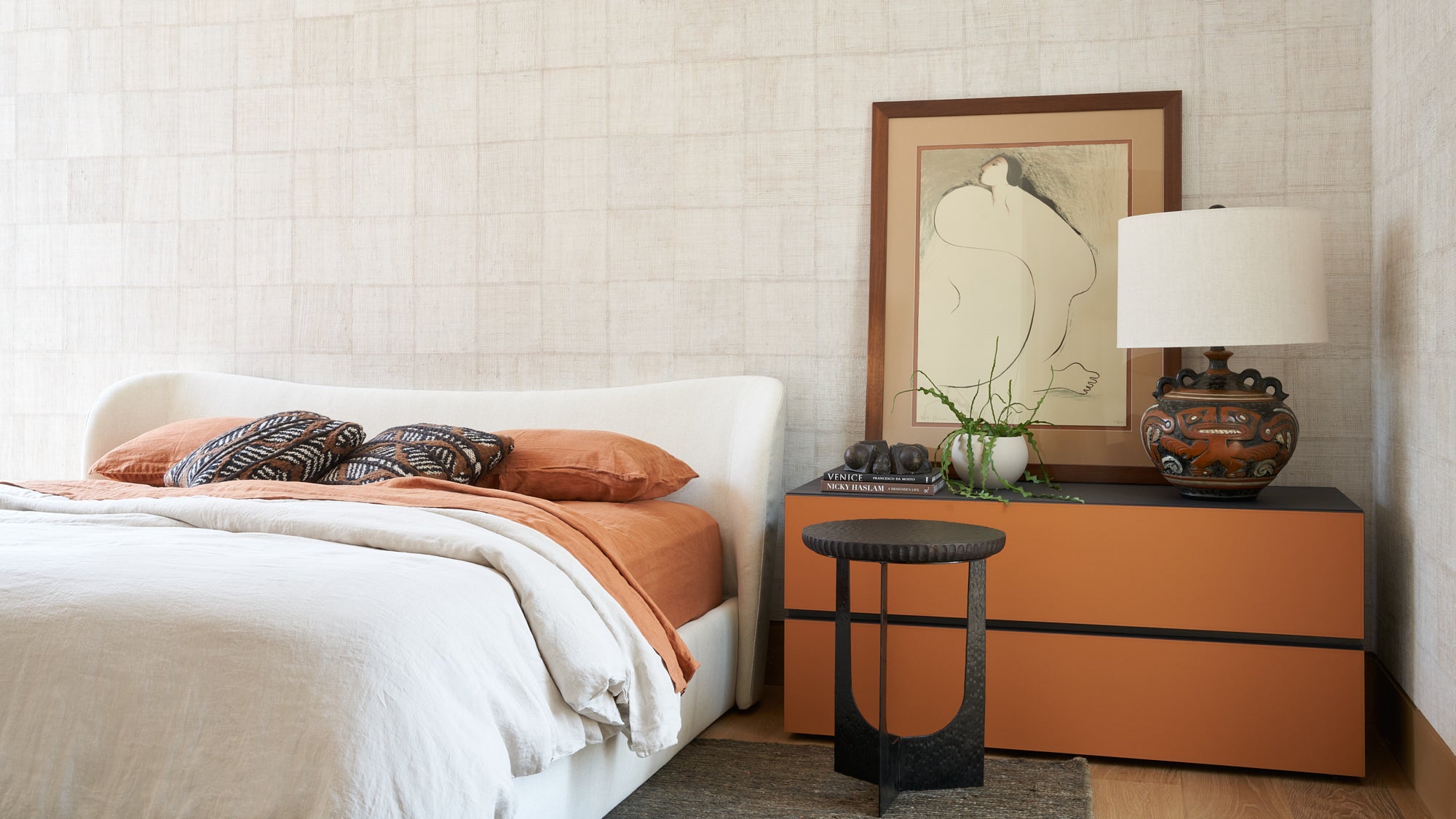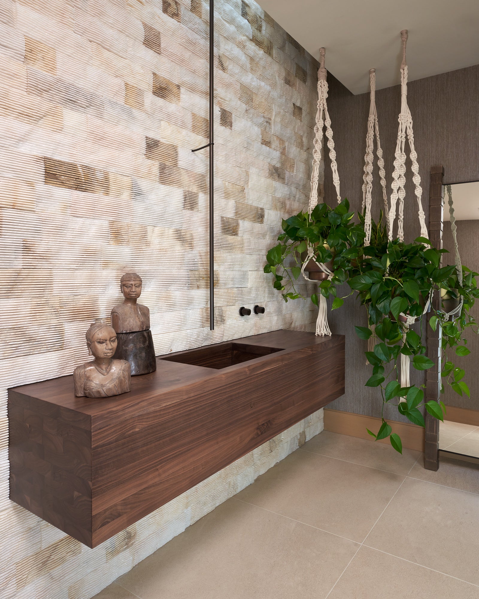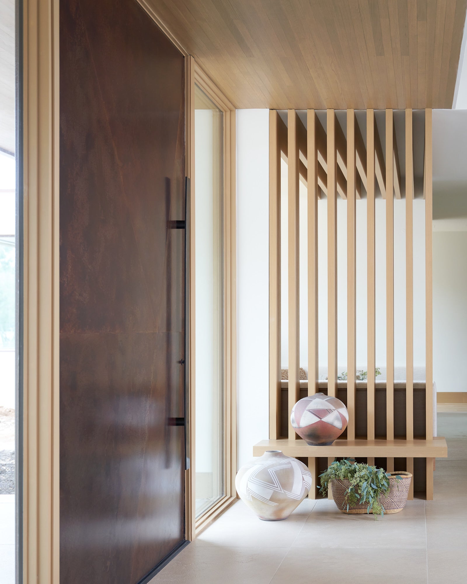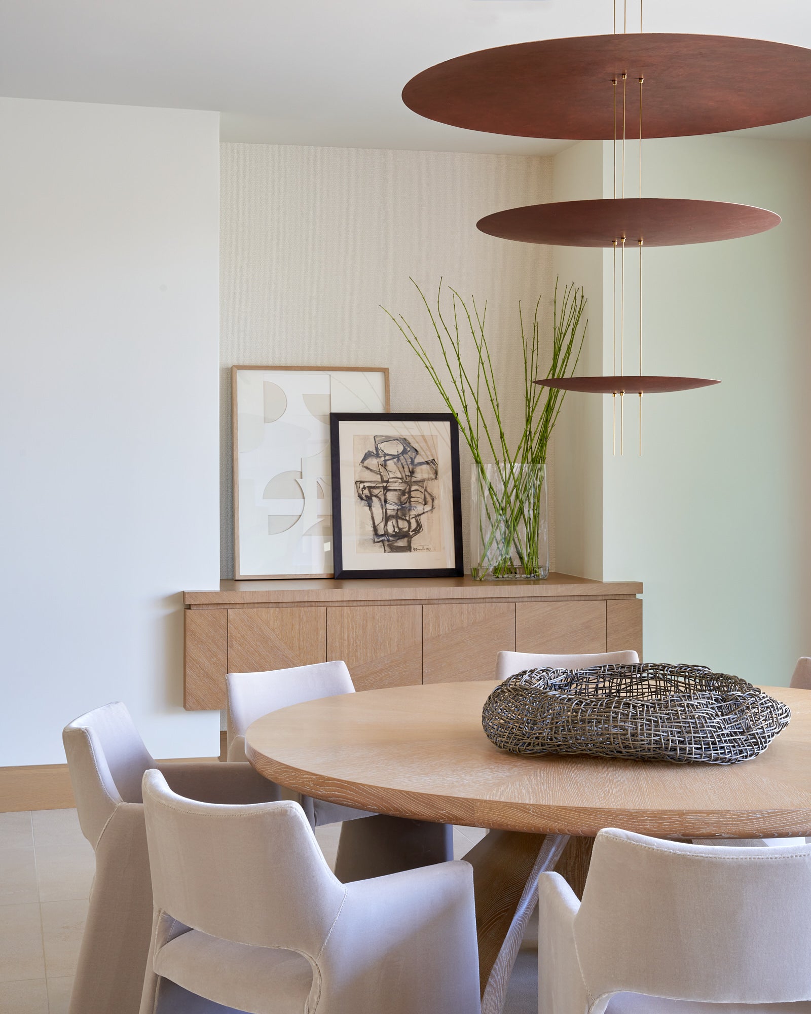 To honor the concept of “dwelling” and the owner’s Guatemalan roots, tribal and ethnic nods are used throughout the home’s furnishings such as textiles, pottery, and even carved Mayan masks. Modern Italian pieces are mixed with vintage finds, such as the 1960’s cognac leather Brazilian lounge chairs. The Great Room is grounded by a bespoke white oak coffee table designed by the designer as a one of a kind is inspired by canyon wall strata layers, it adds organic movement to soften the space.