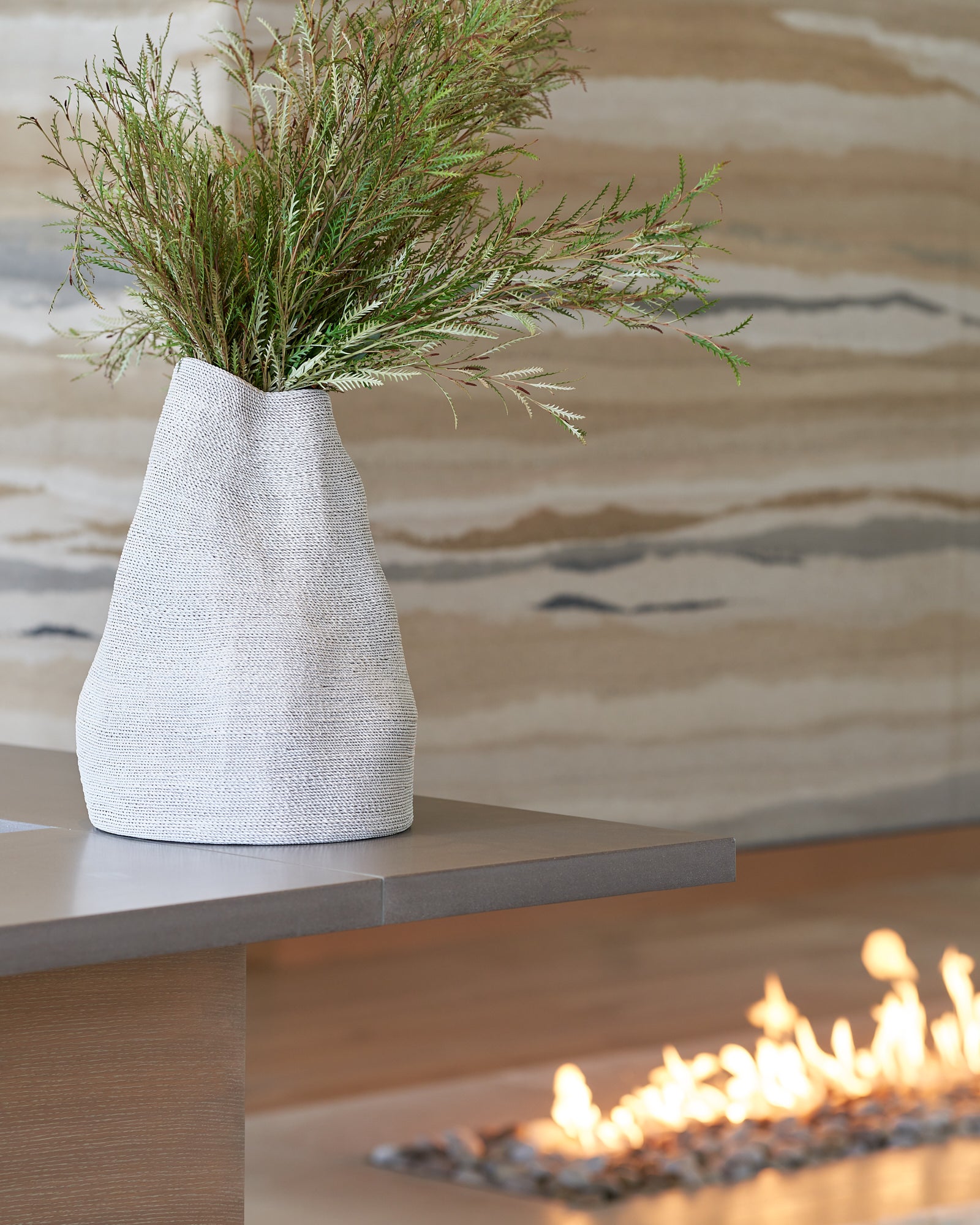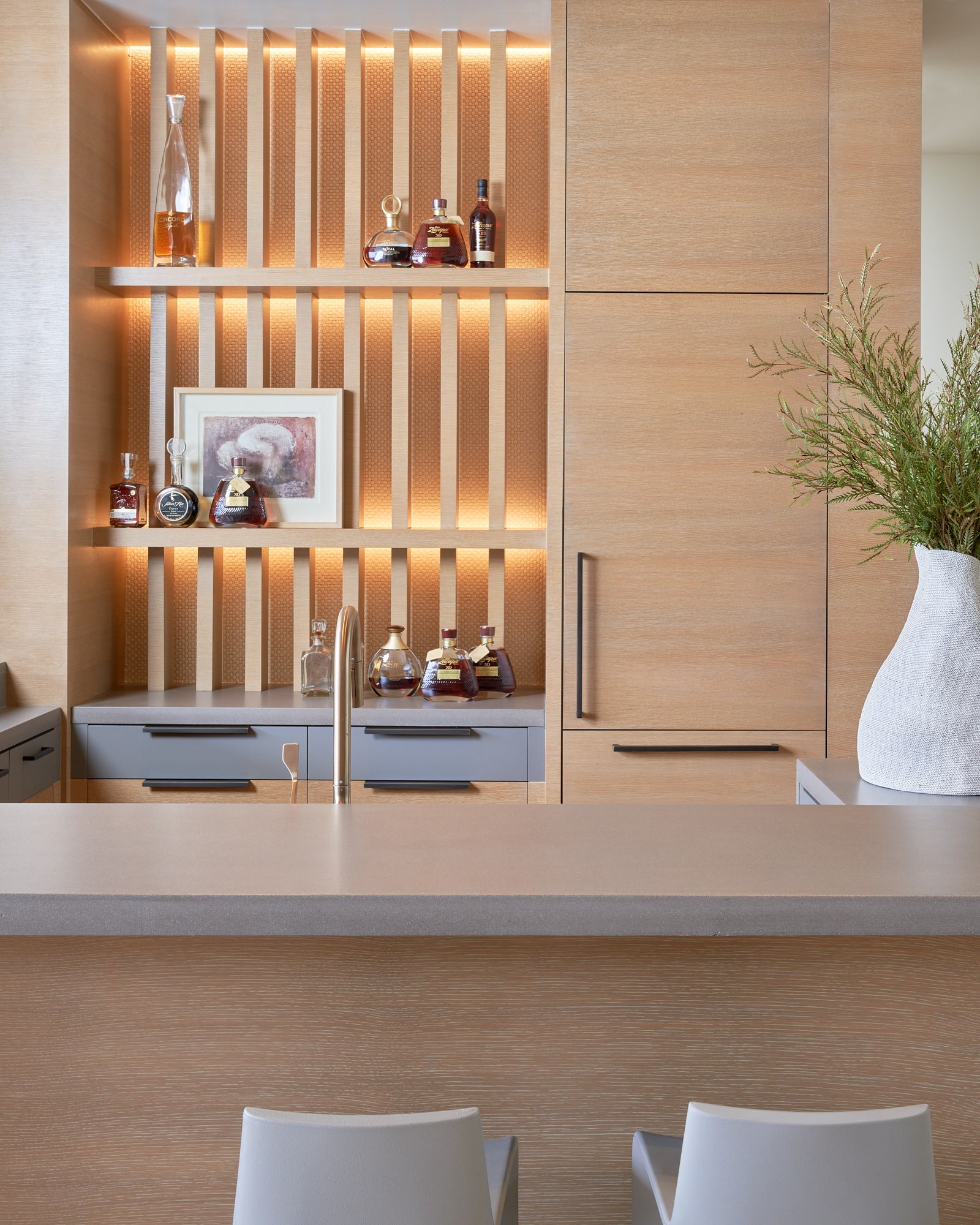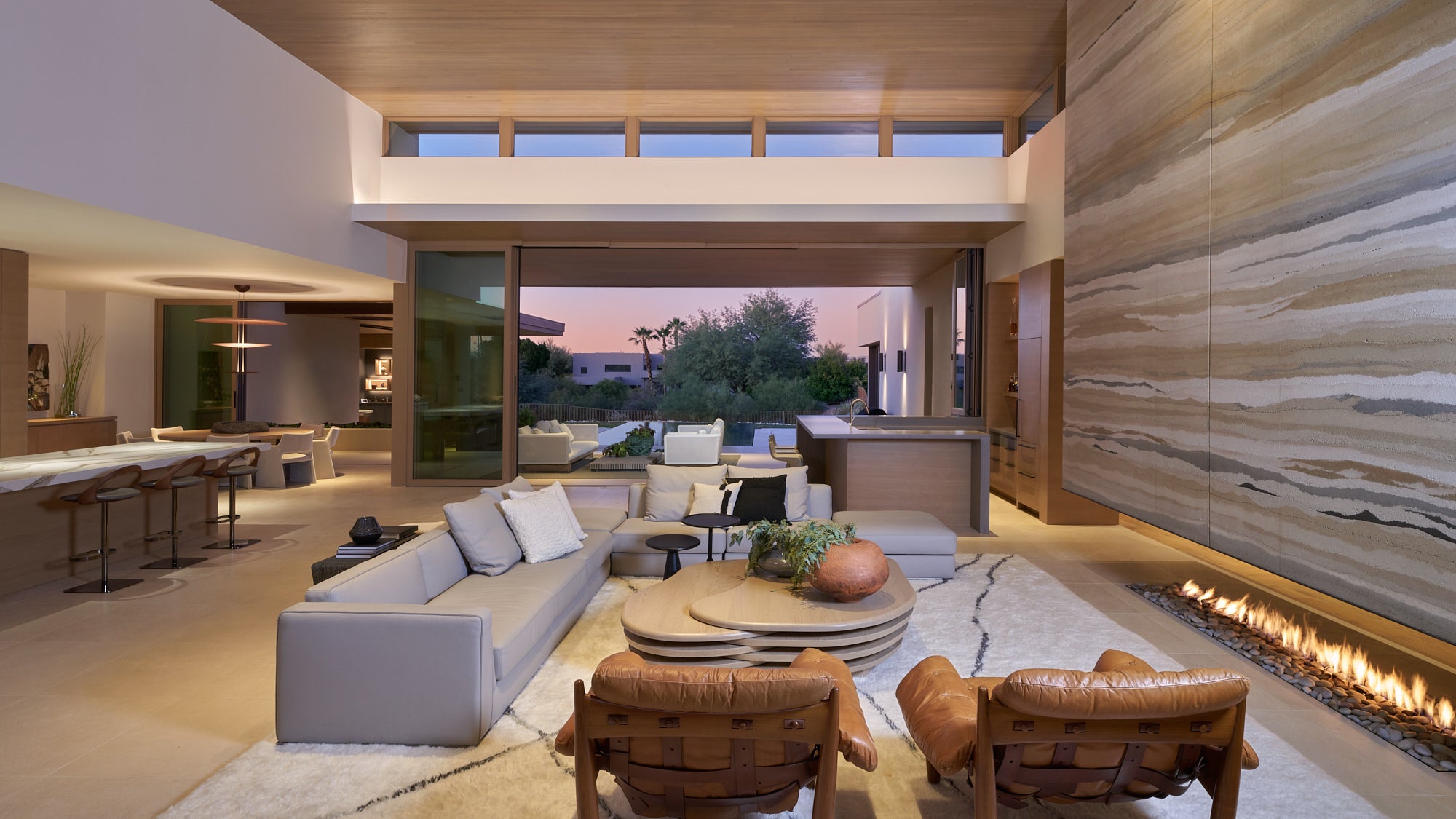The Design Team captured the client’s needs and dreams by combining the elements of the desert landscape to sculpt the interior with authentic materials, rammed earth fireplace features, ceruse oak millwork, raffia wall textures, pigmented formed concrete, and leathered limestone flooring. The color palette and materiality of the home would be based in neutrals that would play back and forth with tension in cool and warm tones while also including textural interest.