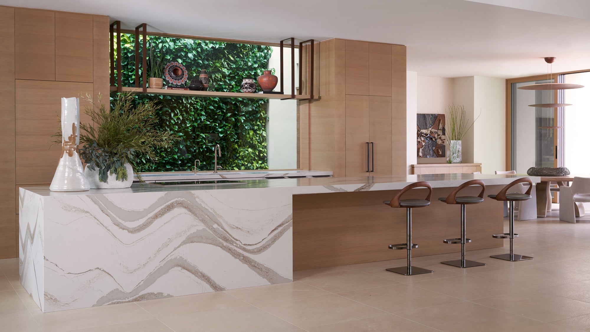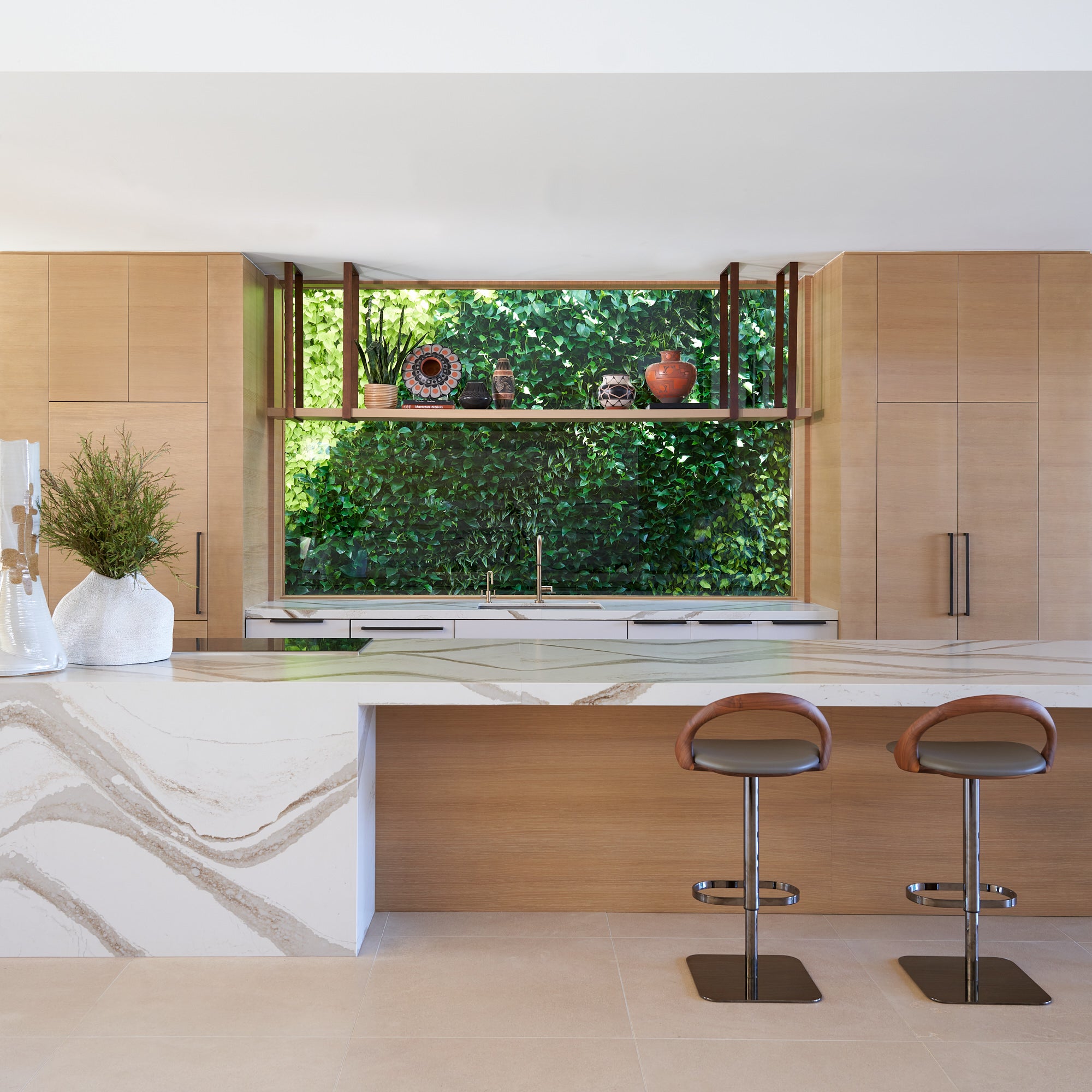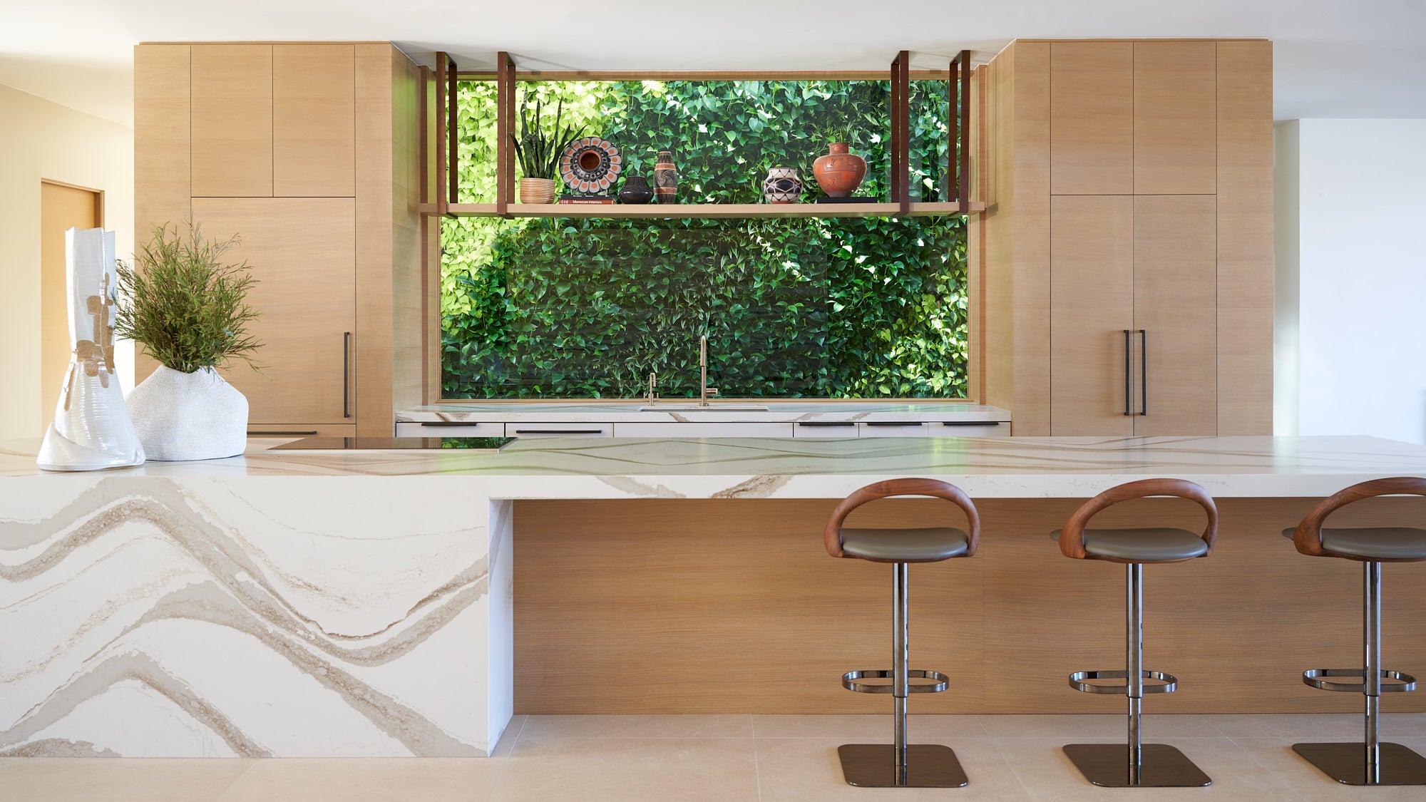 The sleek oak paneled integrated kitchen is designed around a unique feature, a solarium that provides fresh year around herbs and greens for a healthy lifestyle.
