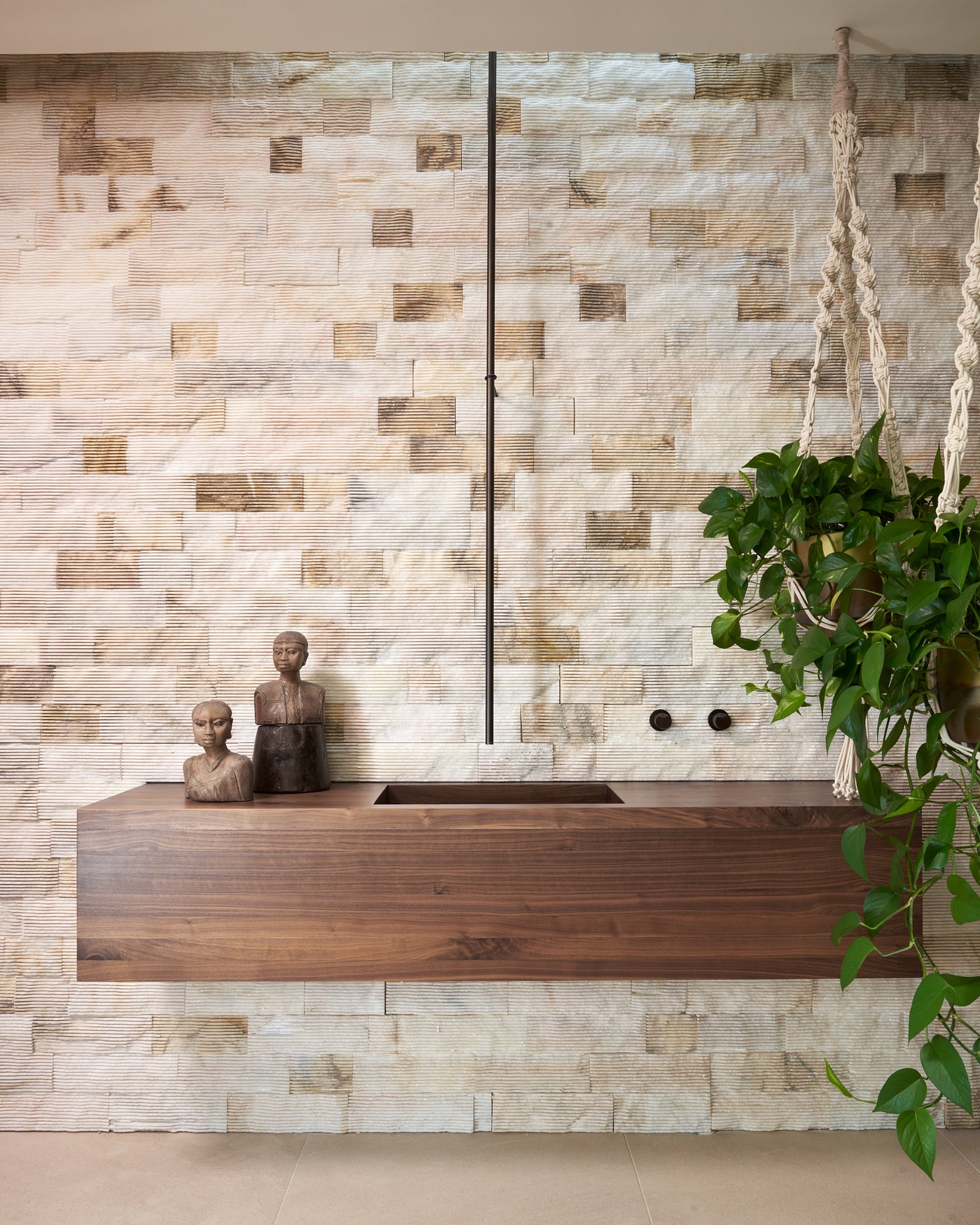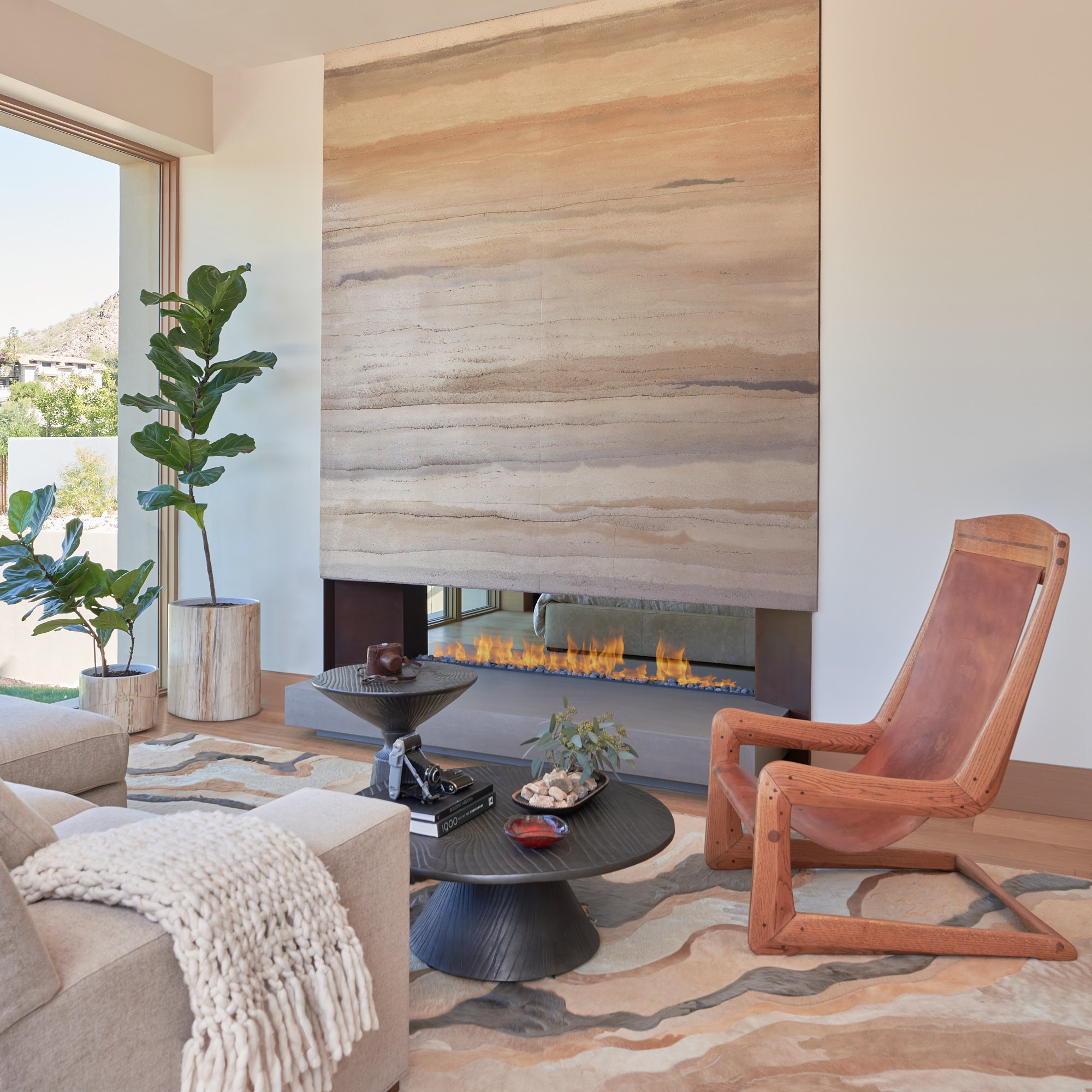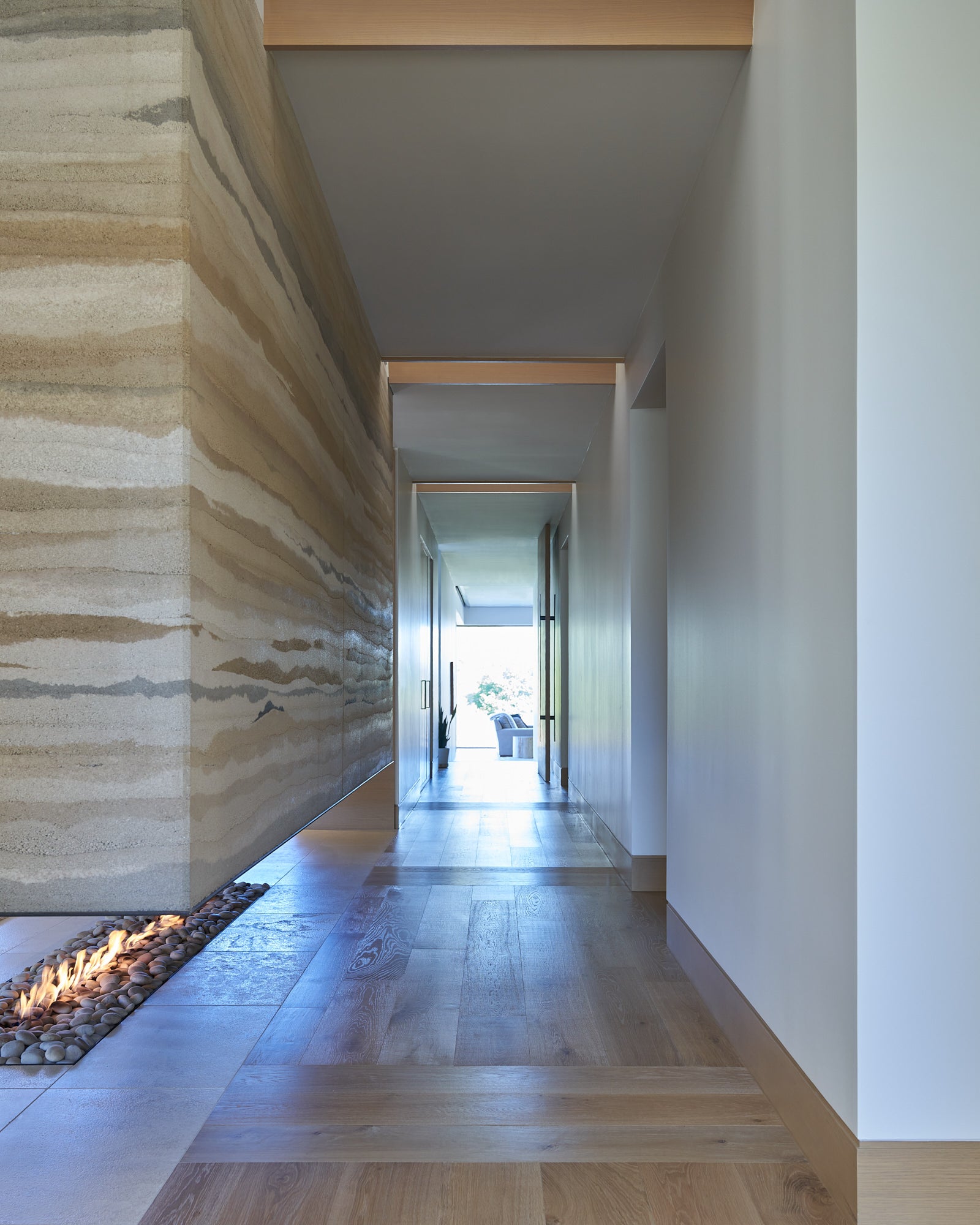 The suspended fireplace of the Great Room and the Primary Bedroom’s double-side fireplace are clad in rammed earth using pigmented dirt pounded in a form.