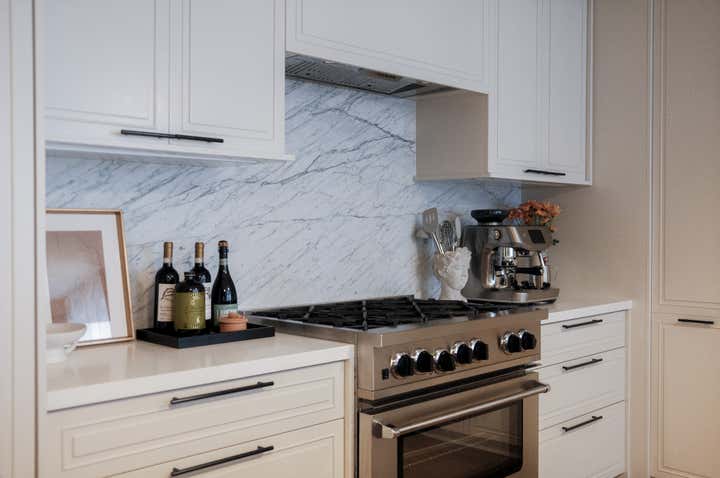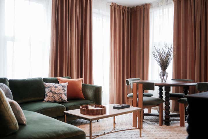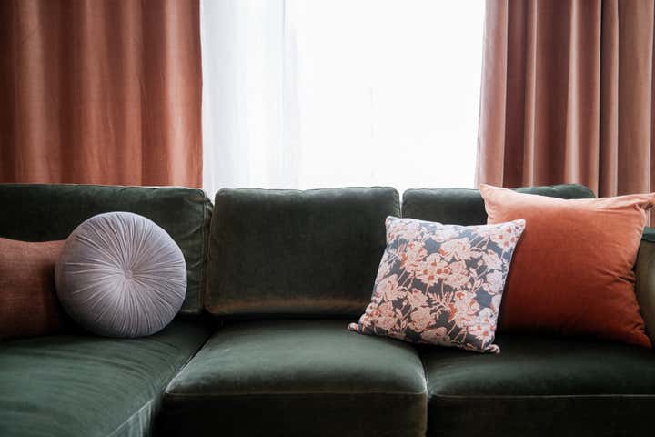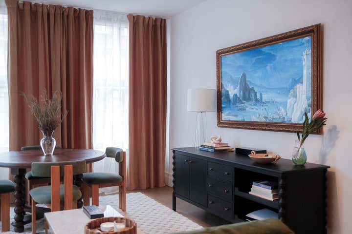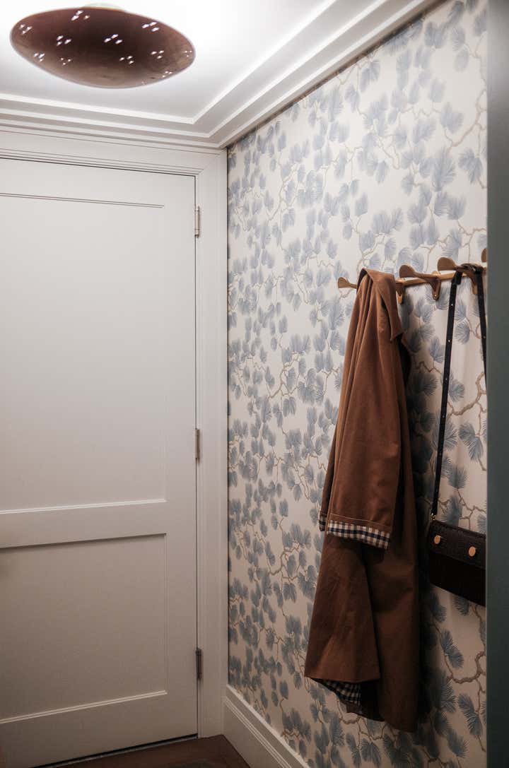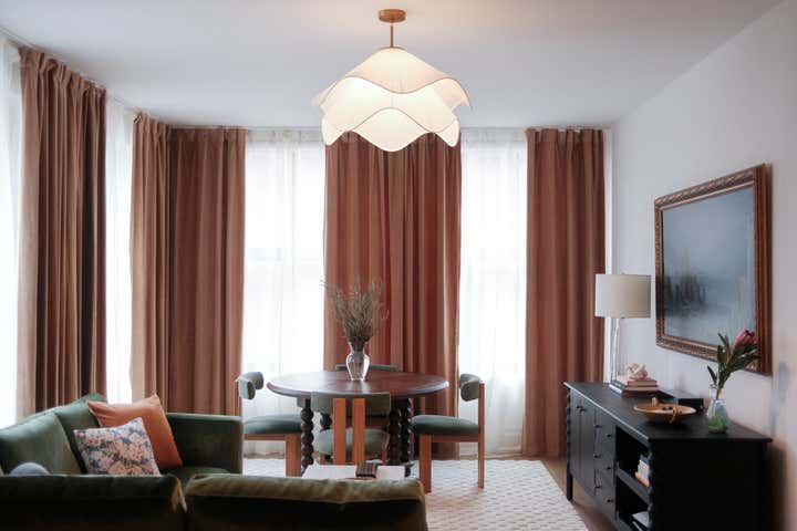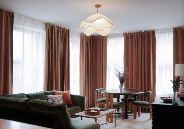 A blank canvas, new build condo located in a high rise in Downtown Brooklyn. Layers of limewash, linen, velvet, floral wallpaper, and softer diffused lighting gave life and warmth to the space.