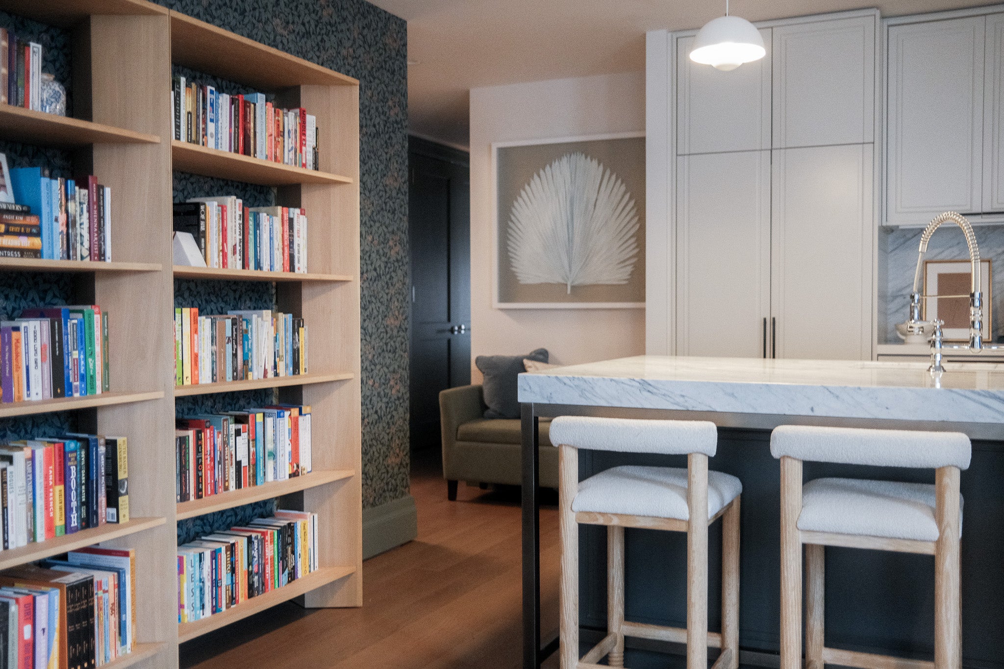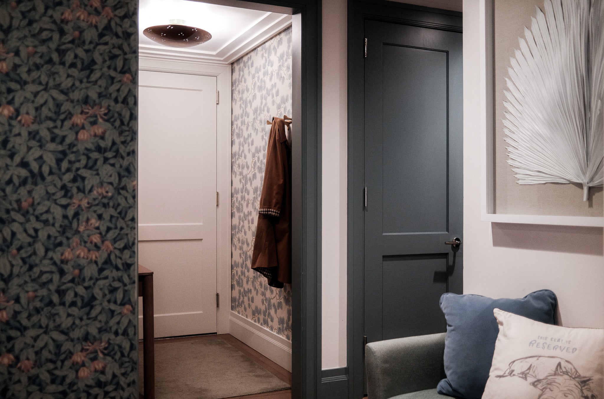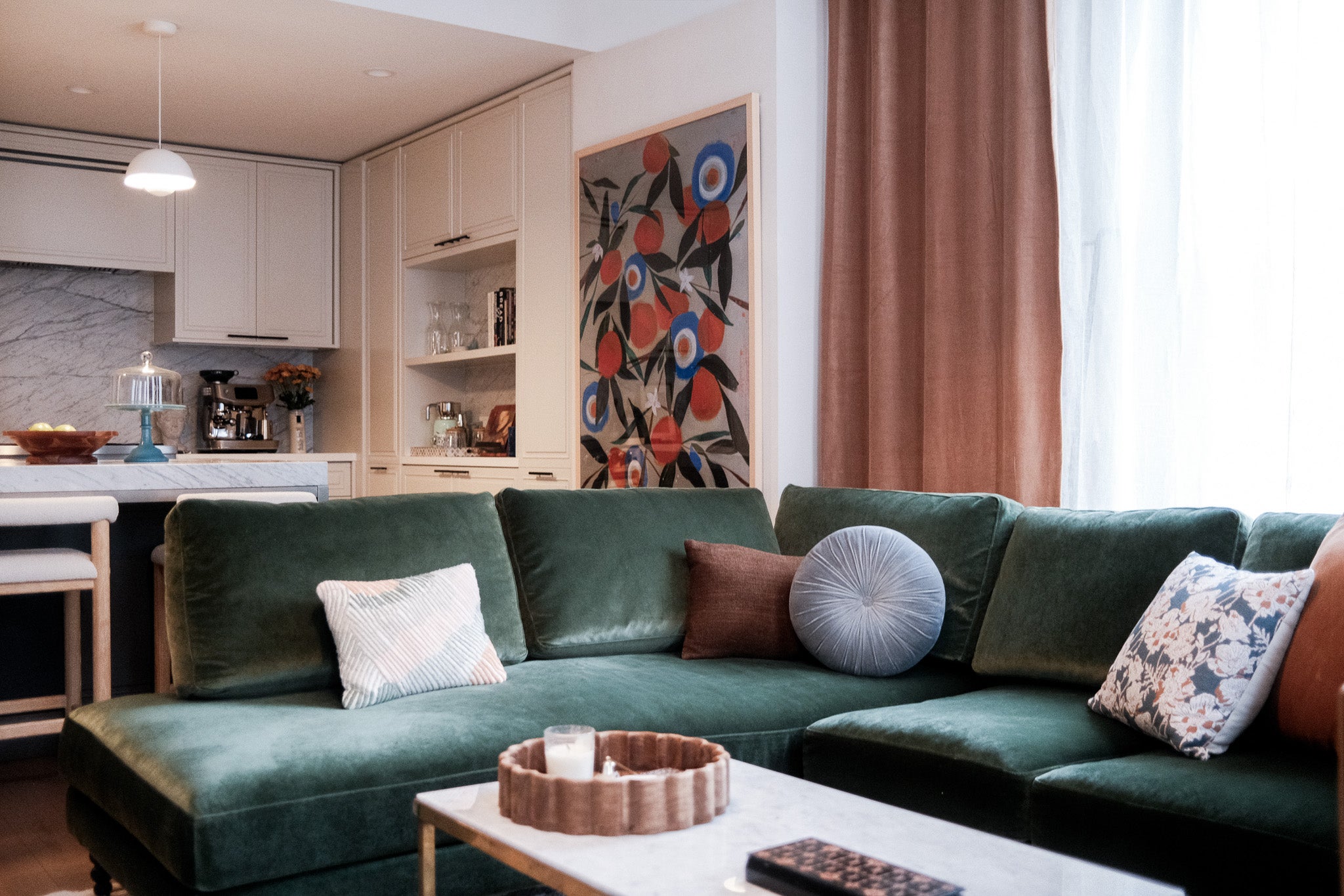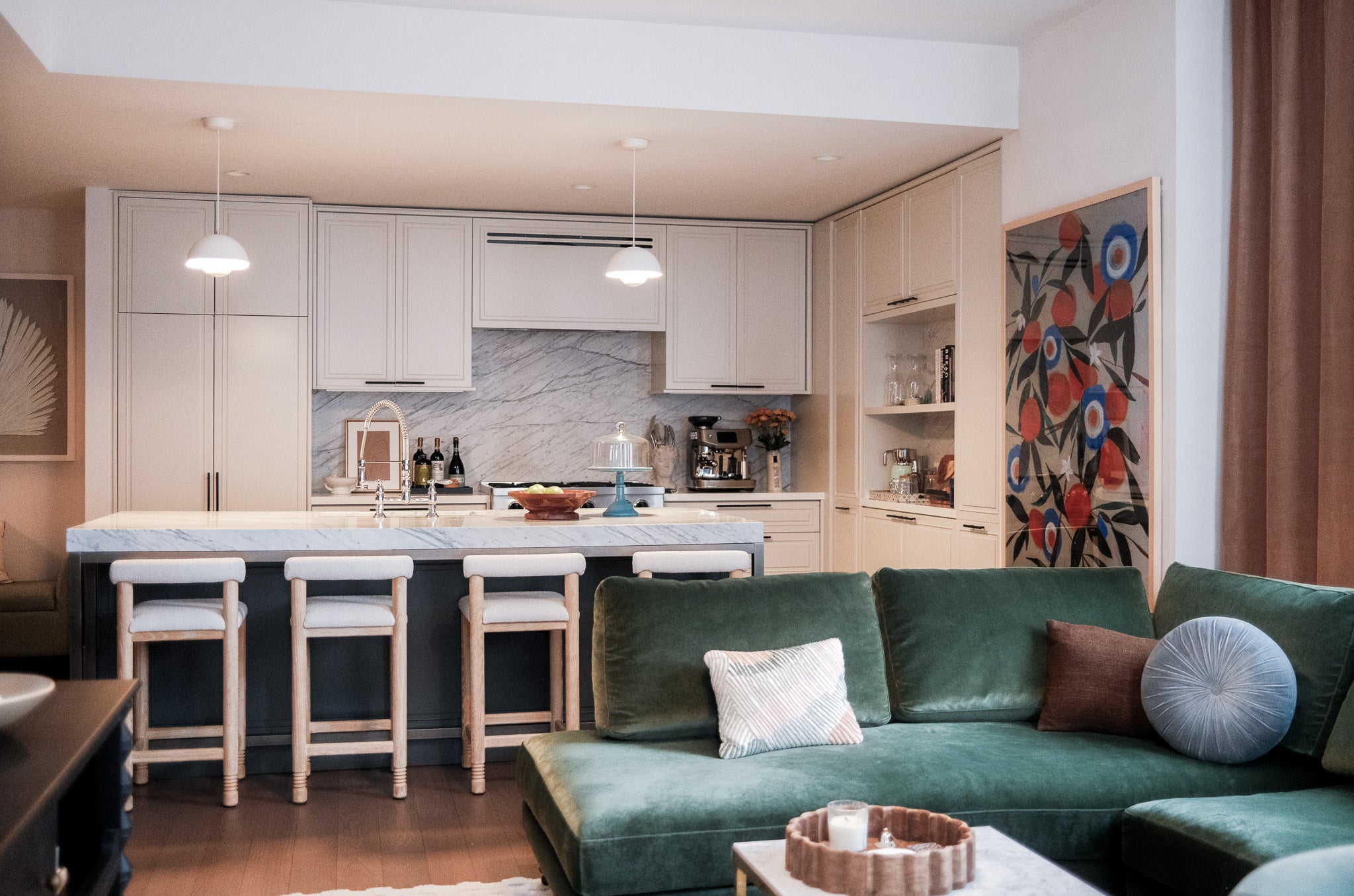 A blank canvas, new build condo located in a high rise in Downtown Brooklyn. Layers of limewash, linen, velvet, floral wallpaper, and softer diffused lighting gave life and warmth to the space.