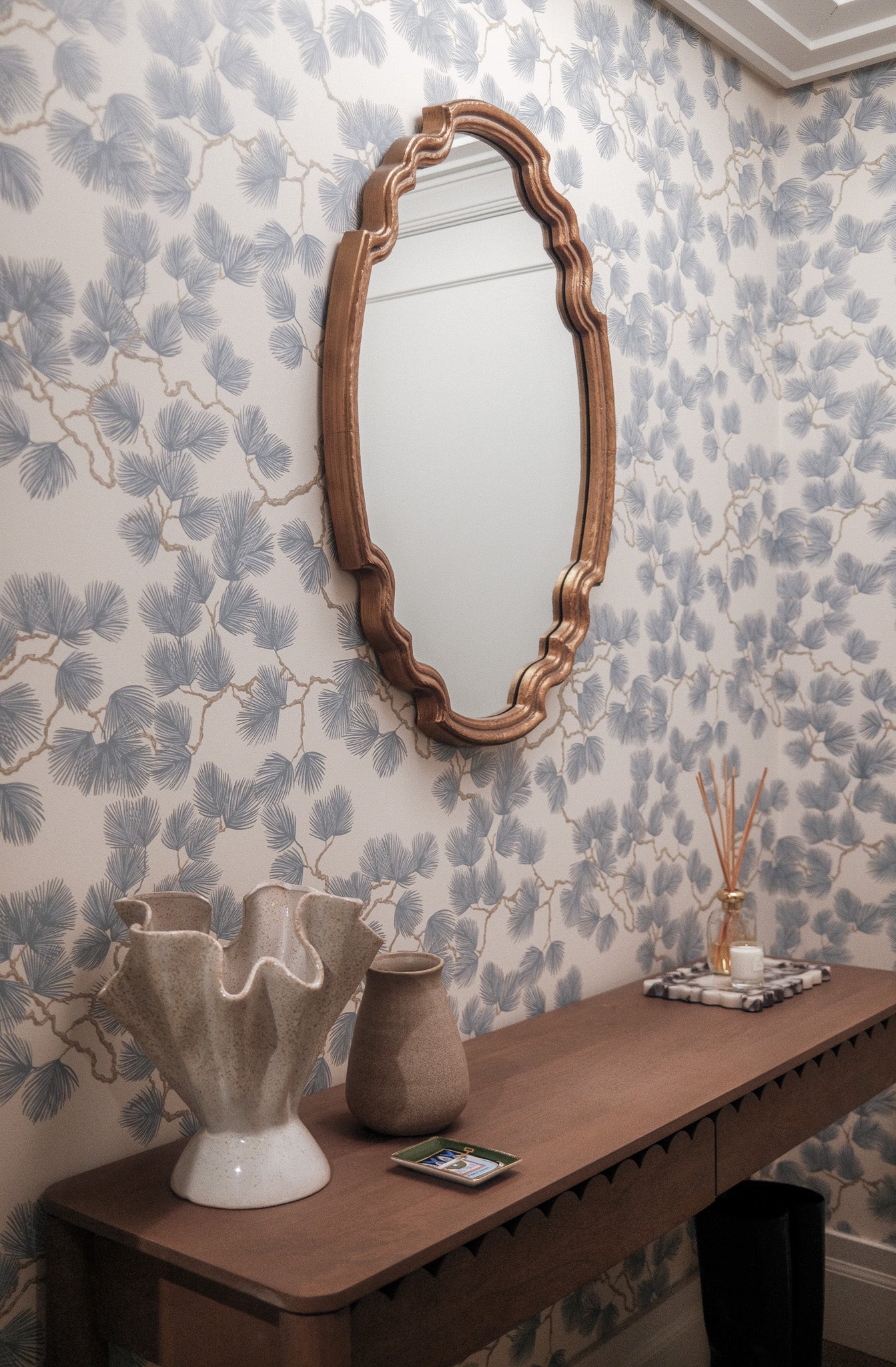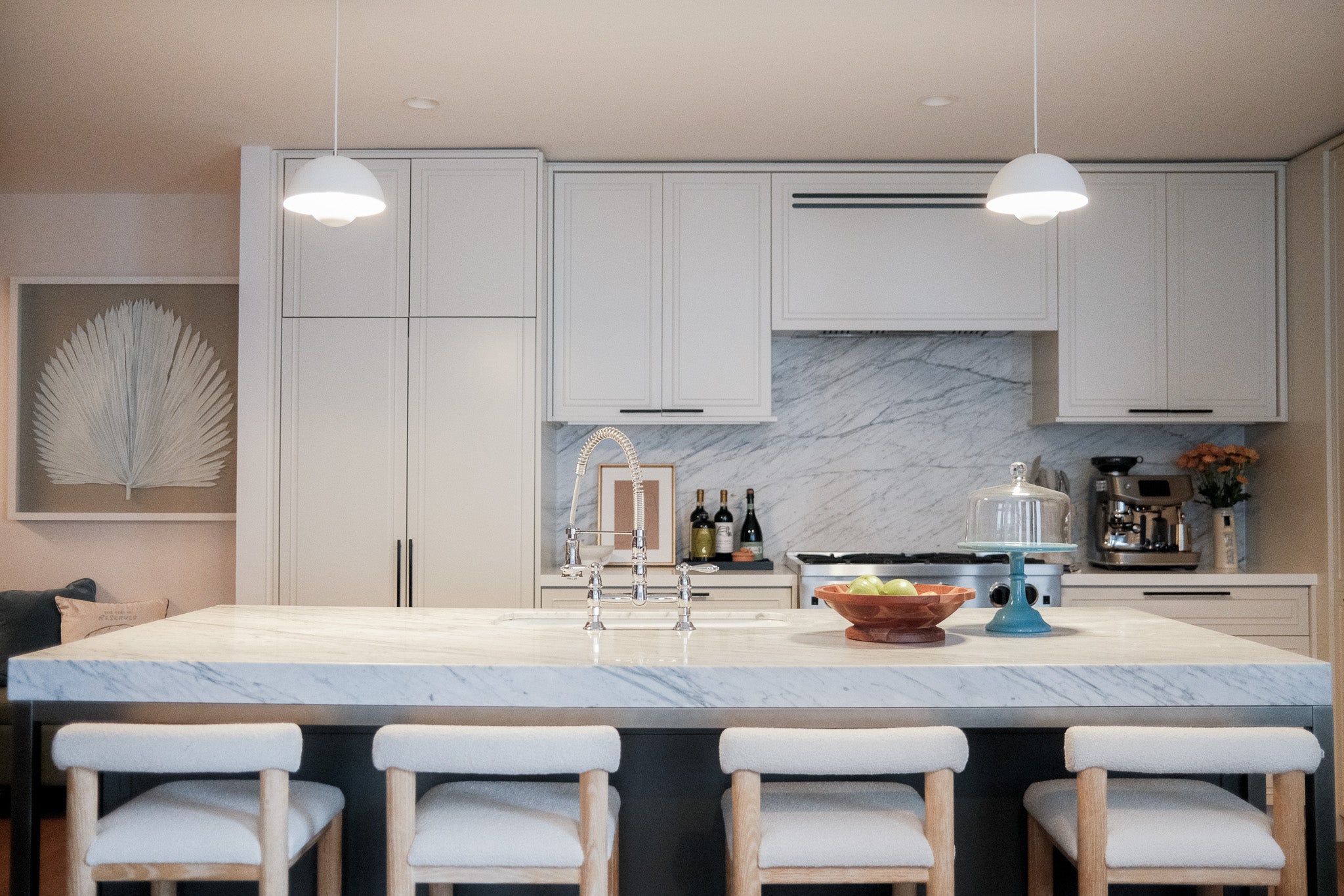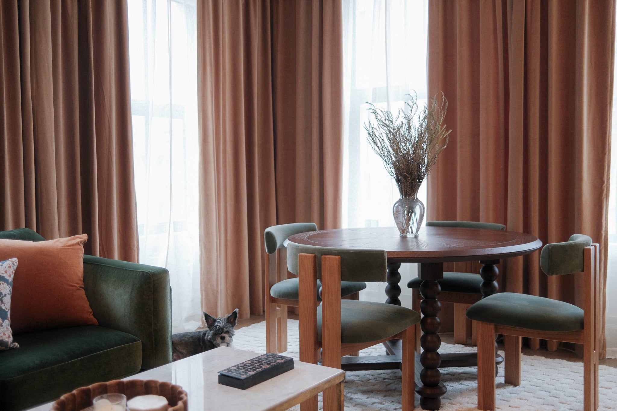 A blank canvas, new build condo located in a high rise in Downtown Brooklyn. Layers of limewash, linen, velvet, floral wallpaper, and softer diffused lighting gave life and warmth to the space.