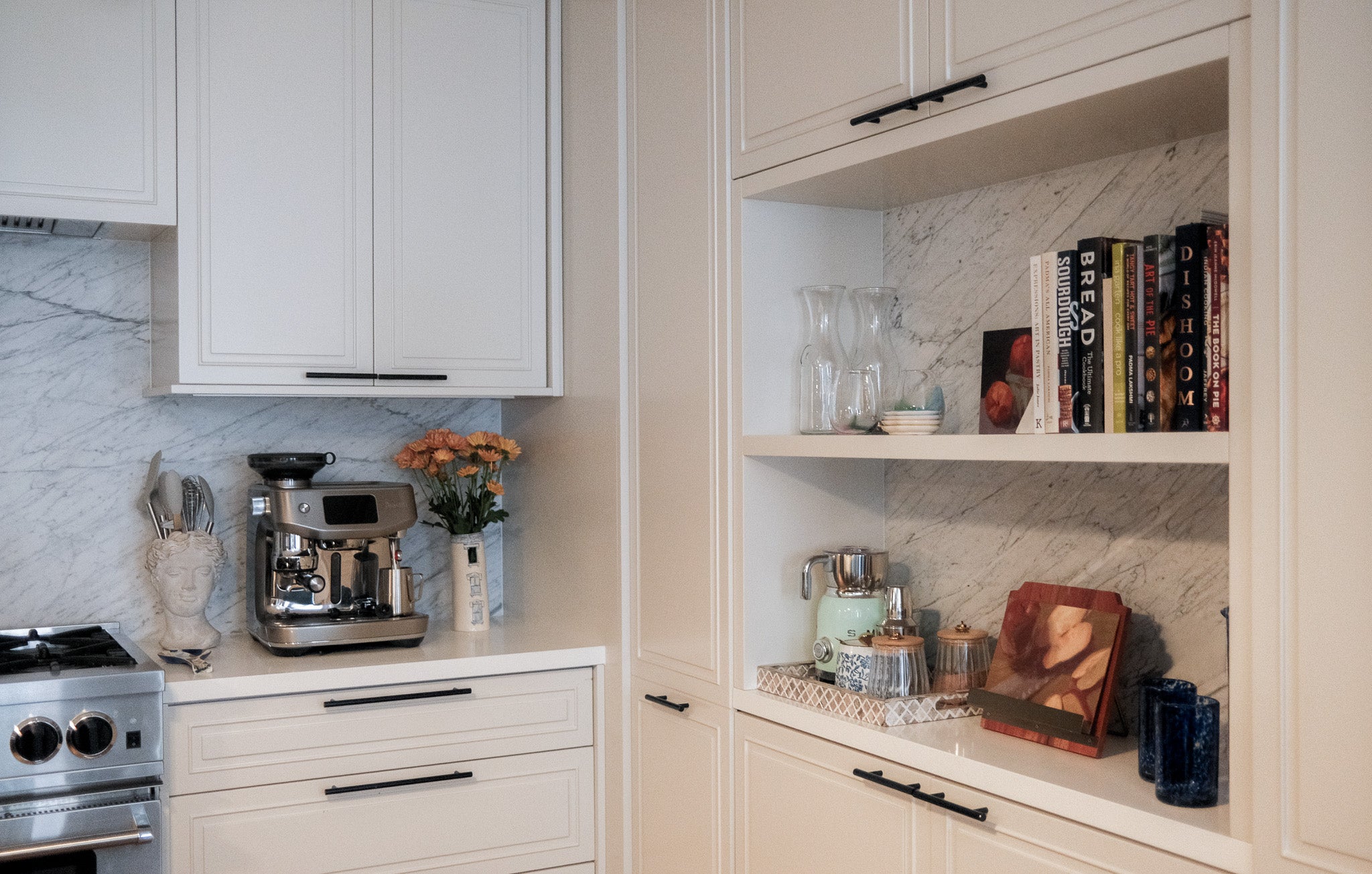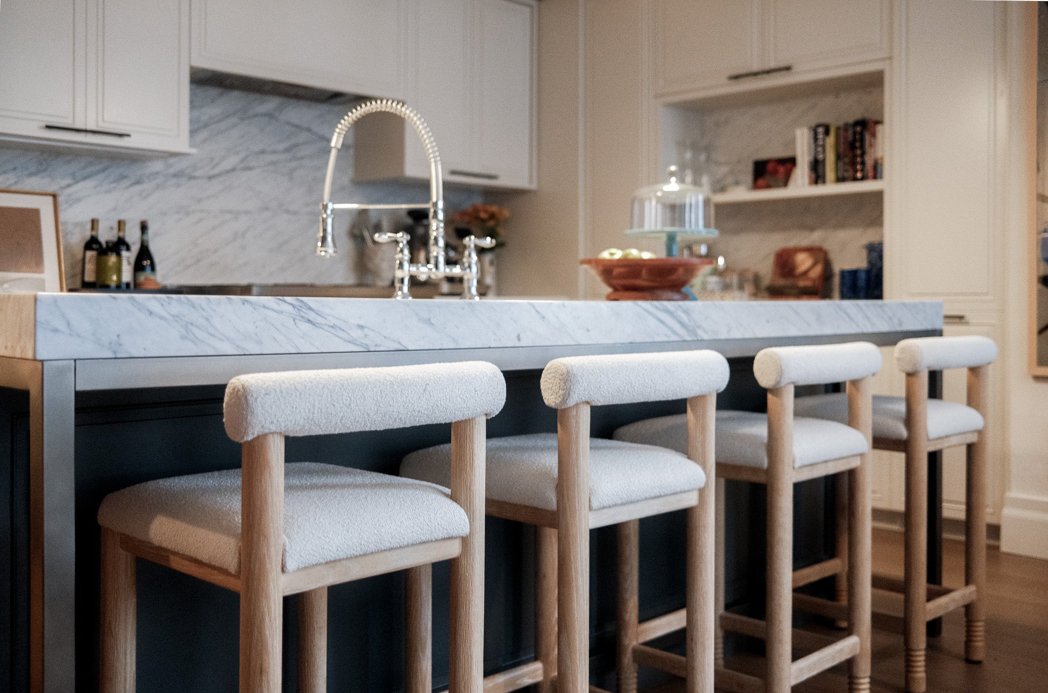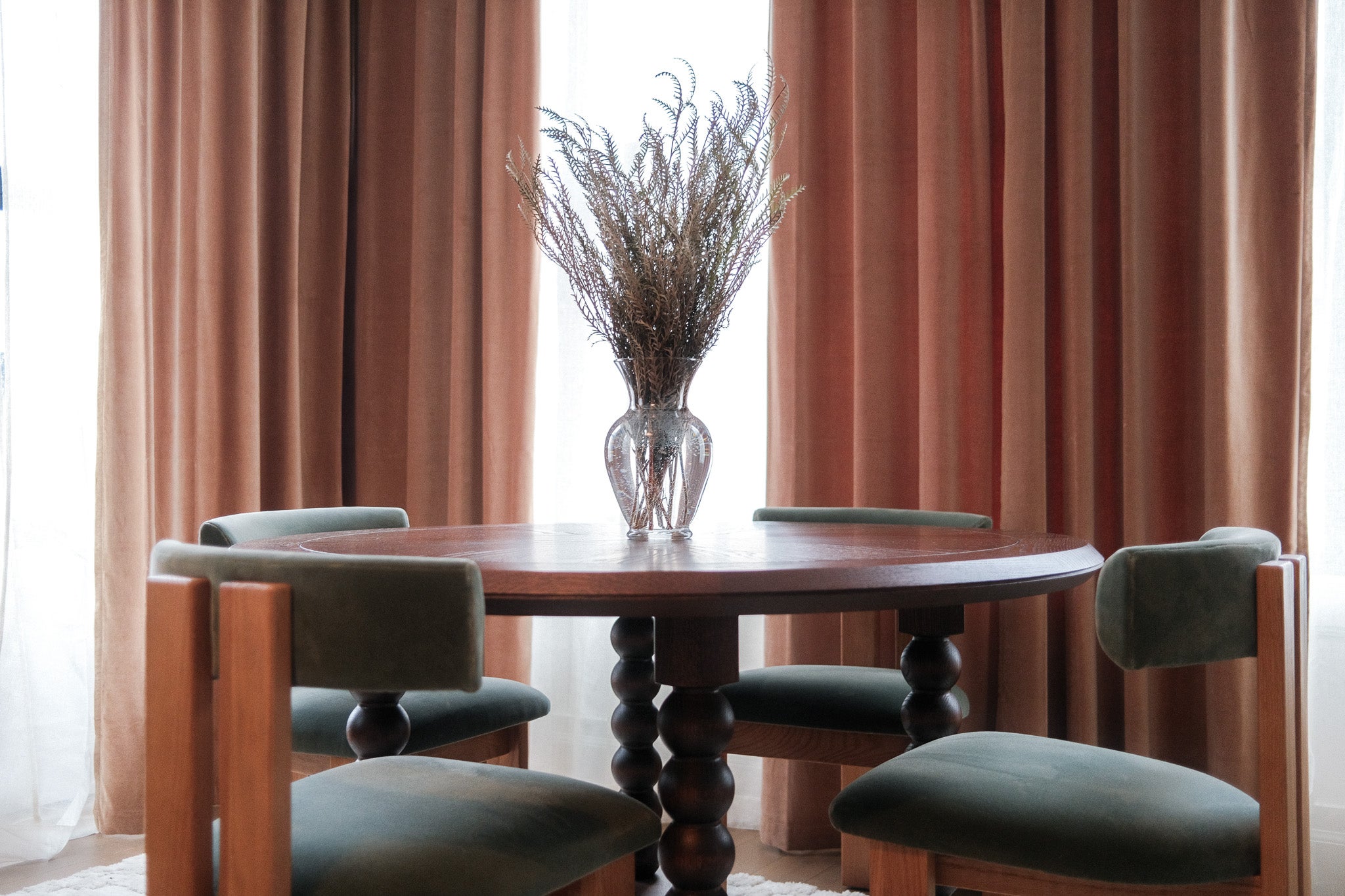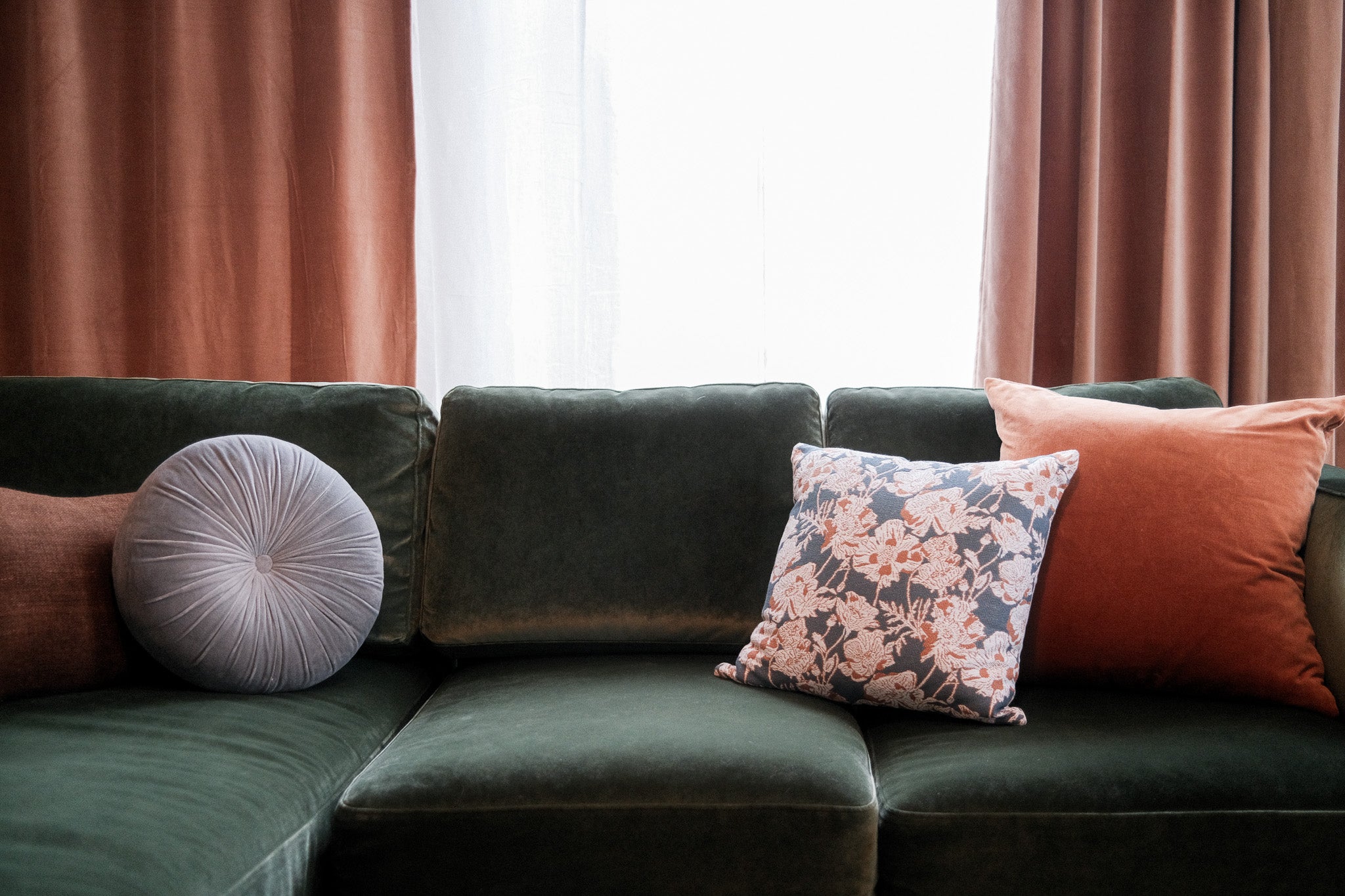 A blank canvas, new build condo located in a high rise in Downtown Brooklyn. Layers of limewash, linen, velvet, floral wallpaper, and softer diffused lighting gave life and warmth to the space.