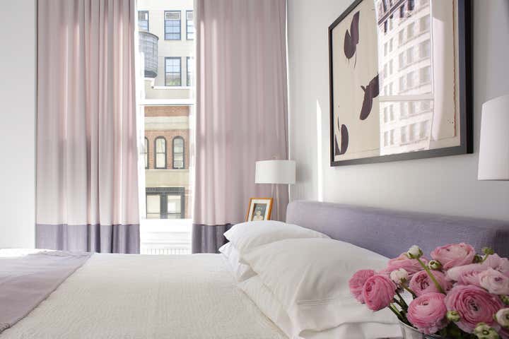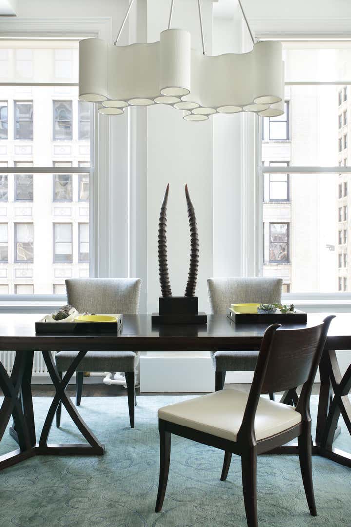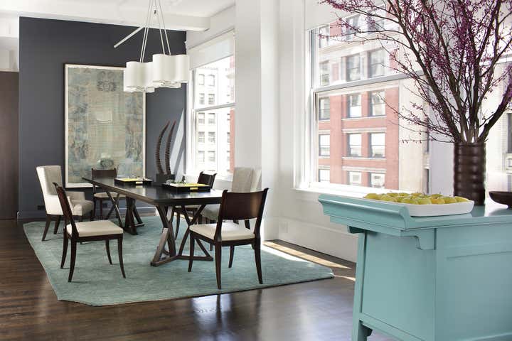A Flatiron District loft meant for dinner parties and family life, this simple space is given depth by intense but limited color. Deep blue tones work with turquoise furnishings and art to give a strong grounding to the many windows with their iconic Manhattan views.