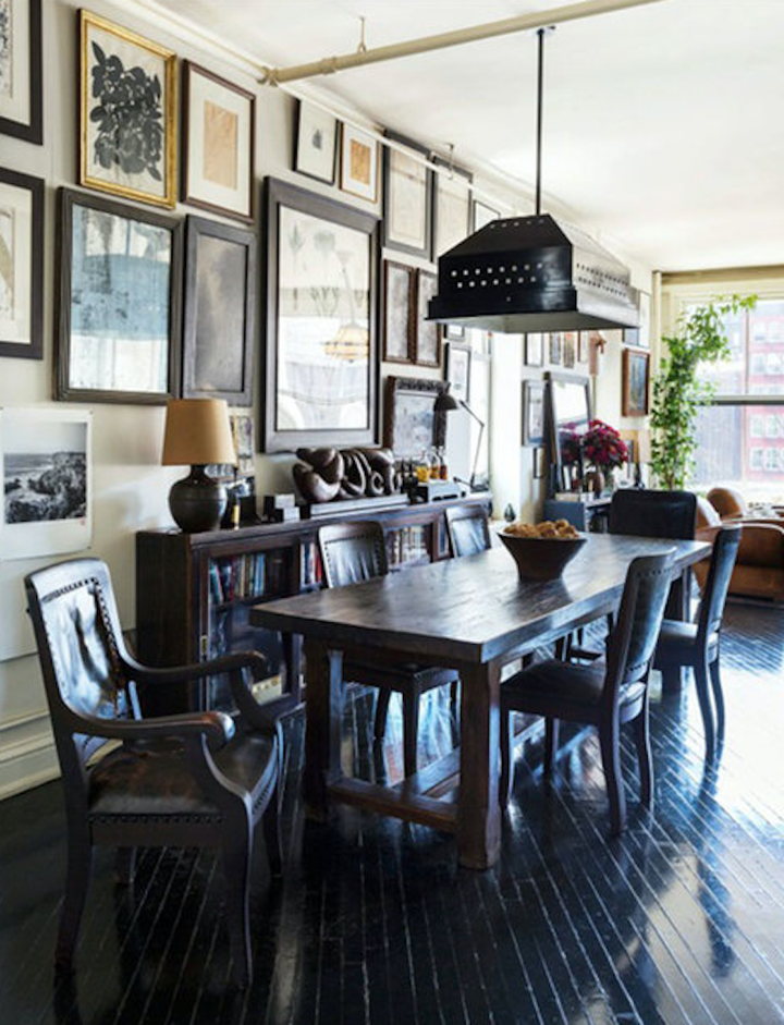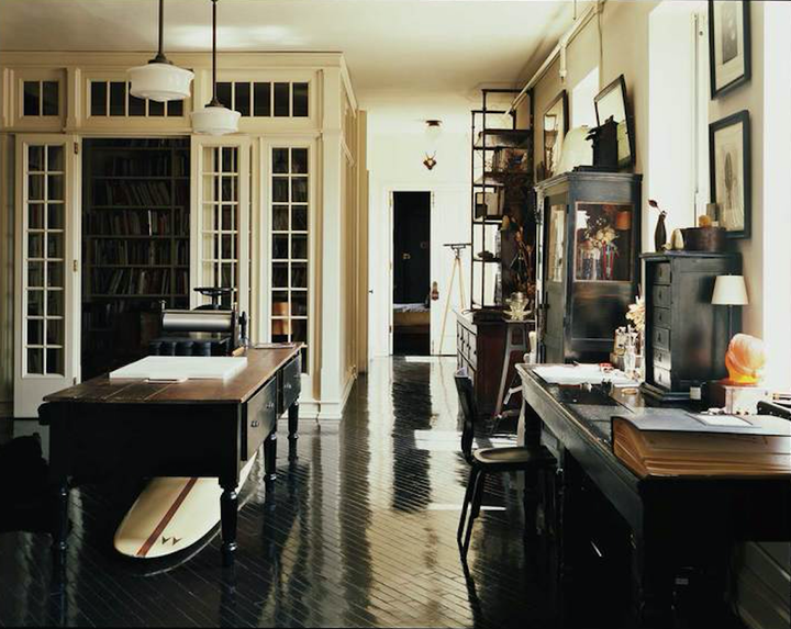 From its high-gloss black floors to its carefully constructed glass enclosed library, the loft stands as a hallmark Roman and Williams design, expressing the firm's commitment to the use of natural materials, expert craftsmanship, and vintage furnishings and objects. It is a perfect merging of their work and life and represents their inimitable style.