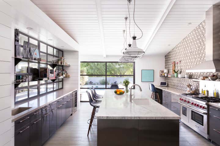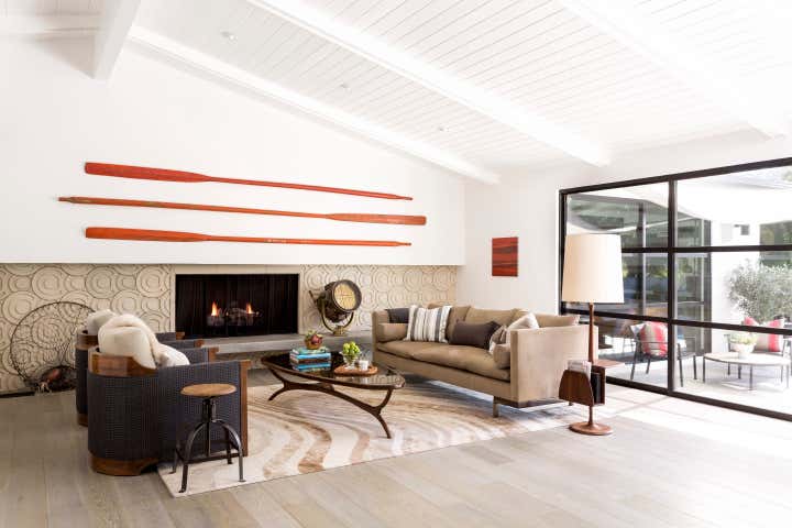When it came to their own 1960s ranch-style Los Angeles home, while Ryan Brown and Diego Monchamp wanted to retain its character, they were keen on modernizing. They tore out low ceilings, opened rooms and put in vaulted wood ceilings - and then they created a floor plan to accommodate furniture they had bought locally as well as finds from trips around the world, including their 13-foot teak farm table and antique teak and leather Hans Wegner chairs. Though the kitchen they had in mind was to end up being the heart of the home, they still wanted to separate it from the dining and living areas. The solution was to create a chic glass wall using vintage factory windows, which adds to the wow factor of the interiors. The living room, with the long vintage oars on the wall, antique nautical lamp Brown found in Amsterdam, fishnet and fish-shaped tile around the fireplace; and the floating wall that separates the master bedroom and bath add to the wow moments in this cool California house.