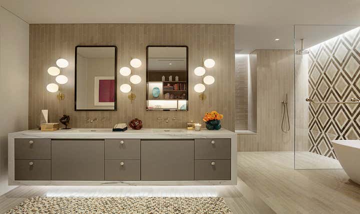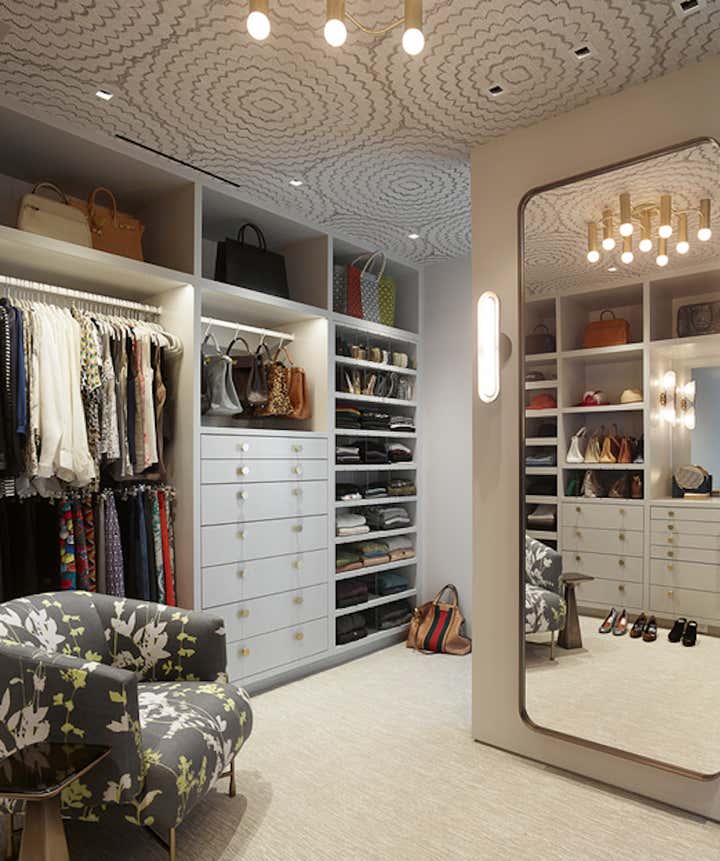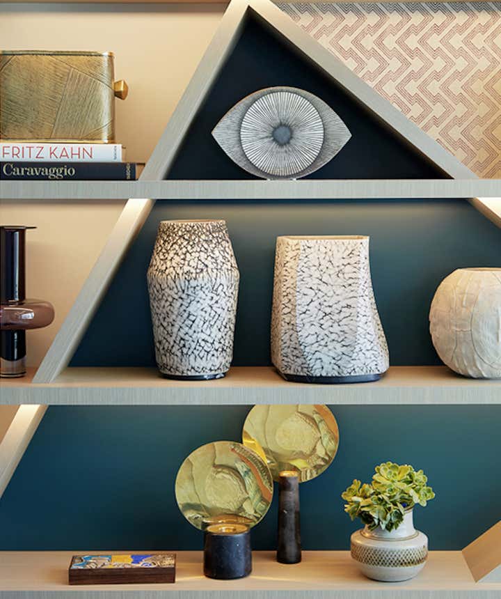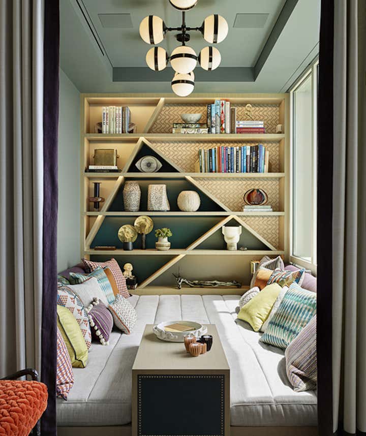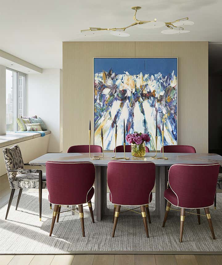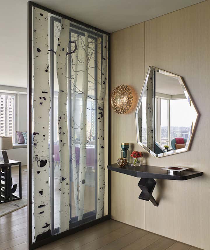 We combined 2 units at the St. Regis Residences into one apartment that is at once sexy, sophisticated and bohemian. Our client desired a very streamlined apartment perfect for entertaining guests for dinner or a casual get together in the cuddle puddle room – complete with a floor cushion and mounds of pillows. Artist Amanda Weil created panels of glass at the foyer meant to invoke a feeling of a forest in the sky.