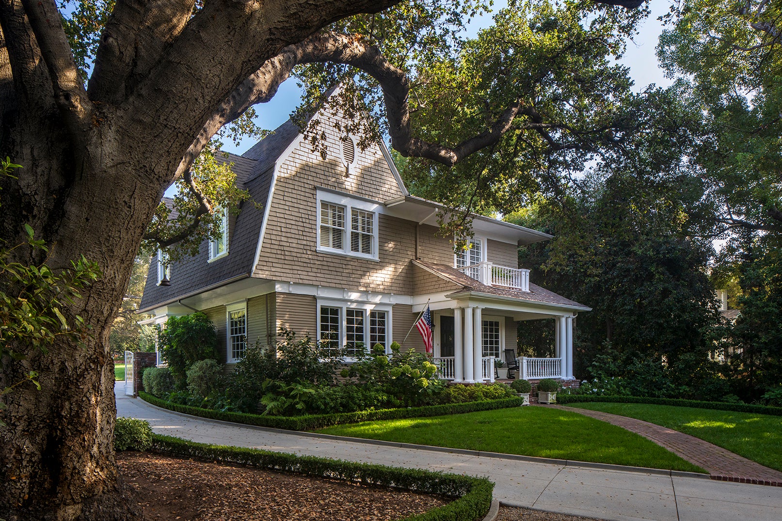 On the National Register of Historic Places, the house was completed in 1899 by real estate developer George Stimson and is known as the Stimson-Thum House. Inspired by the English Arts & Crafts style, its straightforward porches and overhanging eaves reflect the simplicity and harmony with nature for which this architectural period is known.