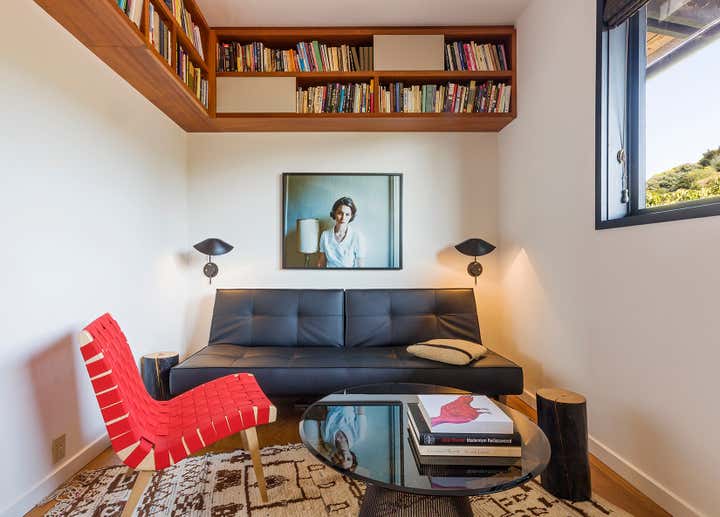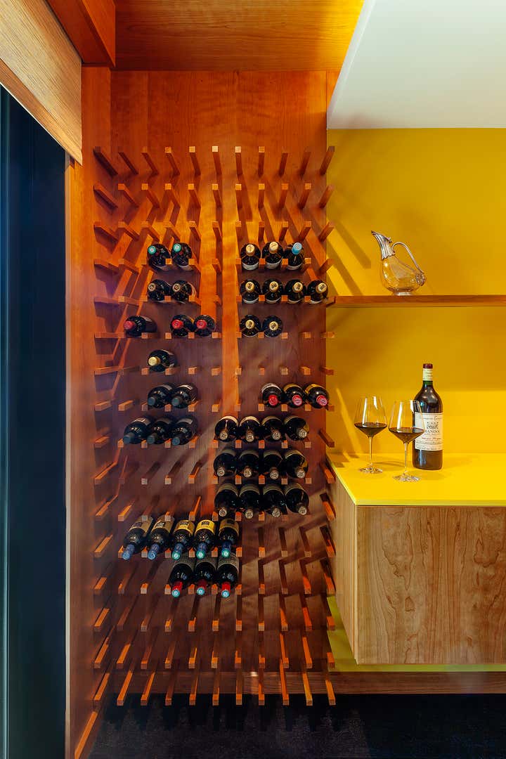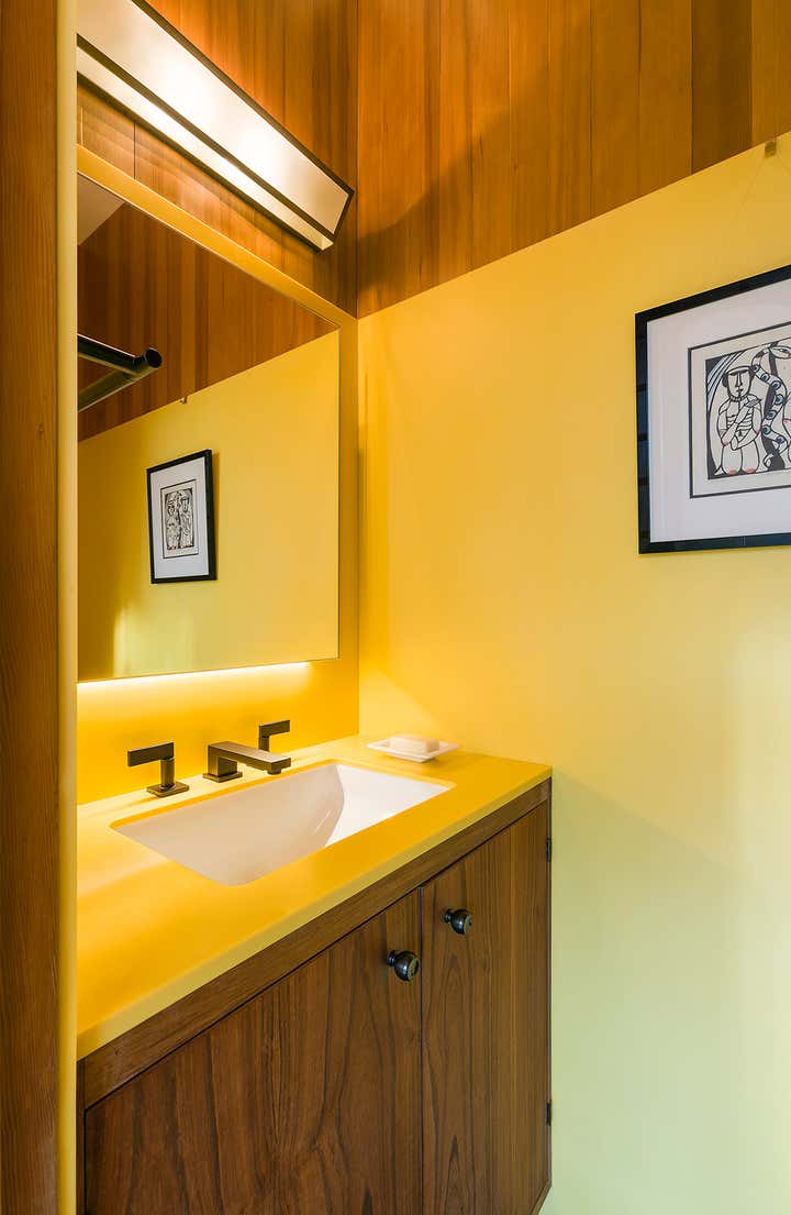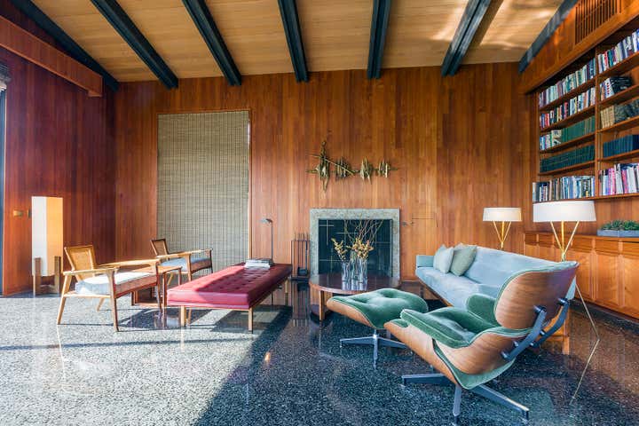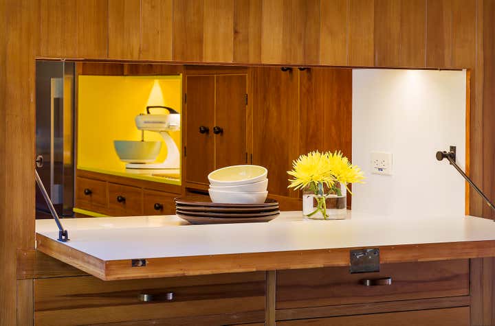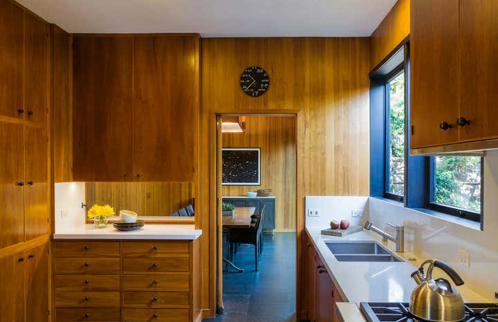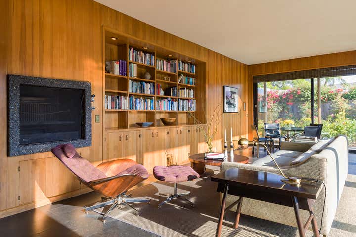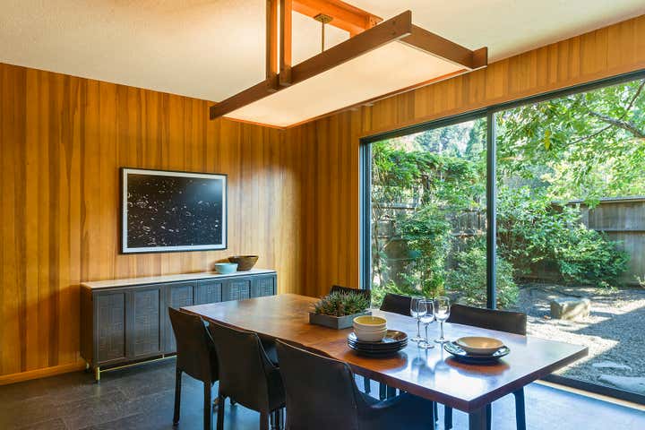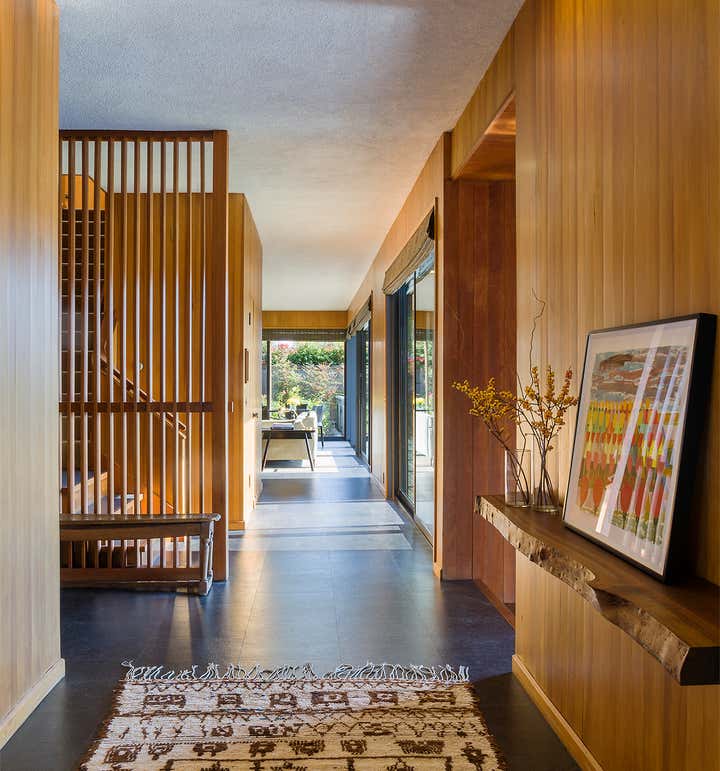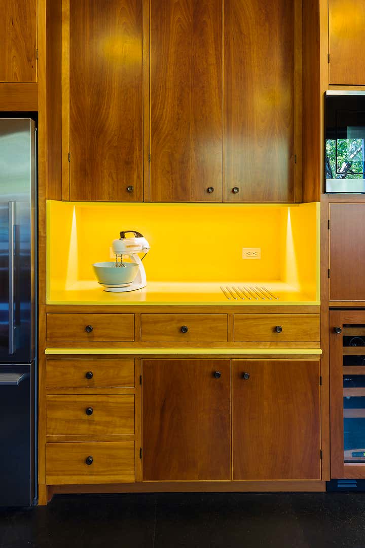 This iconic mid-century modern home was renovated with a complete restoration remodel honoring the original architect and homeowner’s memories of her childhood home. A combination of hemlock wood walls, cherry wood millwork, and custom hardware with new cork floors, custom furniture, vintage mid-century furnishings, and curated art collection.