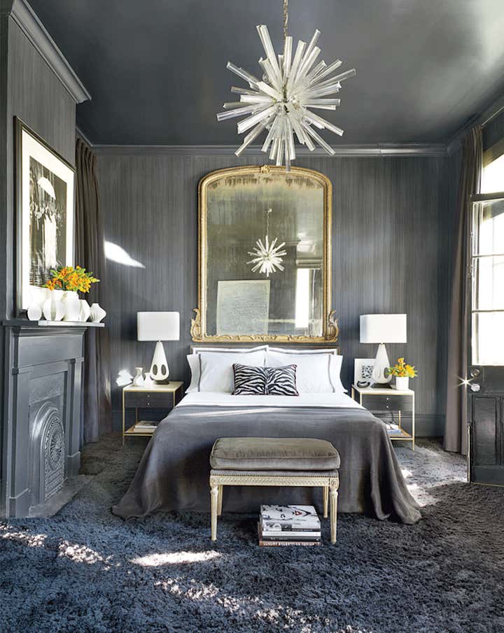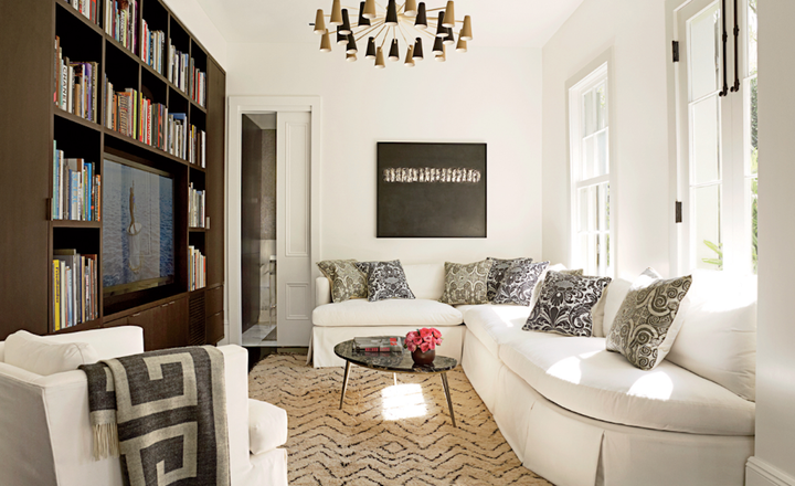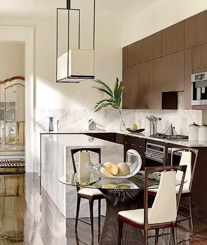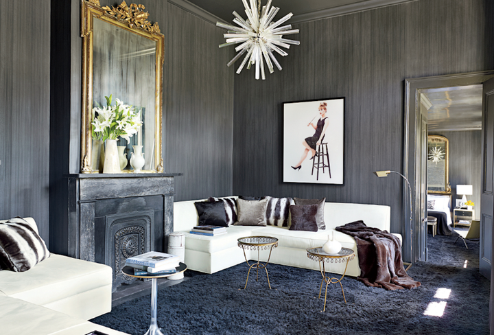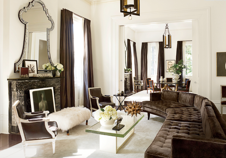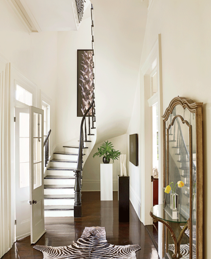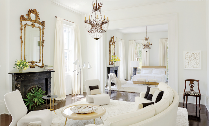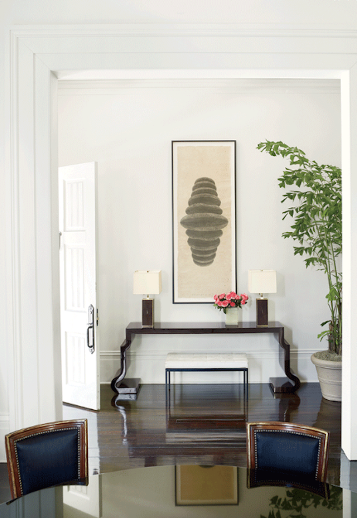 The architects selected a black and white palette to highlight the generous proportions of the rooms and the abundant natural light. Custom furniture by the architect is combined with 18th and 19th C. antiques. Several of the mirrors are original to the house.