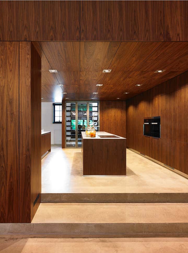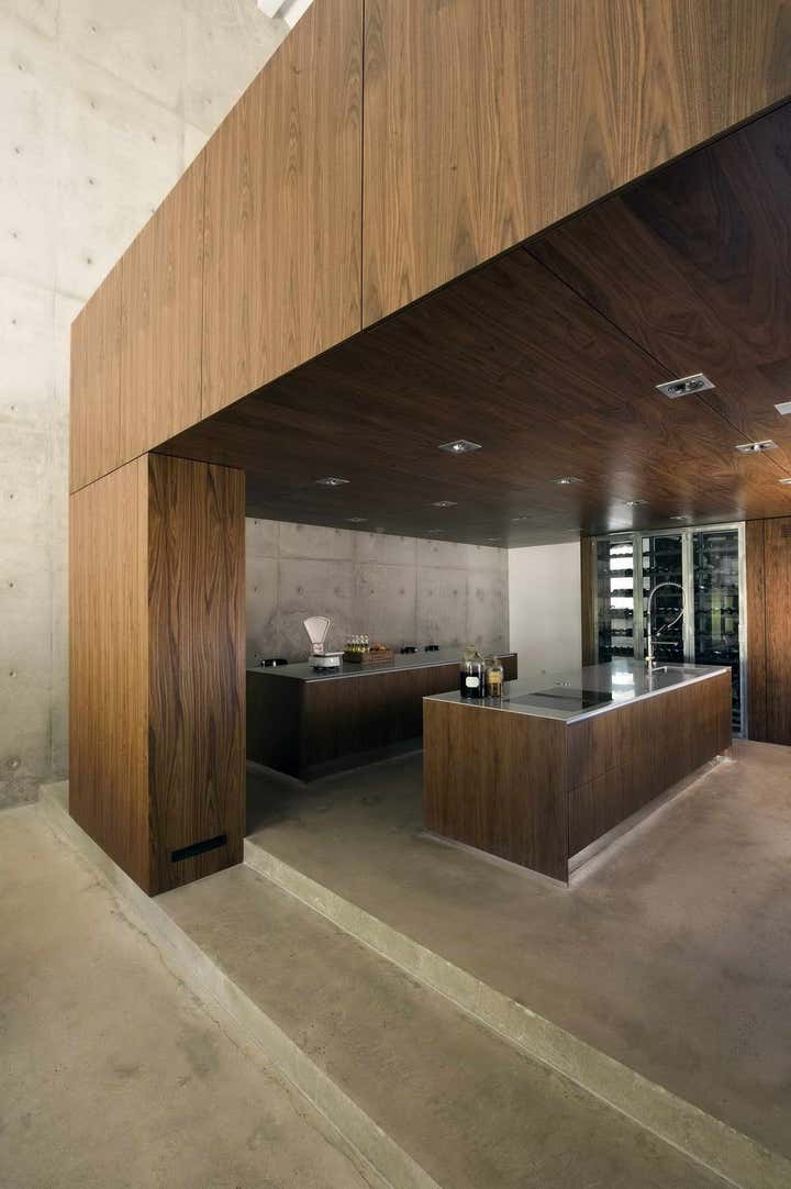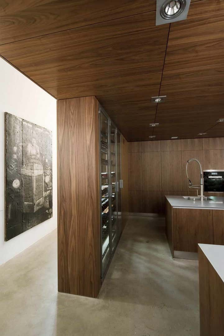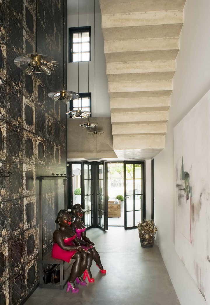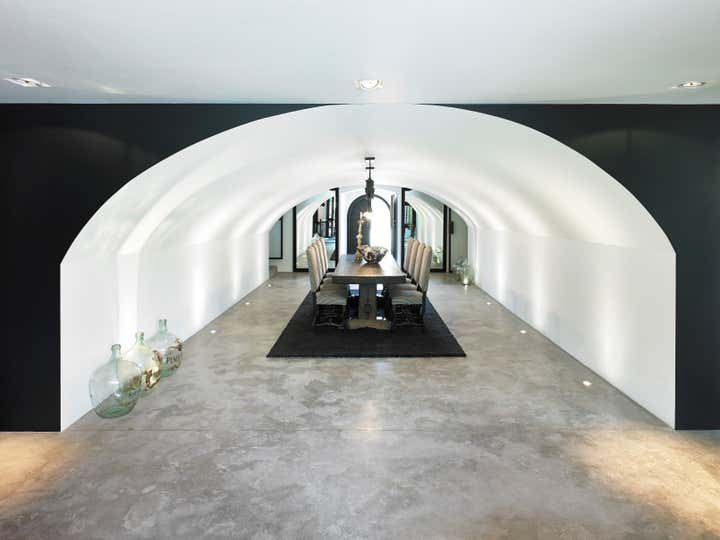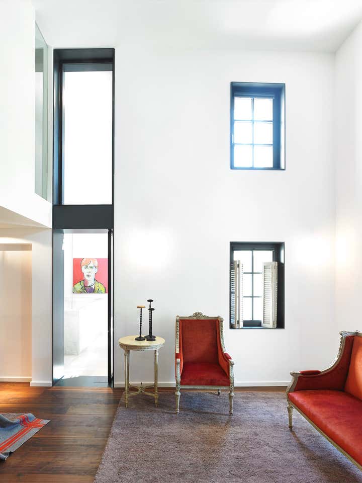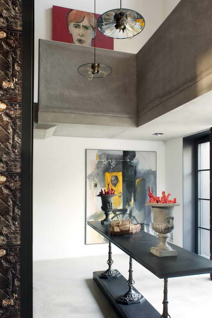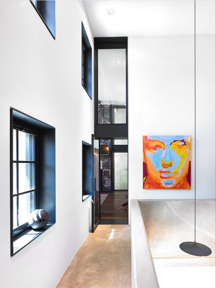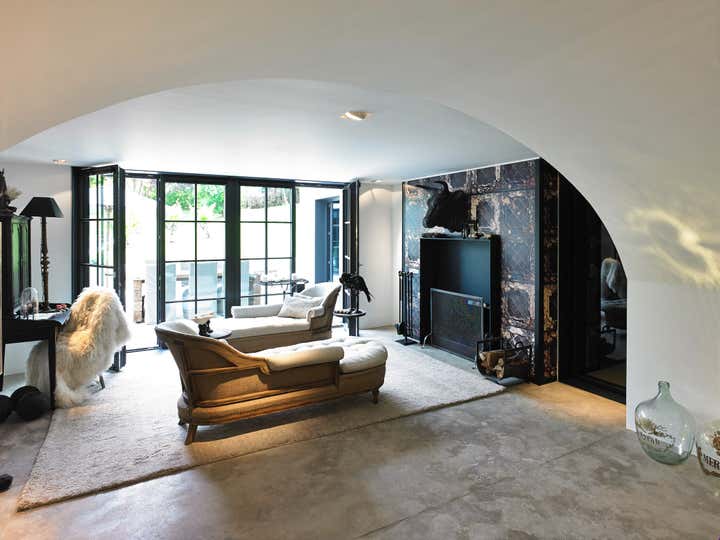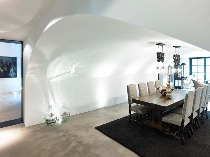 The living room features exposed wooden beams and large windows overlooking the garden. Off of the living room, the kitchen lies under a mezzanine, which serves as a study. This volume, made completely out of American walnut, offers an element of warmth to to contrast the forty foot ceiling height and polished concrete walls and floors of the living room. A vaulted, cellar-like space holds the dining area in the adjacent house. The foyer in the next building is generous and features artwork, with a free- standing tower in the center.