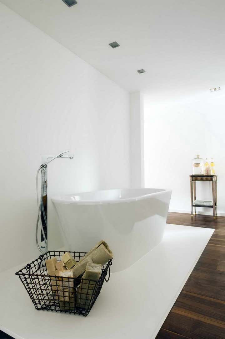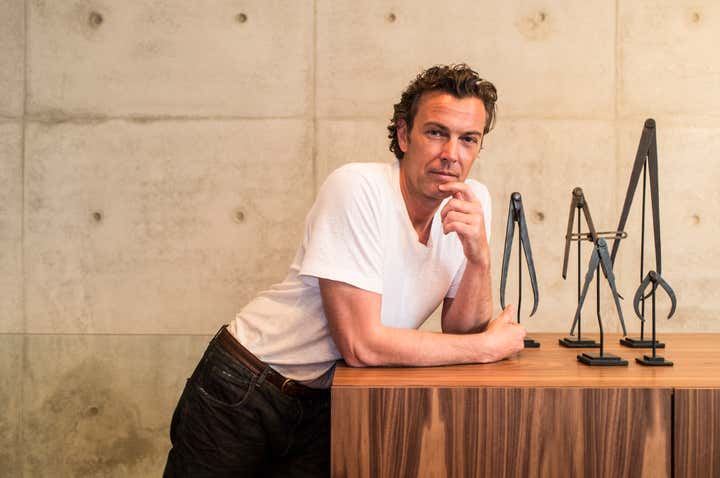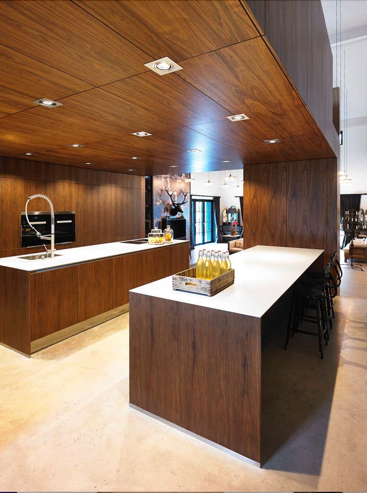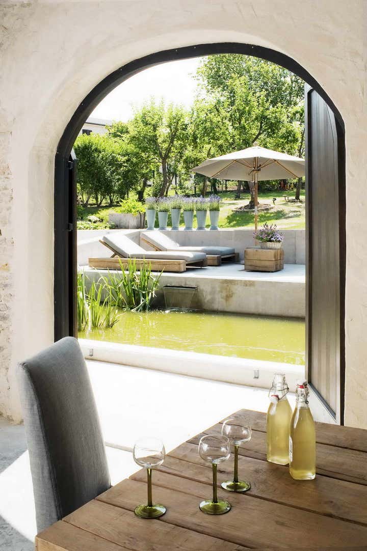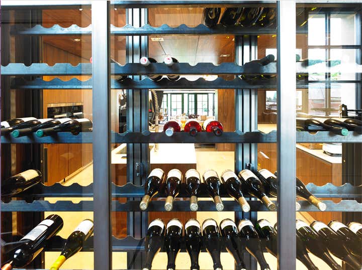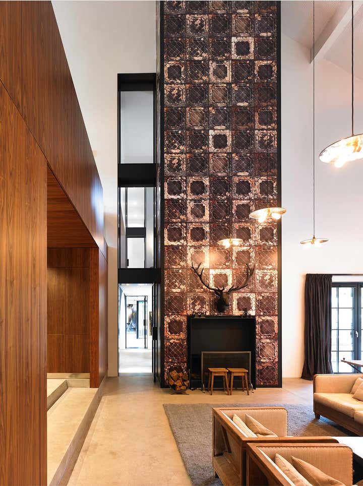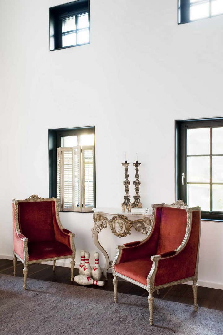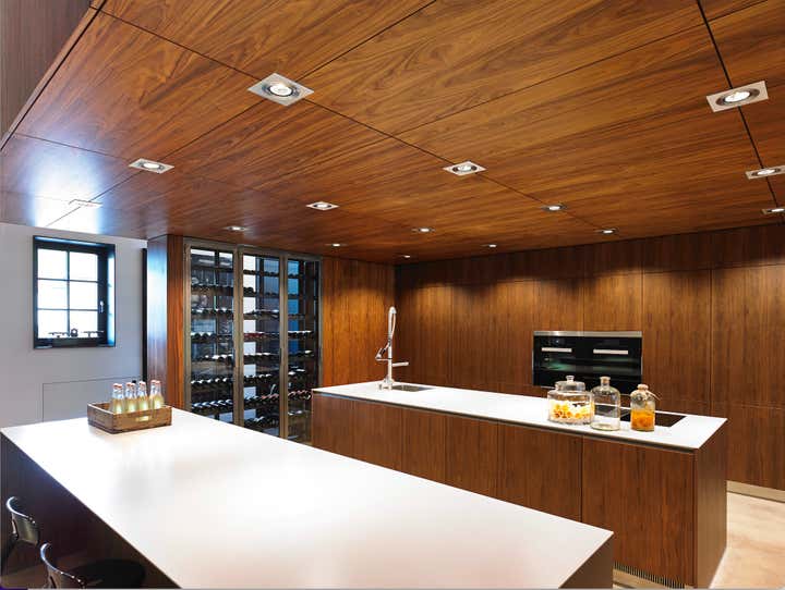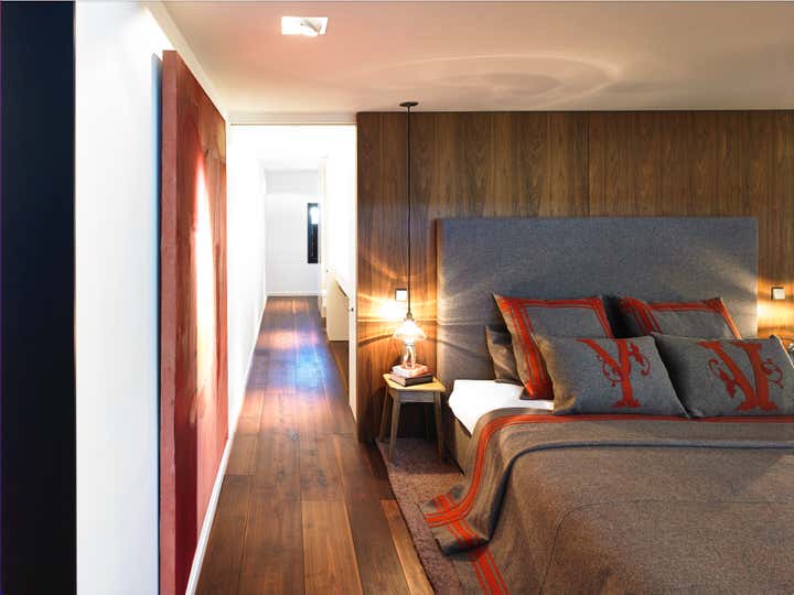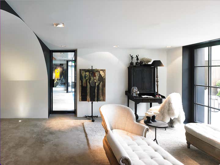 The living room features exposed wooden beams and large windows overlooking the garden. Off of the living room, the kitchen lies under a mezzanine, which serves as a study. This volume, made completely out of American walnut, offers an element of warmth to to contrast the forty foot ceiling height and polished concrete walls and floors of the living room. A vaulted, cellar-like space holds the dining area in the adjacent house. The foyer in the next building is generous and features artwork, with a free- standing tower in the center.