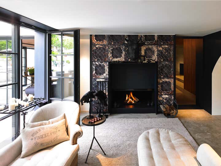 The design intent was to create a contemporary residence that respects and maintains the historical elements of the space – a series of landmarked buildings that formerly housed a winery and stable. The neutral color palette and decidedly defining material choices lend to the contemporary feel of the house, while the furniture and décor is reminiscent of a rustic, yet cozy farmhouse. The house is in a constant dialogue with its surroundings, connecting the interior and exterior.