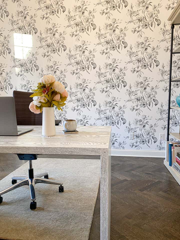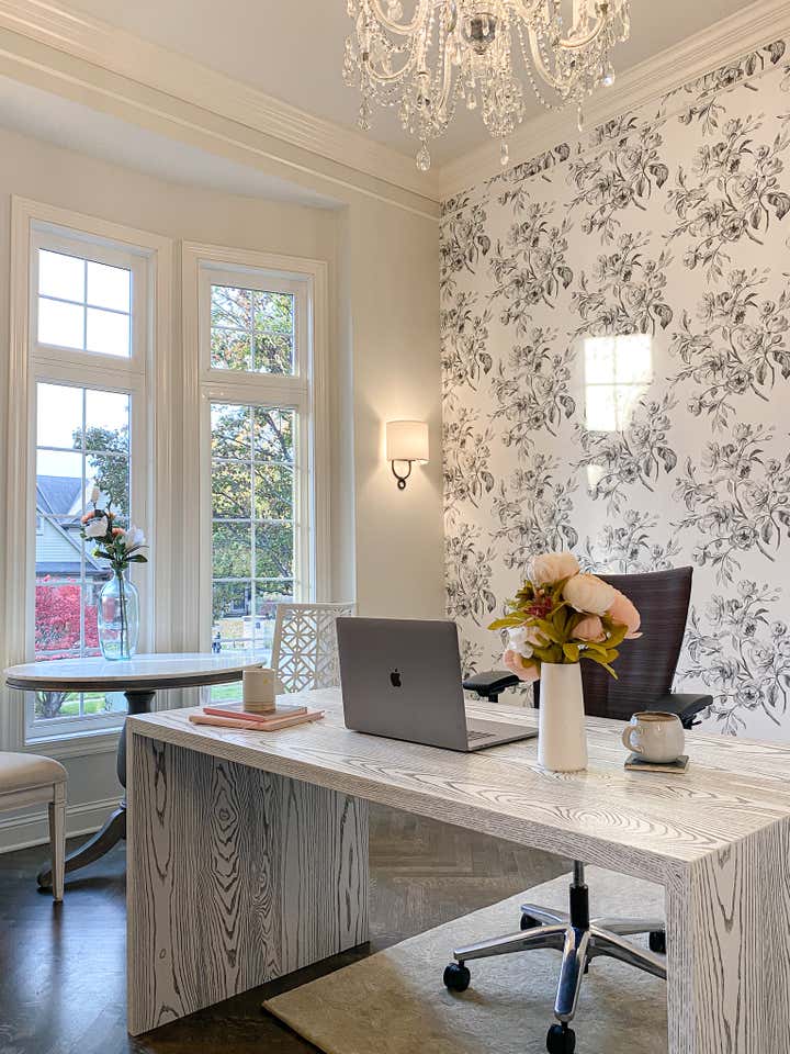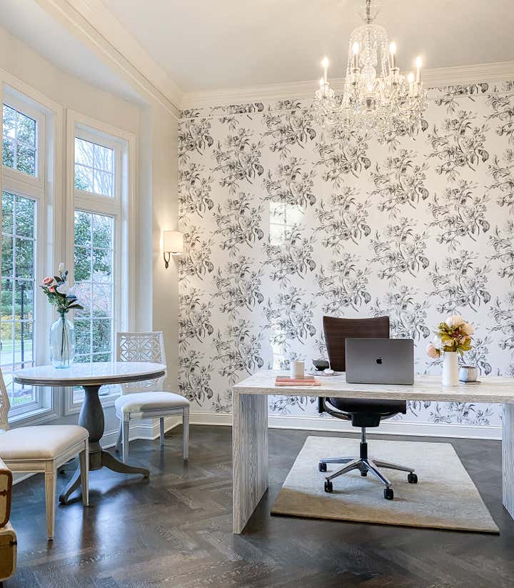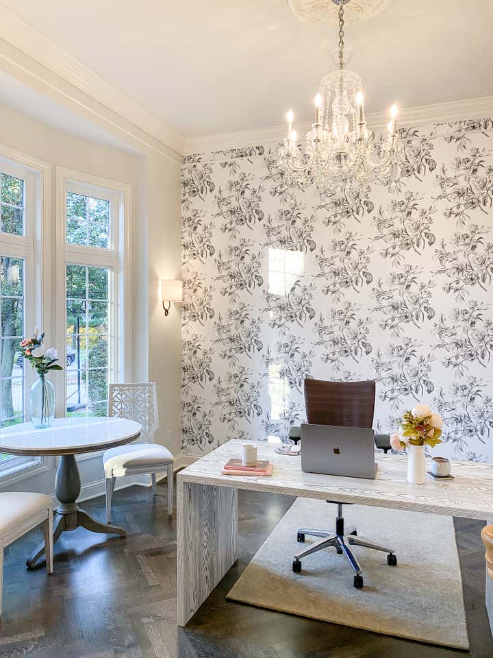 This lovely home office makes a grand statement right off of the front entry. Herringbone flooring, an antique crystal chandelier, and floral wallpaper all come together in perfect harmony.