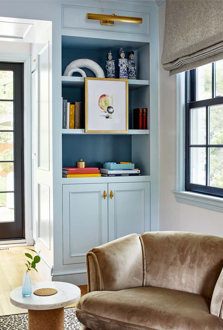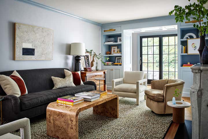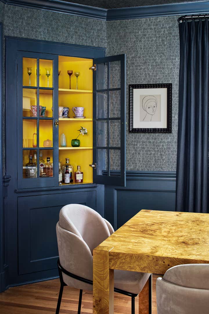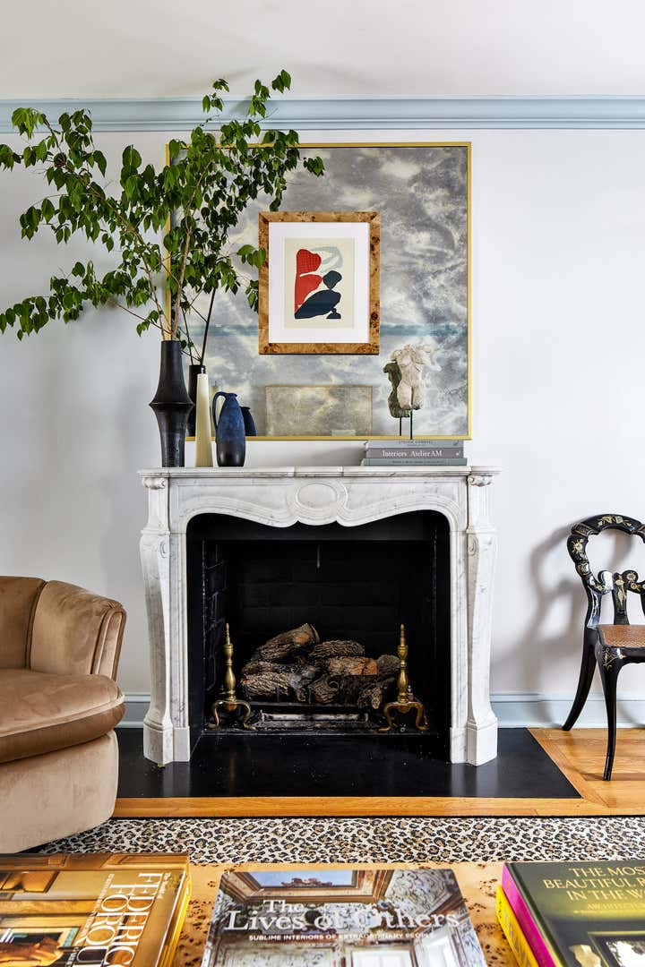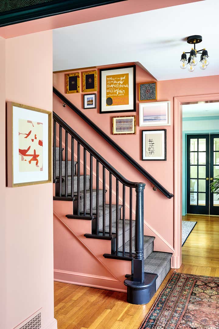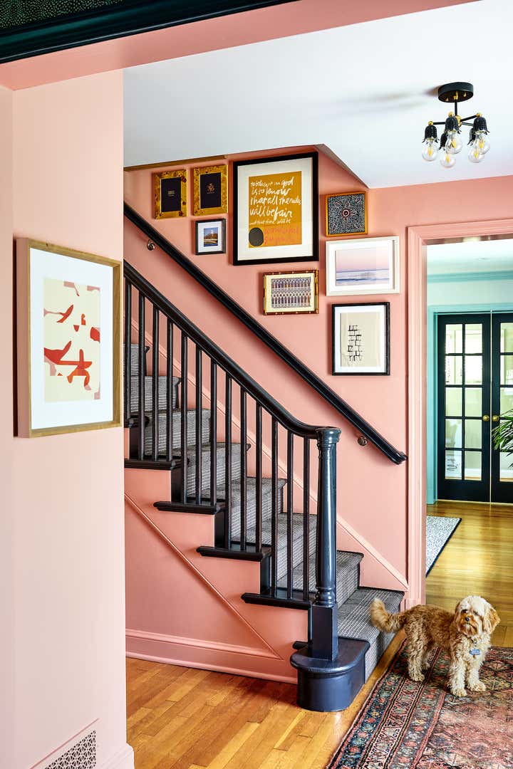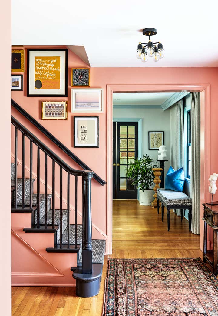 Peach paint in the entry produces a pleasantly unexpected first impression and is a warmly neutral backdrop for the eclectic mix of frames on the stairwell’s gallery wall. Art is installed in fresh ways throughout: atop wallpaper, layered onto mirrors, and integrated into built-ins. Along with a diverse collection of art, each room feels collected with selections of vintage rugs, antique furniture, and one-of-a-kind decorative objects. The combined space is elevated without being too precious for a family of four to enjoy. Read more about the design process at House Beautiful.