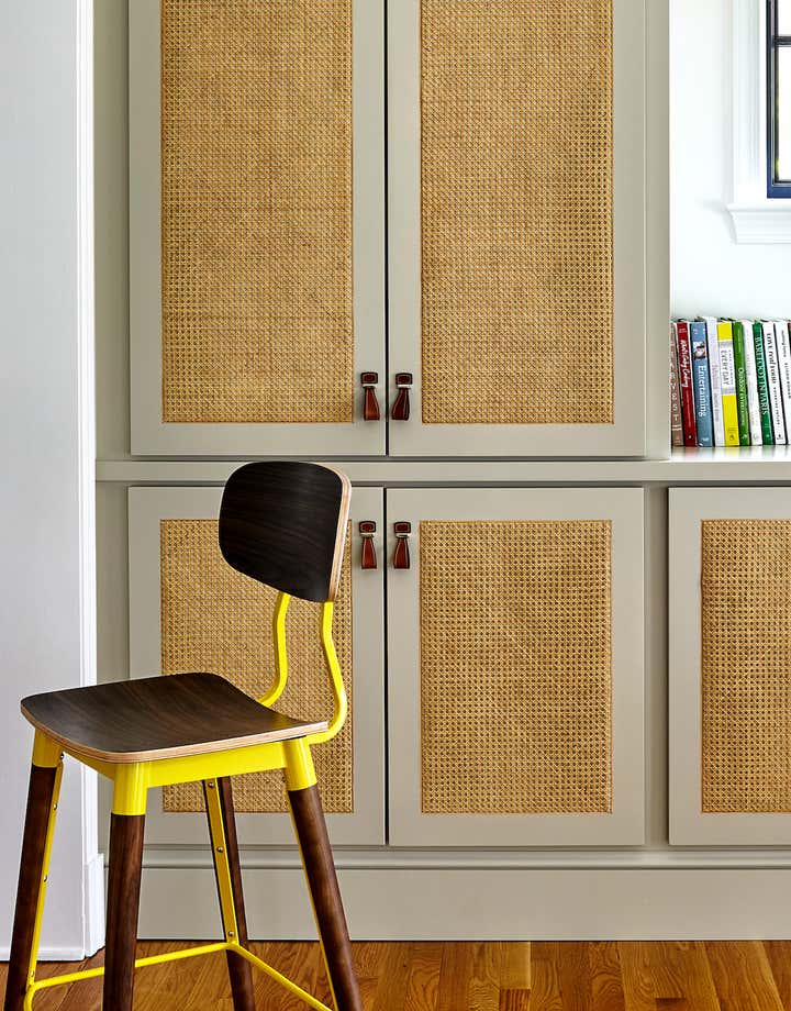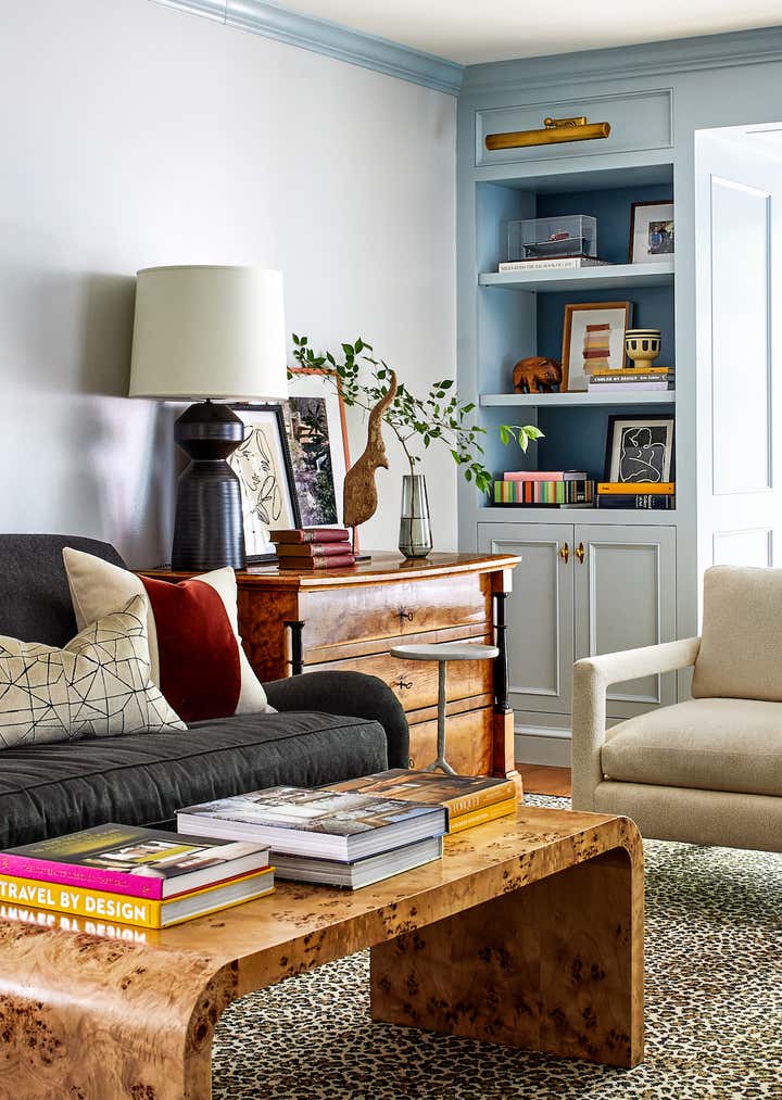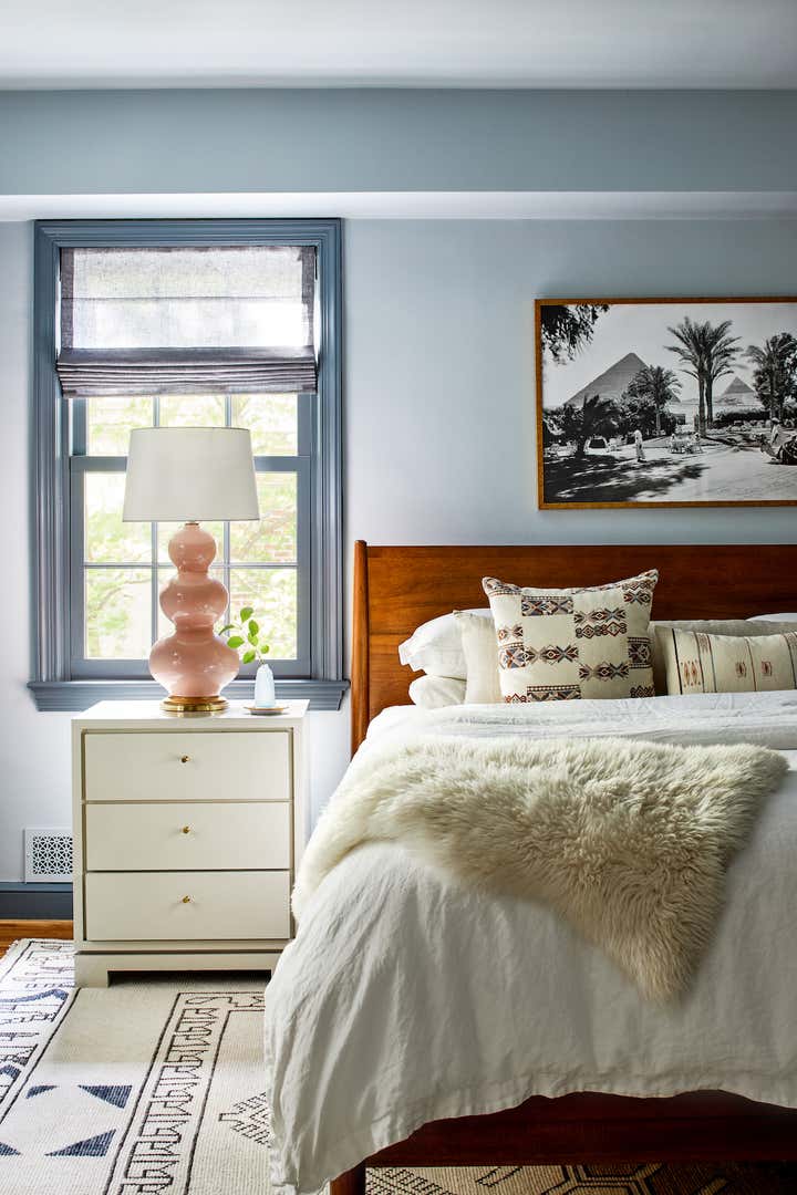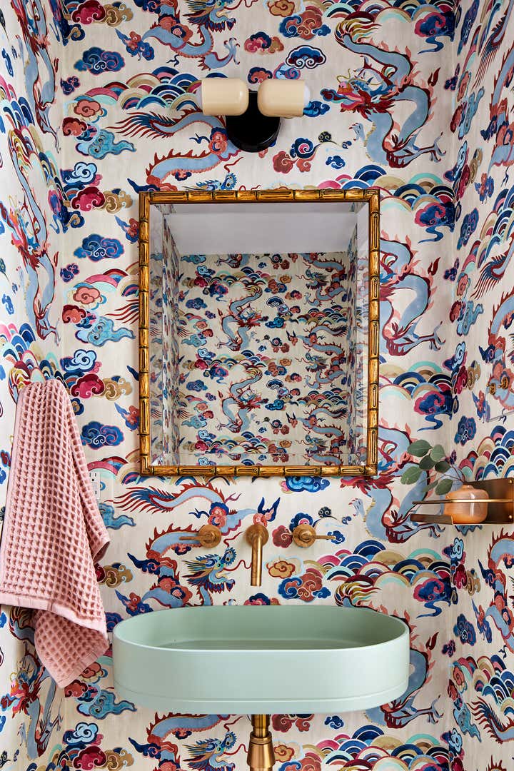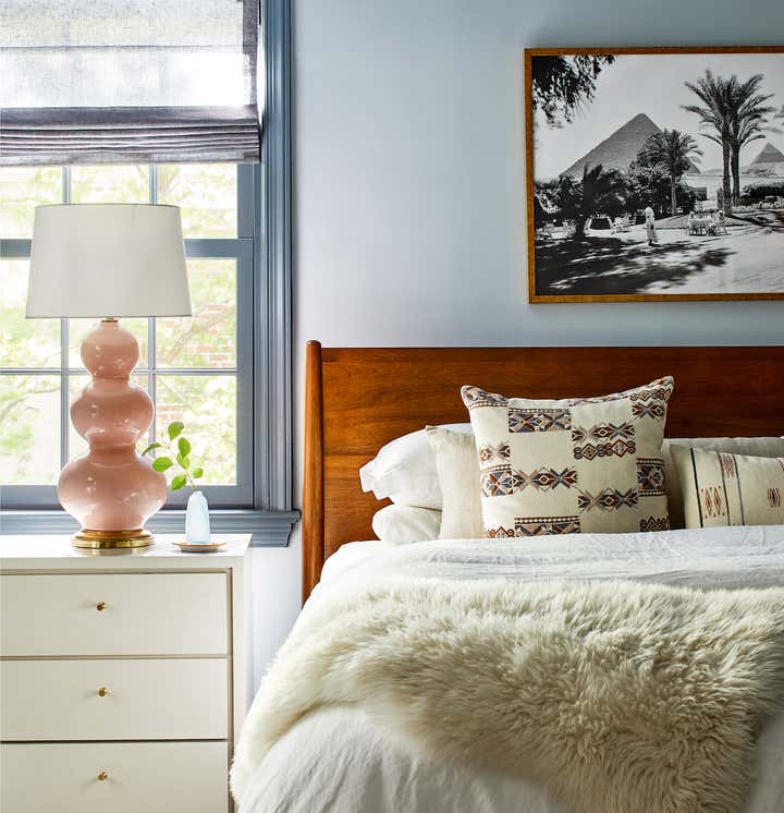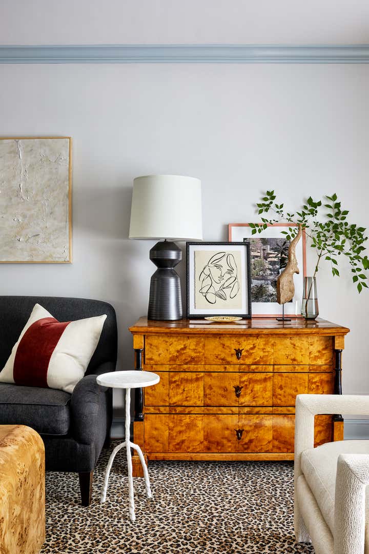 Peach paint in the entry produces a pleasantly unexpected first impression and is a warmly neutral backdrop for the eclectic mix of frames on the stairwell’s gallery wall. Art is installed in fresh ways throughout: atop wallpaper, layered onto mirrors, and integrated into built-ins. Along with a diverse collection of art, each room feels collected with selections of vintage rugs, antique furniture, and one-of-a-kind decorative objects. The combined space is elevated without being too precious for a family of four to enjoy. Read more about the design process at House Beautiful.