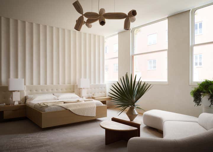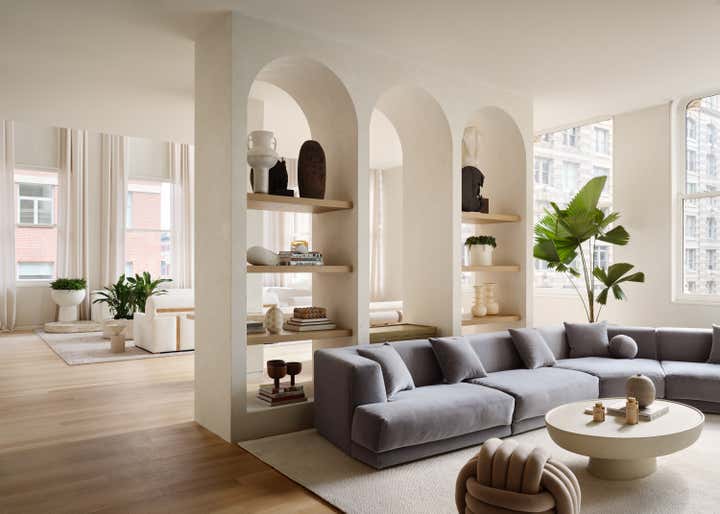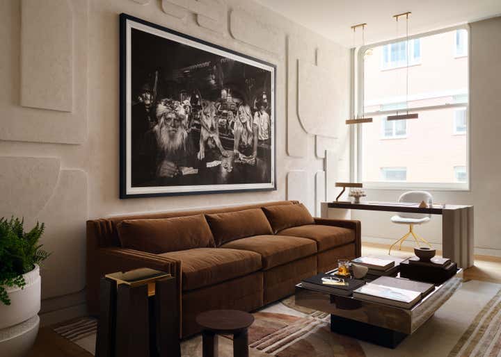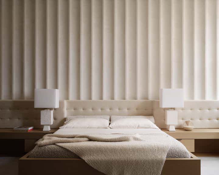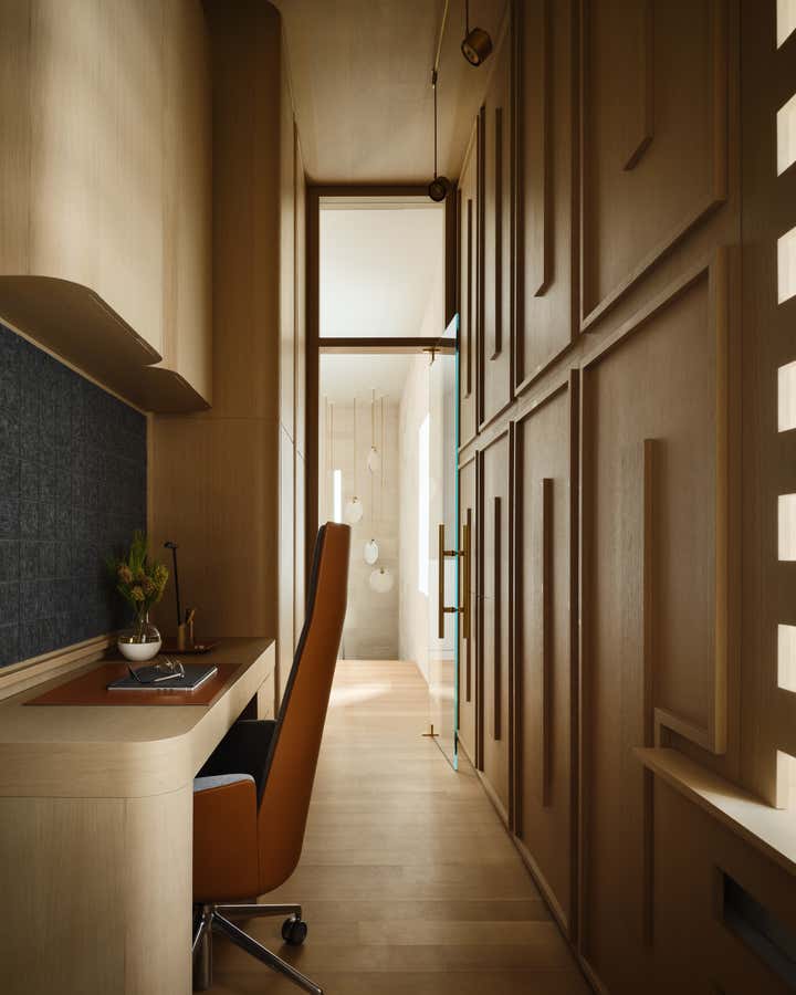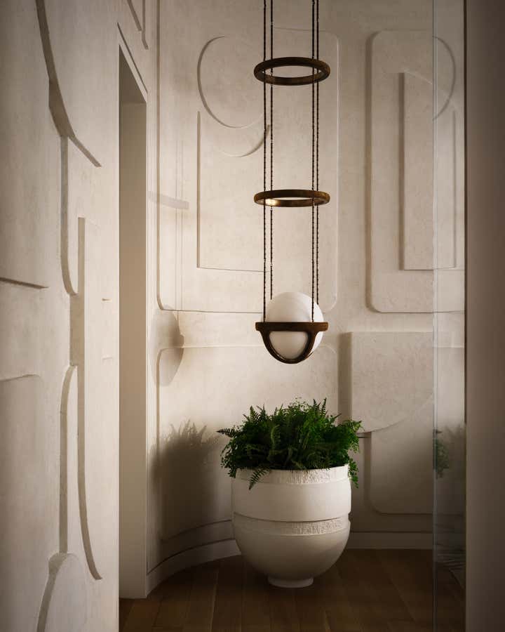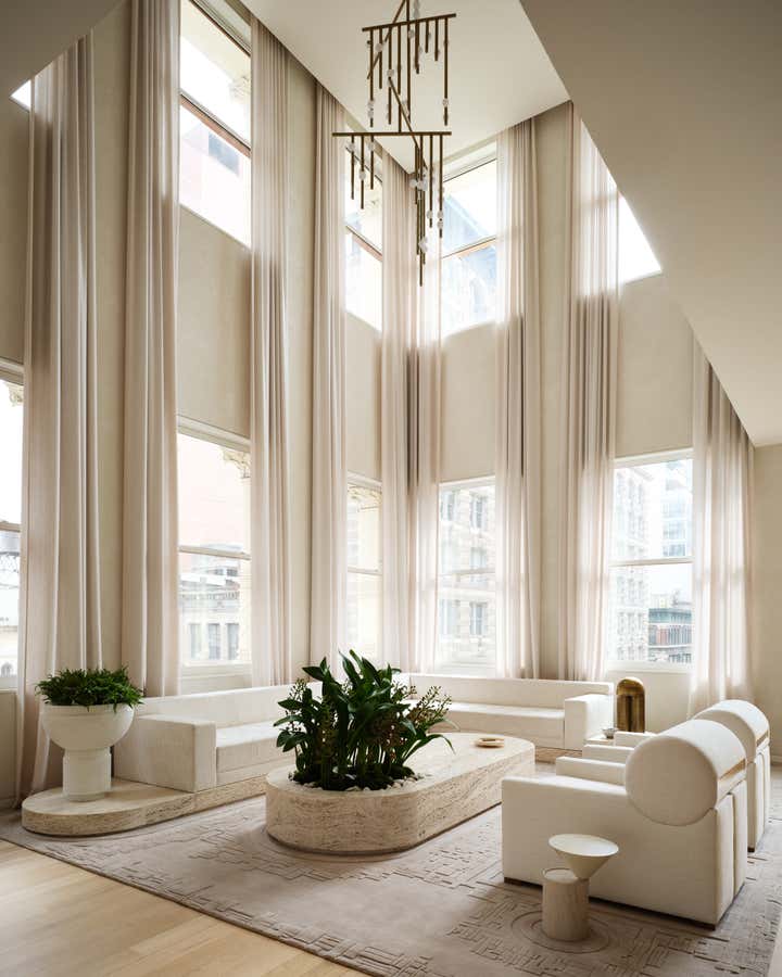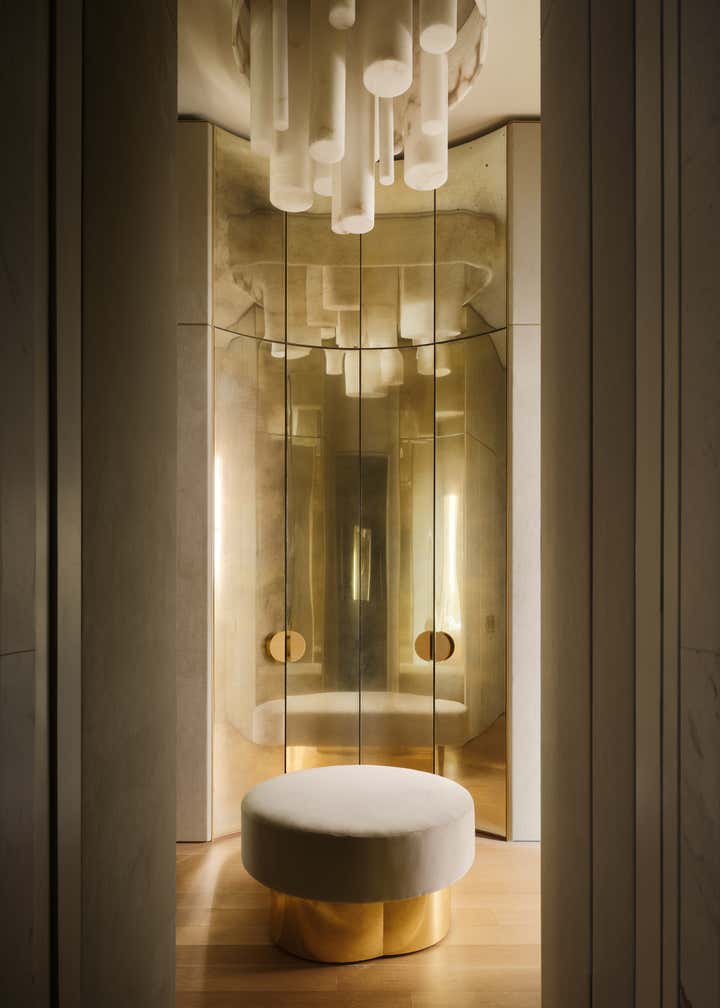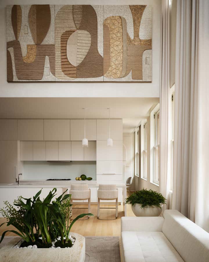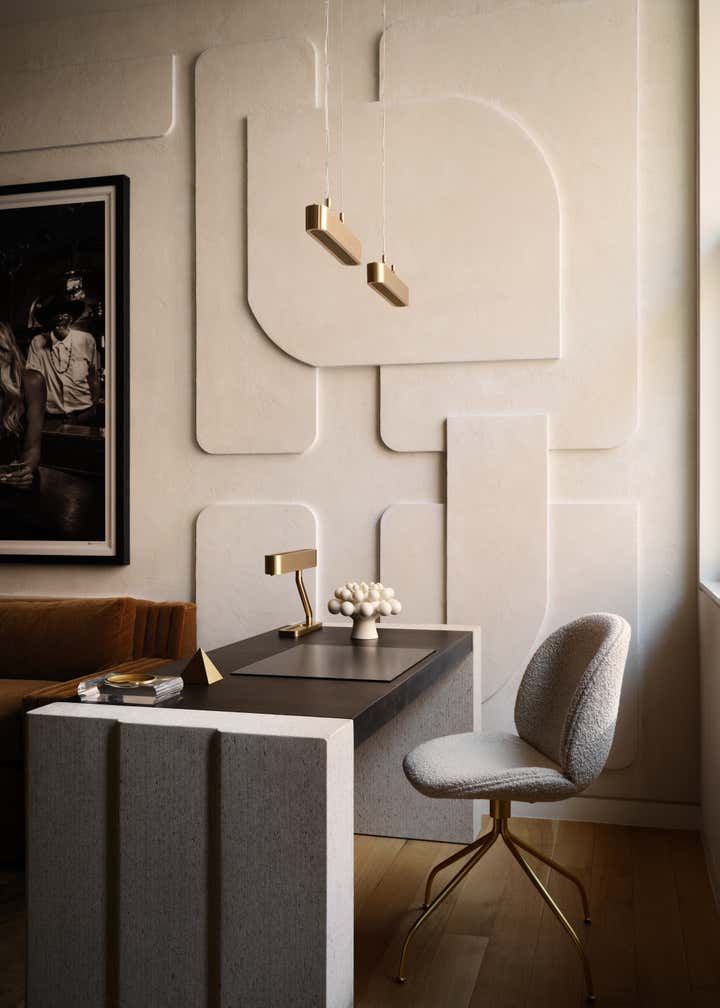 Texture is introduced through the use of open porous travertines, as well as custom rugs that outline the furniture locations. Most of the fabrics are bouclé , while the walls have been plastered with a fine stucco. No detail was overlooked: The staircase walls’ tiles boast a limestone texture. As you step off the custom wood-paneled elevator from the busy streets below, the residence’s monochromatic color palette instantly brings a sense of calm.