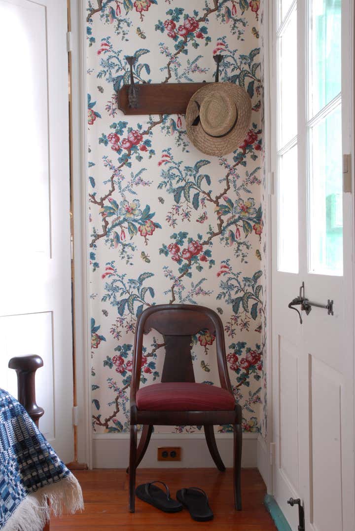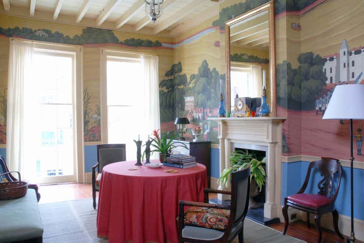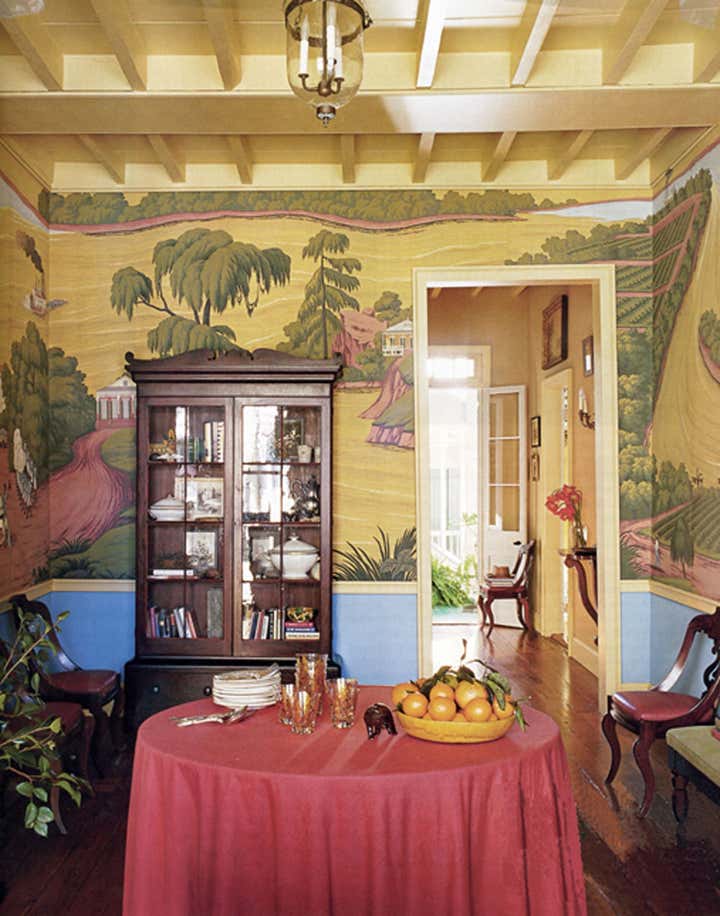 In the main room, Jayne indulged a fascination with scenic wallpapers found in New Orleans and throughout the South, an interest that began with his study of the decorative arts. Taking inspiration from one of his favorite childhood books, "The Story of the Mississippi", with illustrations by C. H. DeWitt, and working with the wallpaper company DeGornay, a new scenic design more in keeping with the setting was created. A vibrant Creole color palette was used in the mural, and then framed with bright blue in the dado and yellow on the trim. These adjacent colors visually support the scenes and highlight the colors of the design.
