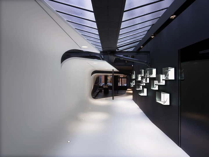 For the BSL Gallery, I took another look at the essential white cube, a model used for contemporary art, not adapted to the needs of a design gallery. I proposed a sequential spiral in white Corian, a functional sculpture extrapolated to the dimensions of architecture. This structure becomes the first object placed in the gallery. An assertive object which accentuates the location’s perspectives, but can mutate to validate and enhance the neutrality of a “white page”. A hull which, as both window and cocoon, creates a background context for design projects with strong, distinct identities.