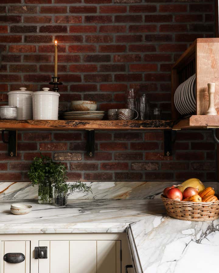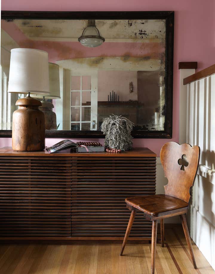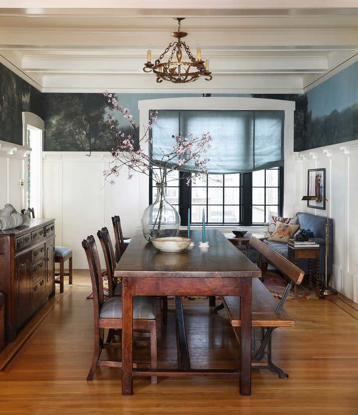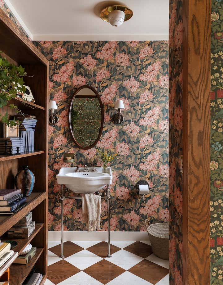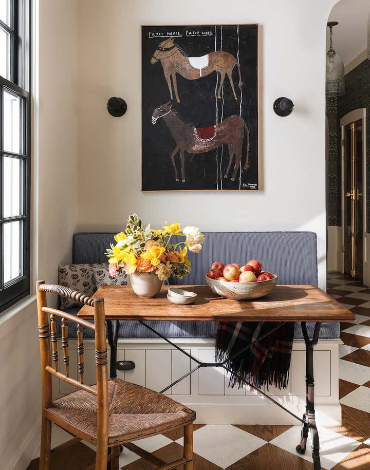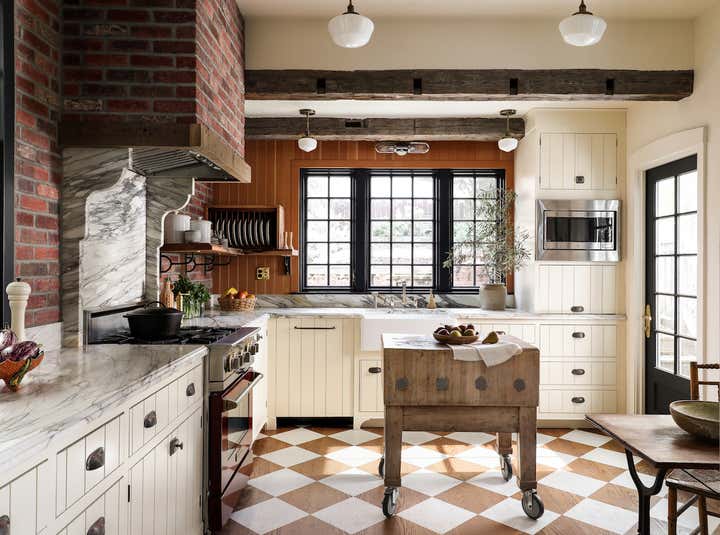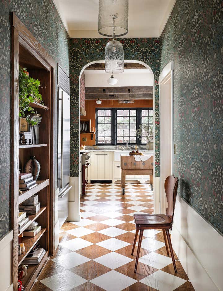 New windows and architectural elements abound with the intention of introducing materials that feel like they belonged to the house from the beginning. The farmhouse palette included salvaged wood, brick and marble counters, and wood flooring painted with a checkerboard design. Antique furnishings and a bouquet of patterned wallpaper accentuate the client’s taste for eccentric English playfulness.