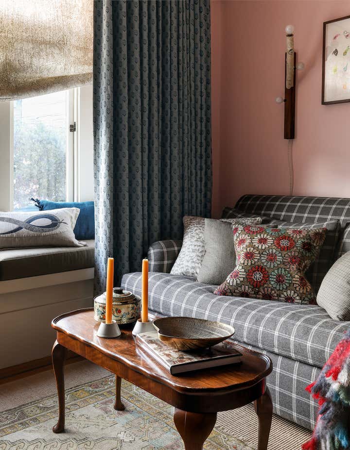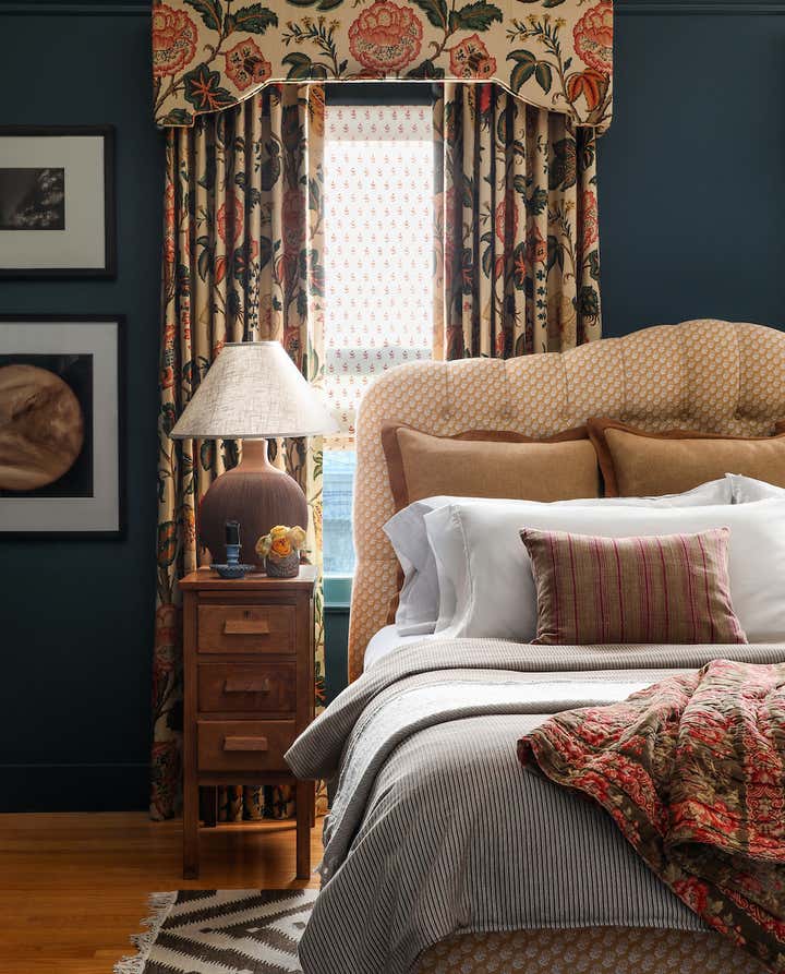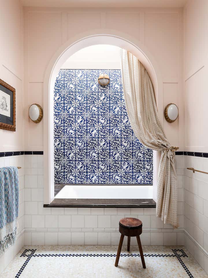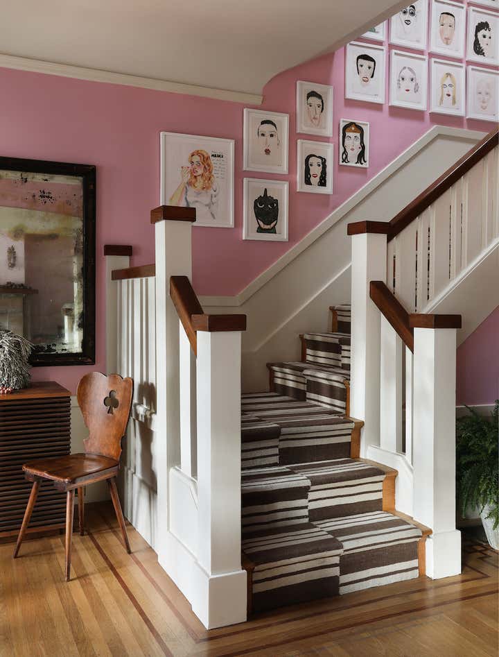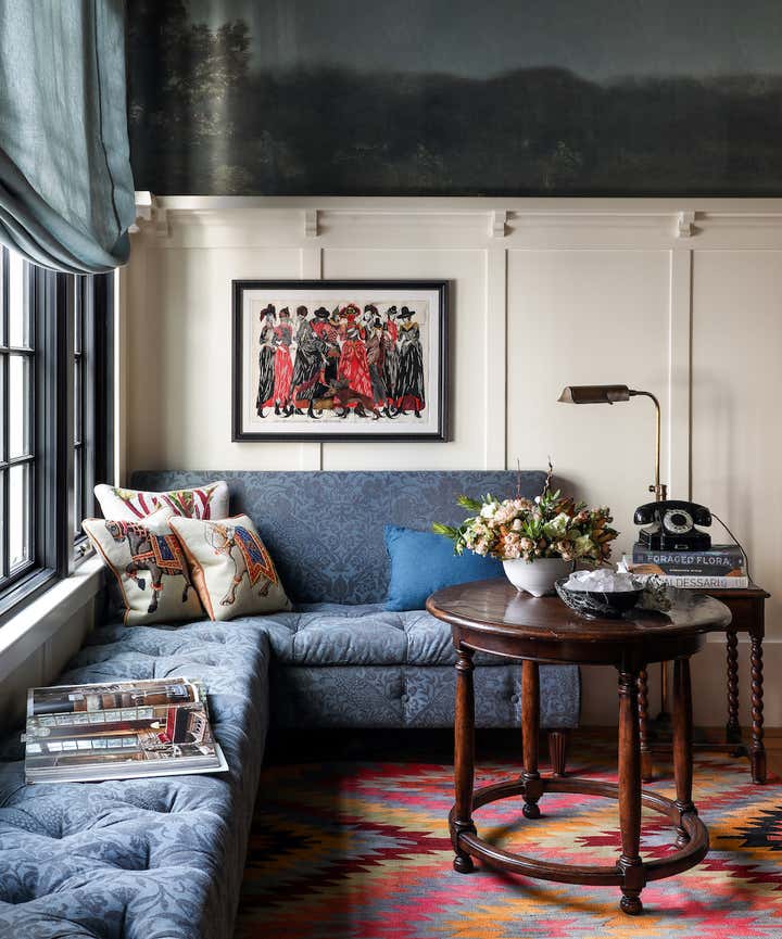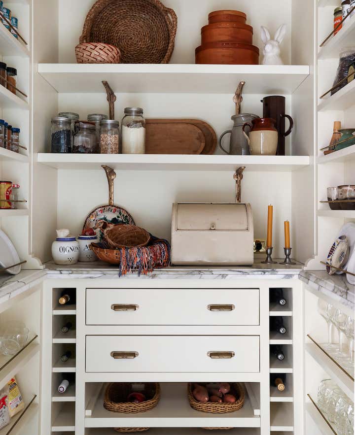 New windows and architectural elements abound with the intention of introducing materials that feel like they belonged to the house from the beginning. The farmhouse palette included salvaged wood, brick and marble counters, and wood flooring painted with a checkerboard design. Antique furnishings and a bouquet of patterned wallpaper accentuate the client’s taste for eccentric English playfulness.