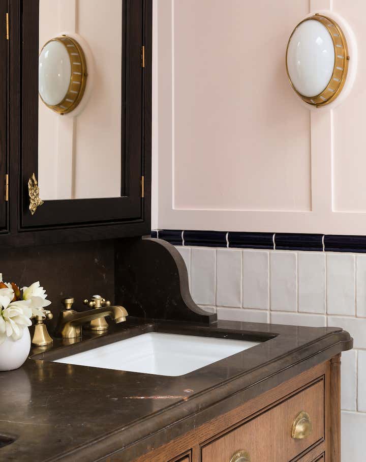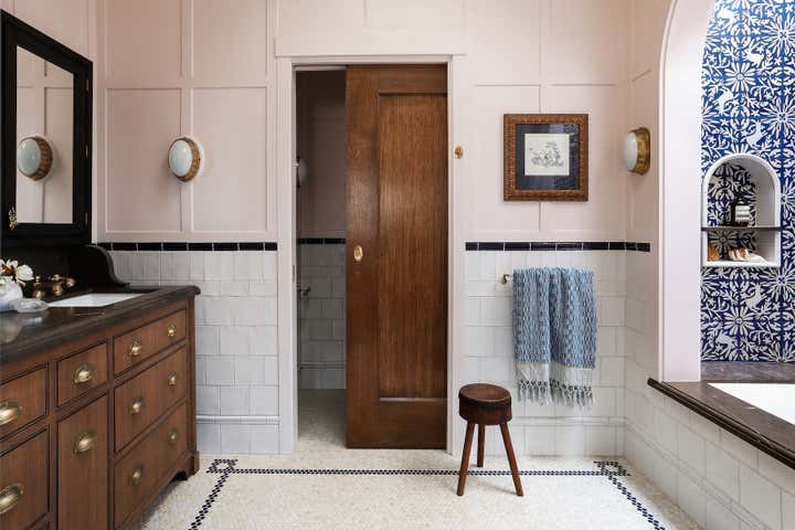 The kitchen in this 1914 Arts and Crafts home was the anchor for a whole-house remodel project in San Francisco’s Richmond district. The client, a well-traveled illustrator, was inspired by English country houses. Both the existing kitchen and main bath had undergone an earlier remodel in the 1990s in a style that was incongruent with the historic architecture of the home and devoid of light and circulation. By moving the kitchen to the back of the house, we were able to expand the views to the back yard and design a generous pantry hall with a powder room located behind a secret bookcase door.
