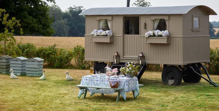 This impressive private country home features a disparate and unique collection of antiques and artworks from across the world. With each room looking out onto the attractive surrounding gardens, Katharine put as much thought into the exterior of the property as the interior. The gardens feature numerous memorable details including a classical, timber-framed, greenhouse; charming chicken coop; attractive formally planted terrace and a prettily decorated traditional Shepherd’s Hut under the trees beyond.