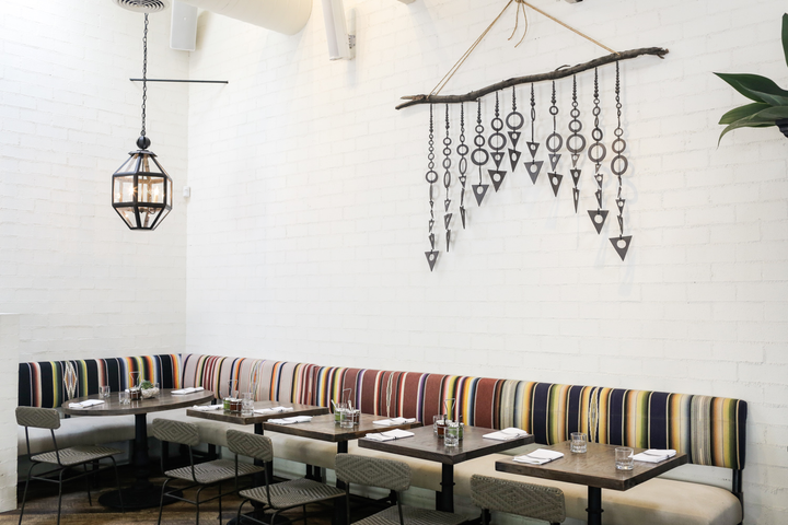 We were very fortunate to have such a special space as a foundation for this incredible organic plant-based restaurant. Architecturally, the building is beautiful and raw: high barrel vaulted ceilings with wood trusses, brick walls and a generous outdoor space. We decided to preserve these original details as much as possible while creating a flow between interior and exterior. Our design choices were inspired and guided by the ethos of Gracias Madre: sustainability, community and reverence for Mother Earth. We decided to use Mexican design as a stepping off point and aimed to create a relaxed, bright and inviting space. Almost everything was custom made: the light fixtures, chairs, banquettes and tables. Custom steel doors and windows were added to brighten up the space and create a flow between the restaurant interior and patio. Reclaimed wood was used for both the floor and the custom tables and some of the glassware is made from reclaimed glass. Two highlights of the space are the graphic cement tiles on the bar face and restroom floors designed by artists in Oaxaca, which also influenced our black and white color scheme, and our vintage 1940s & 50s serapes we used as upholstery and the remnants on the aprons. Landscape designer Scott Shrader transformed the original parking lot into a lovely patio with Mexican brick herringbone, a pair of large olive trees and bamboo topped awnings.
