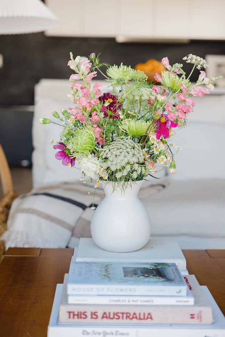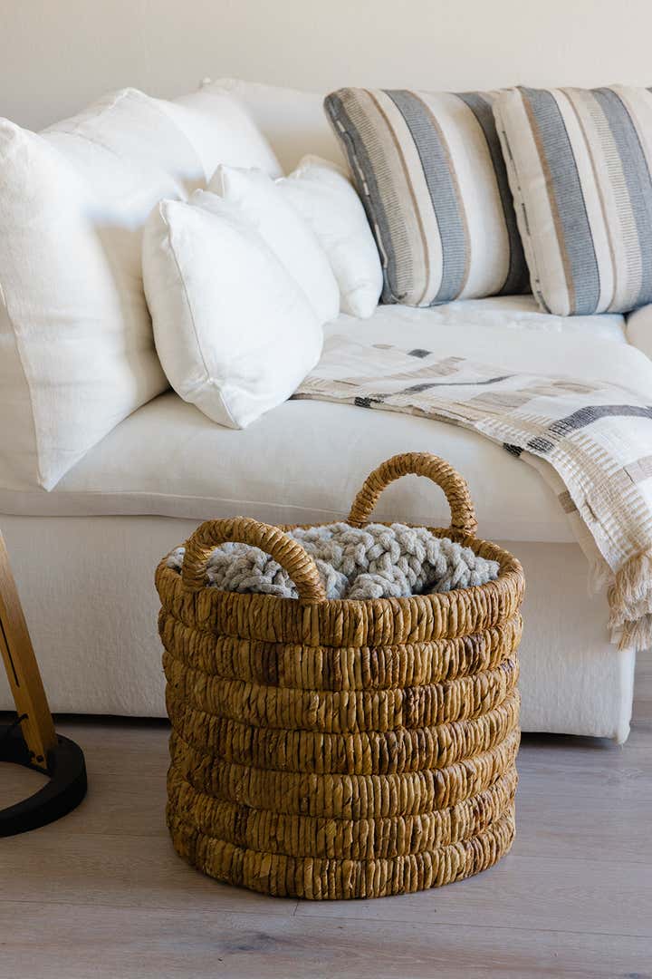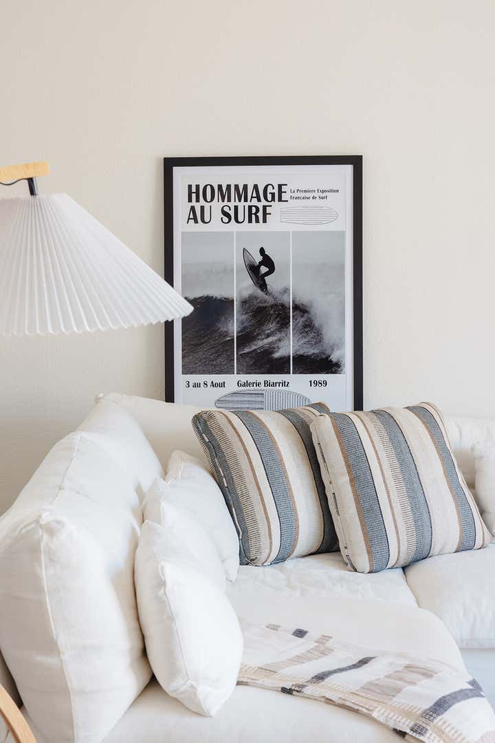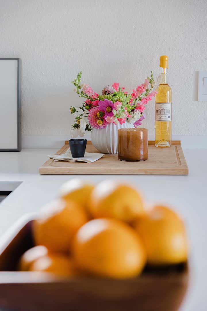 We had so much fun working with the guest house of this updated Spanish style home. We went for a California casual look. Stripes, pops of orange, and layered textures give this space a laid-back feel. We added playfulness and intrigue with the accessories, books, and art.