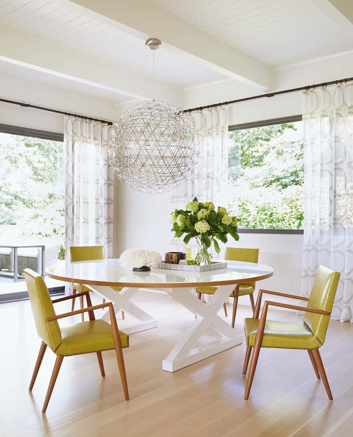 This modernist glass house in the estate section of Southampton, with its window walls framing views of a broad lawn and majestic trees, called for a mix of sleek and organic materials. The colors of the various specimen of trees on the property and horizon beyond provided the color palette for the decoration.
