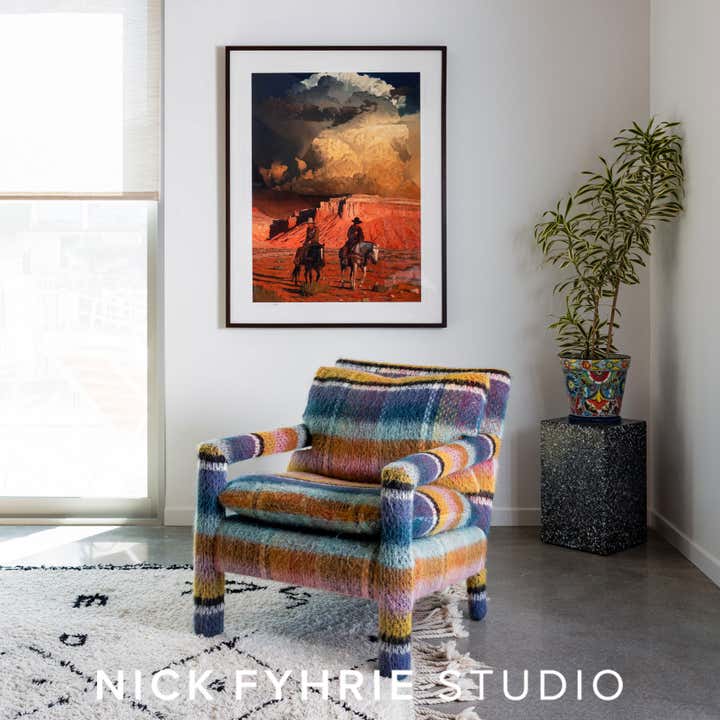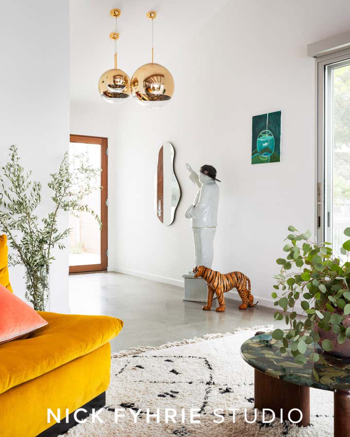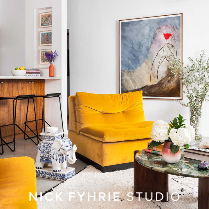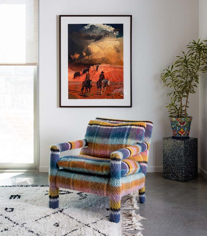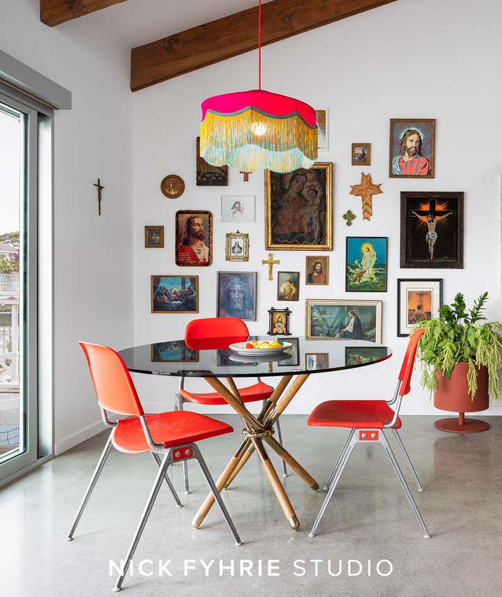 The interior design of Harbor House is dynamic, eclectic, and colourful - the result of a complementary collaboration between The Studio & the client. The overall design scheme incorporates custom and vintage furnishings, bespoke lighting, and a modern renovation of the kitchen and bathrooms. Polished concrete flooring provides the foundation for comfortable layers including Moroccan rugs and a multi-purpose guest bedroom and office. Shades of pink carry throughout the home, adding a touch of glamour and warmth. Materials used such as teak wood and stone in the kitchen and bathrooms offer minimal contemporary accents to the vibrant colors in the client's personal art collection. Memorable custom accent chairs in the living room and primary bedroom are covered in luxurious Pierre Frey alpaca plaid fabrics. A 1970s flair is implemented seamlessly throughout the home in vintage pieces such as red Knoll dining chairs, a mirrored dresser, and ceramic elephants. The overall effect is effortless cool, unique to the client's taste and lifestyle.