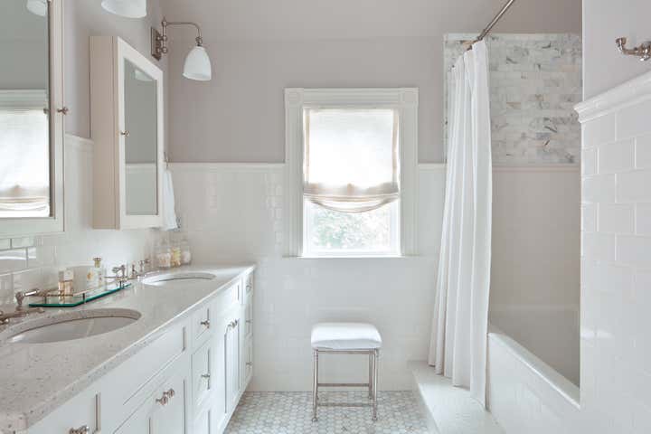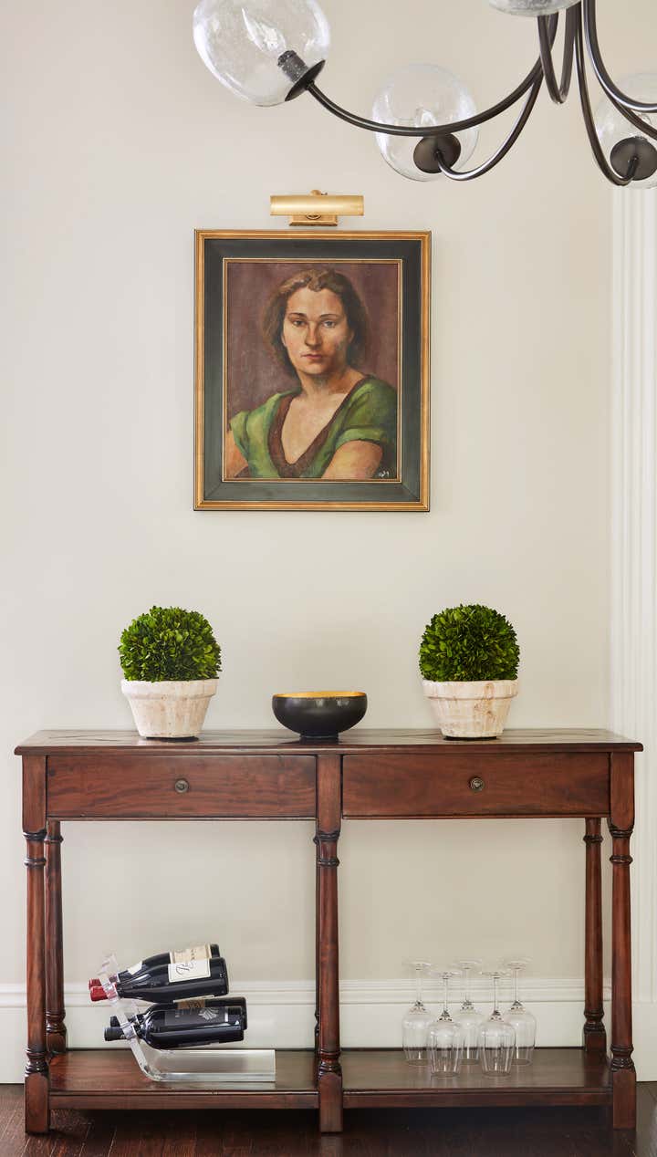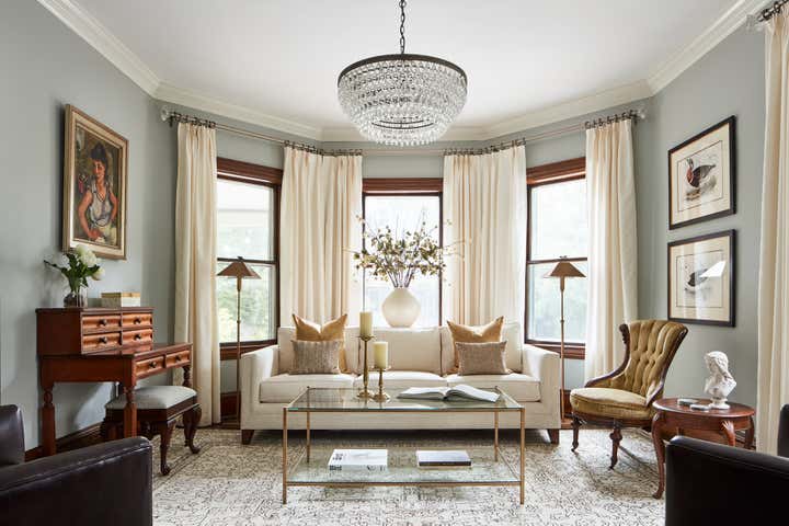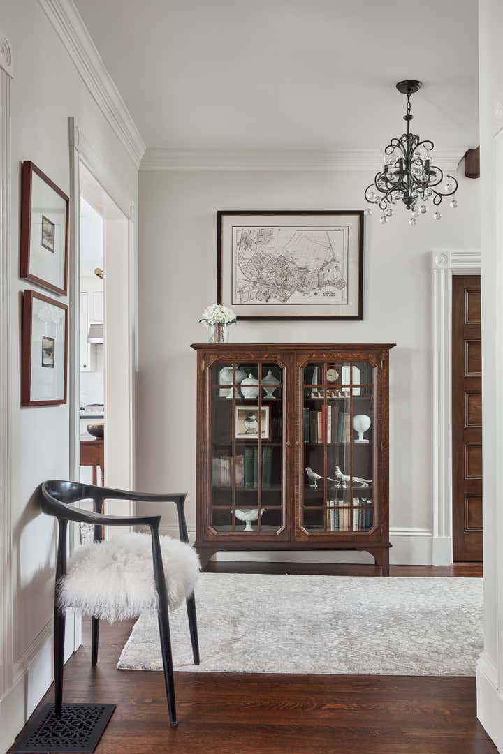 This 1902 shingle-style Victorian in Boston's suburb of Newton was completely renovated, but original details such as the quarter-sawn oak floors, doors and mouldings were restored rather than replaced. A neutral pallet allows the woodwork and carefully selected antiques to take center stage in the design.