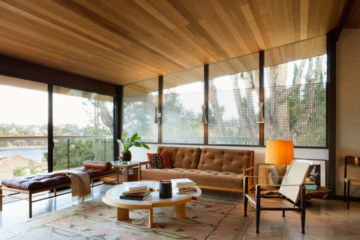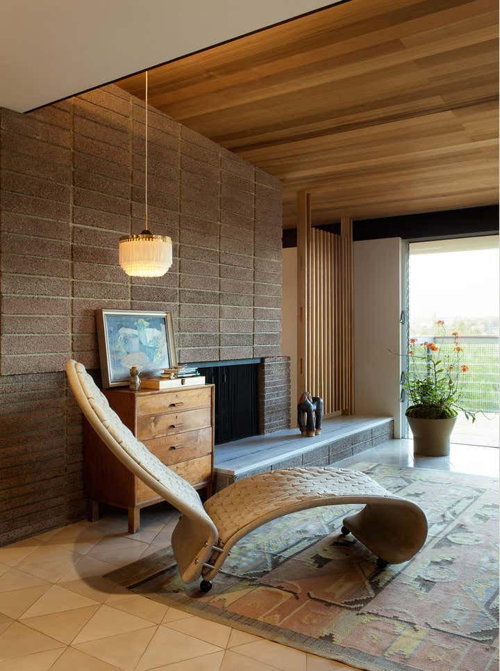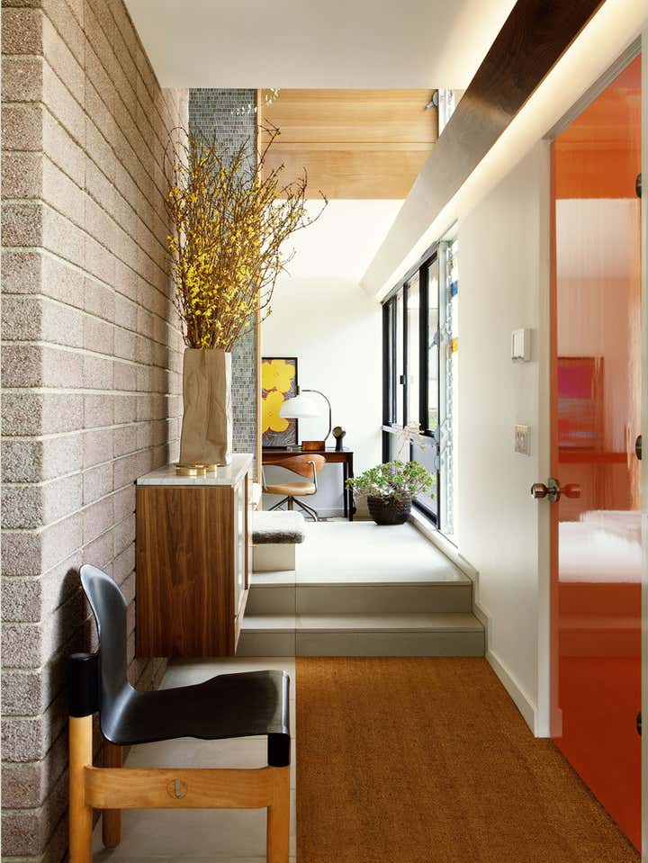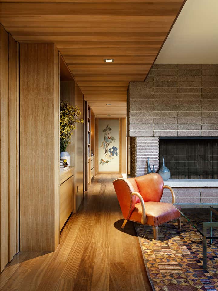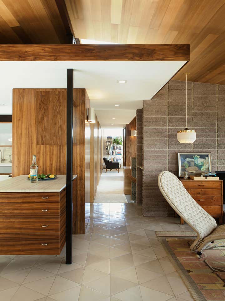 A compact two-story hillside mid-century received an extensive and thoughtful remodel; the only original elements to survive are the burnished block central fireplace core and the steel beams and window frames. A luxe materials palette elevates the house without obliterating its eccentricities, while all new systems and conveniences, including a screening room, bring the house into the 21st Century. Maintaining certain original elements, such as the decorative window screens which are water-cut aluminum copies of the plastic originals and the sconces which we restored to their original quality. Particular attention was devoted to architectural materials including custom oyster-colored triangular cement tile flooring, Western Red Cedar ceilings, American Black Walnut and rift-sawn White Oak monolithic volumes, high-gloss laminate cabinetry, custom ceramic tile bathrooms, and even stained glass paneling.