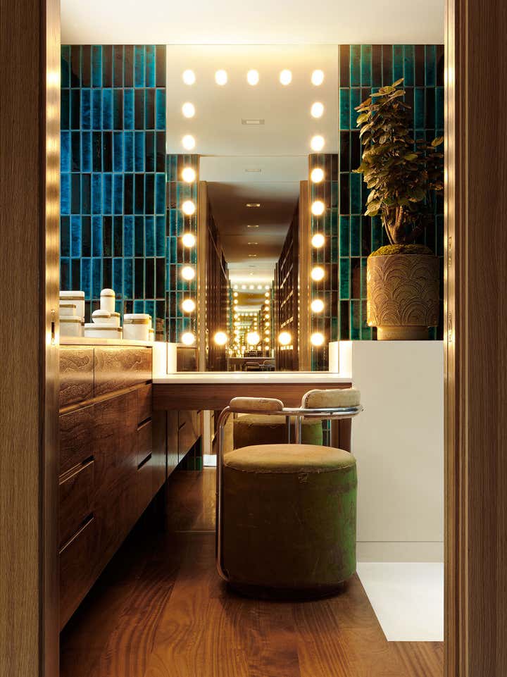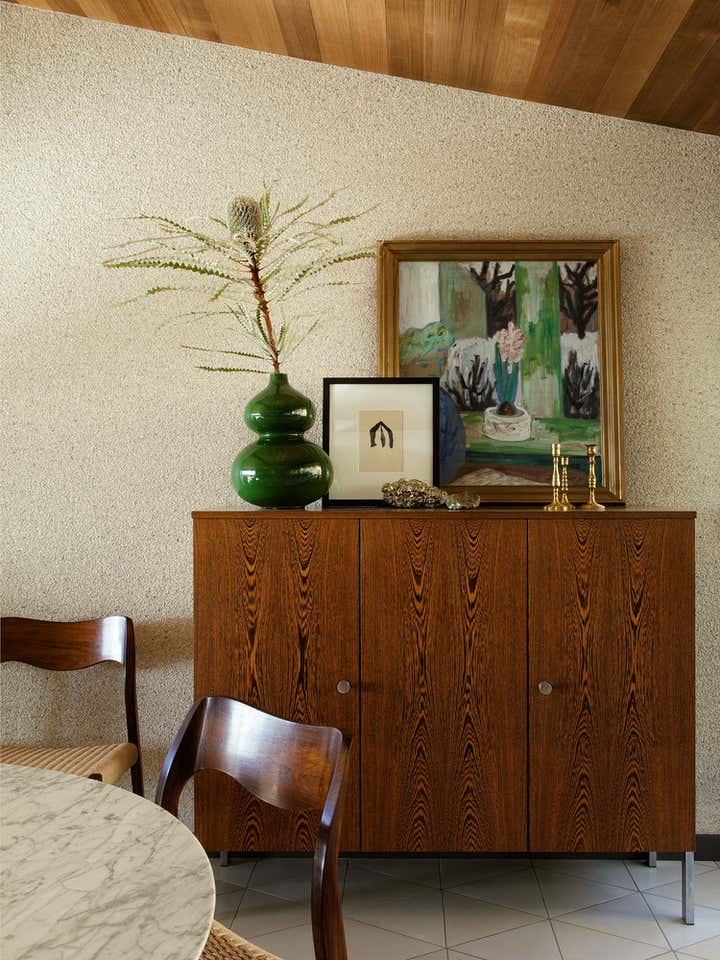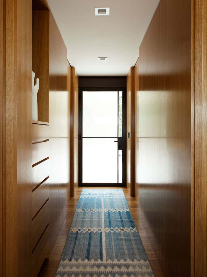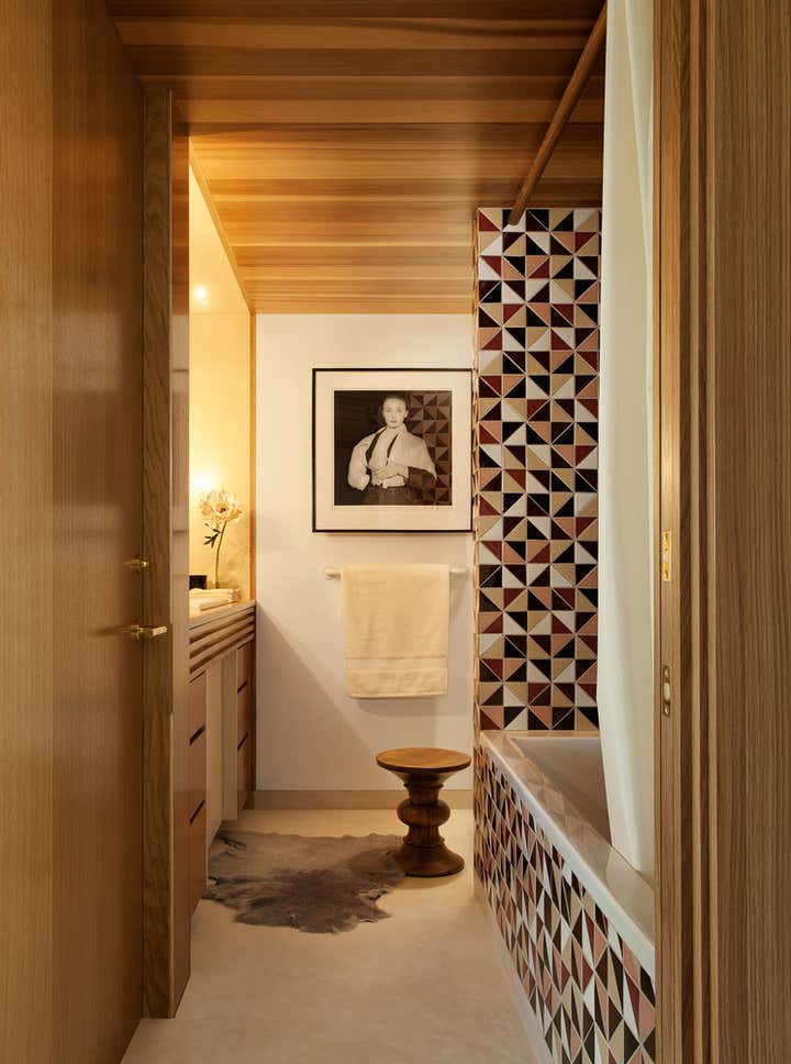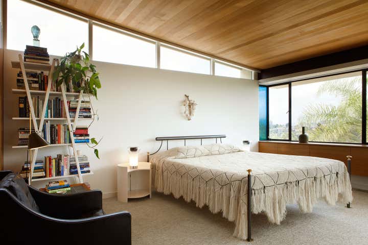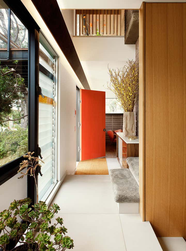 A compact two-story hillside mid-century received an extensive and thoughtful remodel; the only original elements to survive are the burnished block central fireplace core and the steel beams and window frames. A luxe materials palette elevates the house without obliterating its eccentricities, while all new systems and conveniences, including a screening room, bring the house into the 21st Century. Maintaining certain original elements, such as the decorative window screens which are water-cut aluminum copies of the plastic originals and the sconces which we restored to their original quality. Particular attention was devoted to architectural materials including custom oyster-colored triangular cement tile flooring, Western Red Cedar ceilings, American Black Walnut and rift-sawn White Oak monolithic volumes, high-gloss laminate cabinetry, custom ceramic tile bathrooms, and even stained glass paneling.