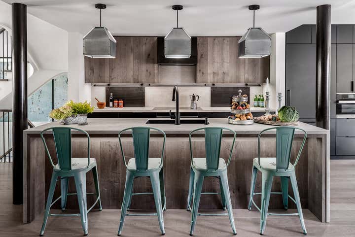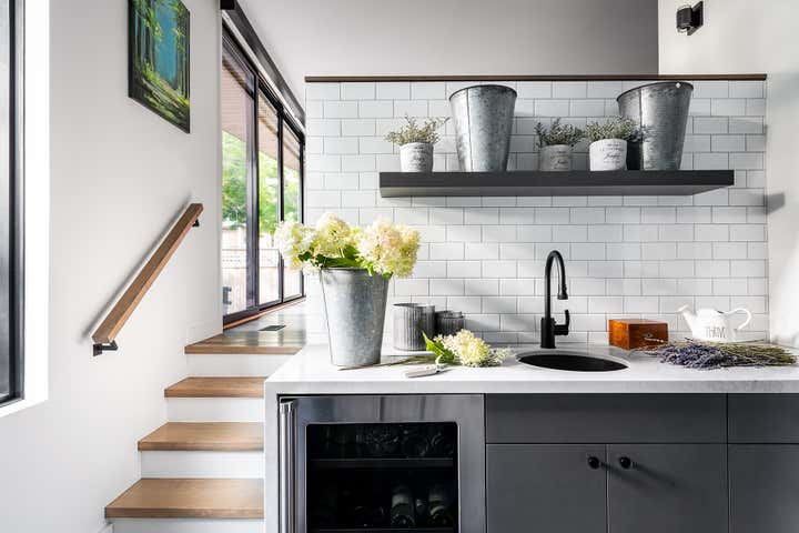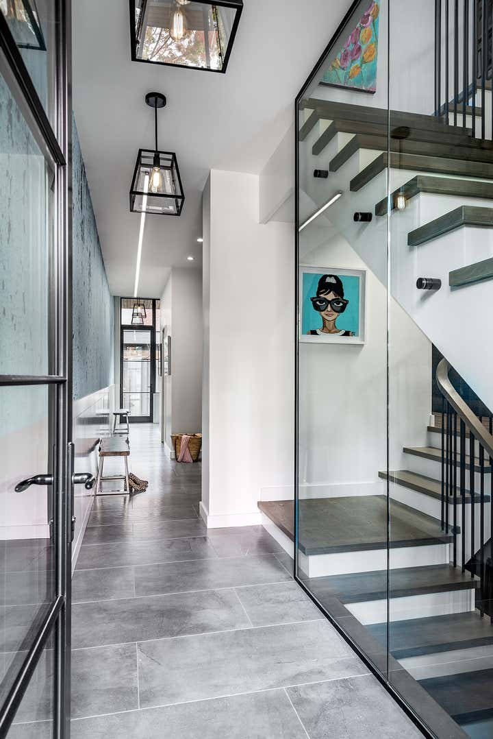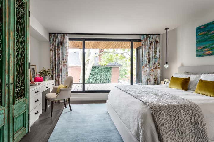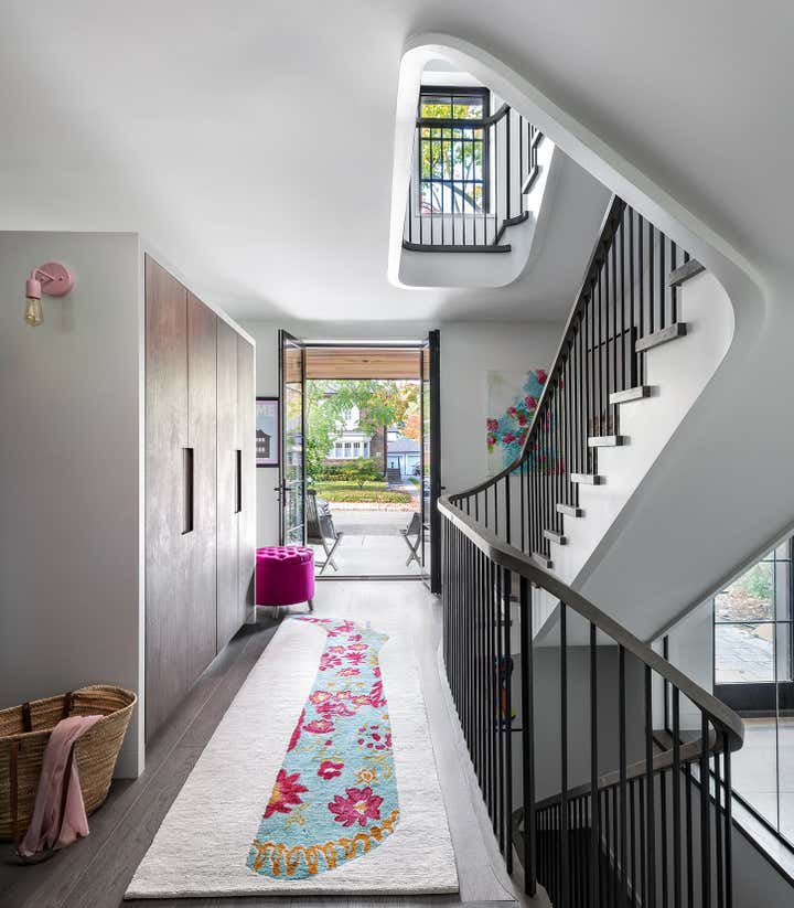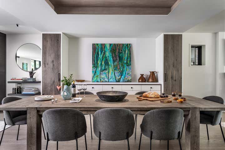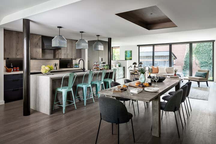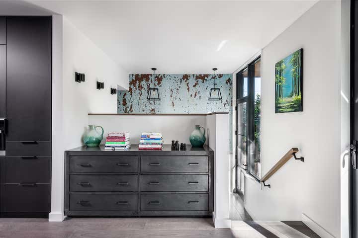 Taking an artist’s love of battered finishes, vintage and color, the design team, Dewson Architects Inc. and Sheree Stuart Design, created an interplay of modern design and rusticity which became a lynchpin for the relaxed, welcoming home for their client. The old-meets-new dichotomy starts with the home’s exterior. The quaint Tudor facade in front gives little indication of the broad, angular lines of the rear addition, where wall-to-wall glazing maximizes connectivity between indoors and out and creates a sense of expansiveness rare in 1920s architecture. Inside, the design team carefully avoided cluttering the modern space and balanced the palette, which shifts from area to area. Splashier colors reign in the four bedrooms and basement art studio, while the design team took a quieter approach on the main floor and instead layered in understated earth tones and evocative textures.