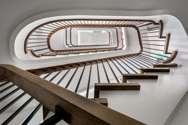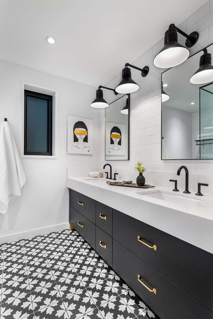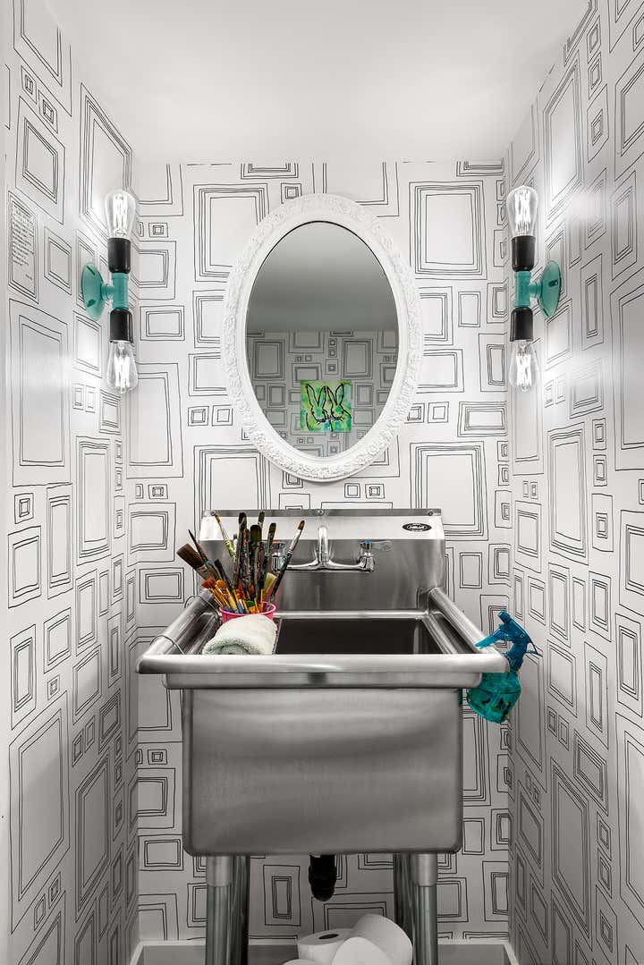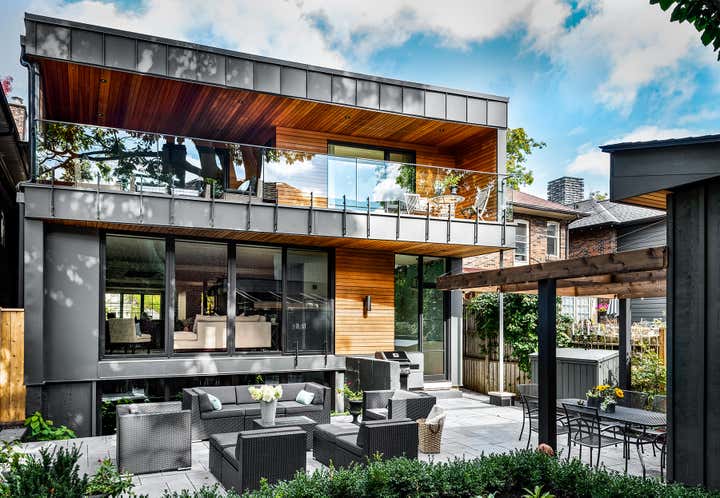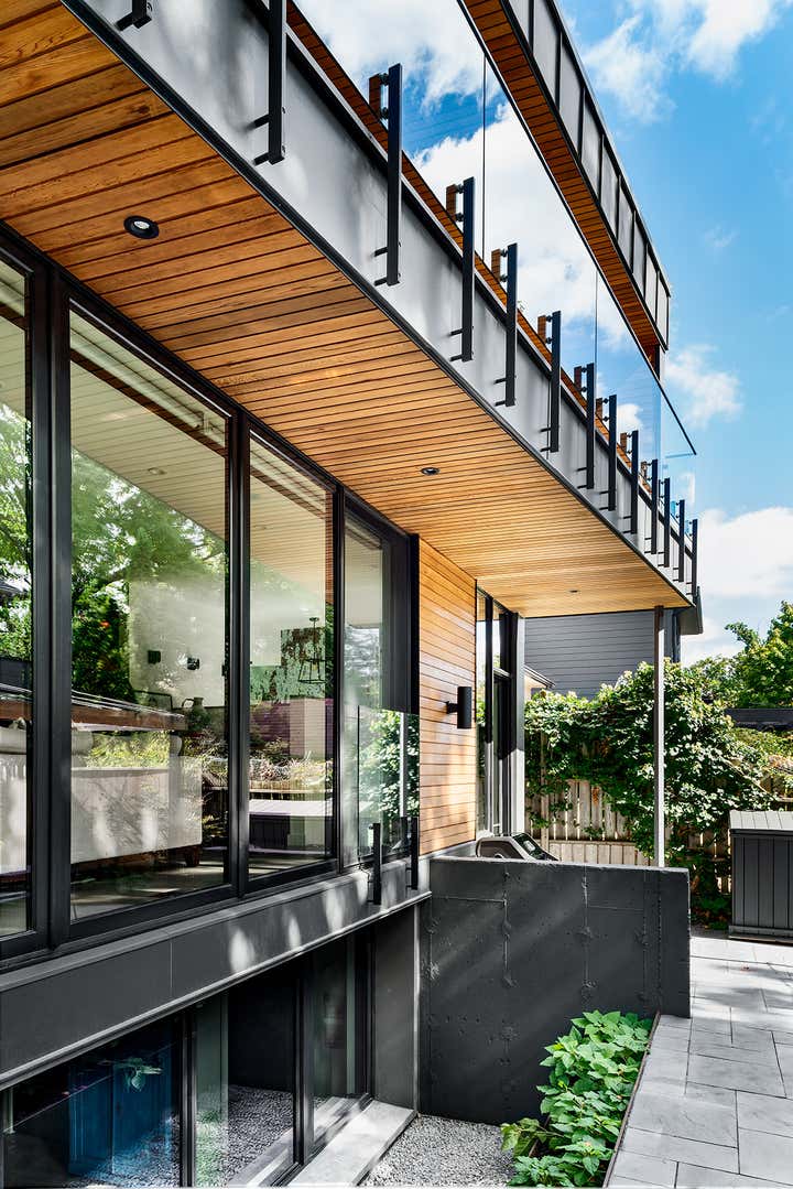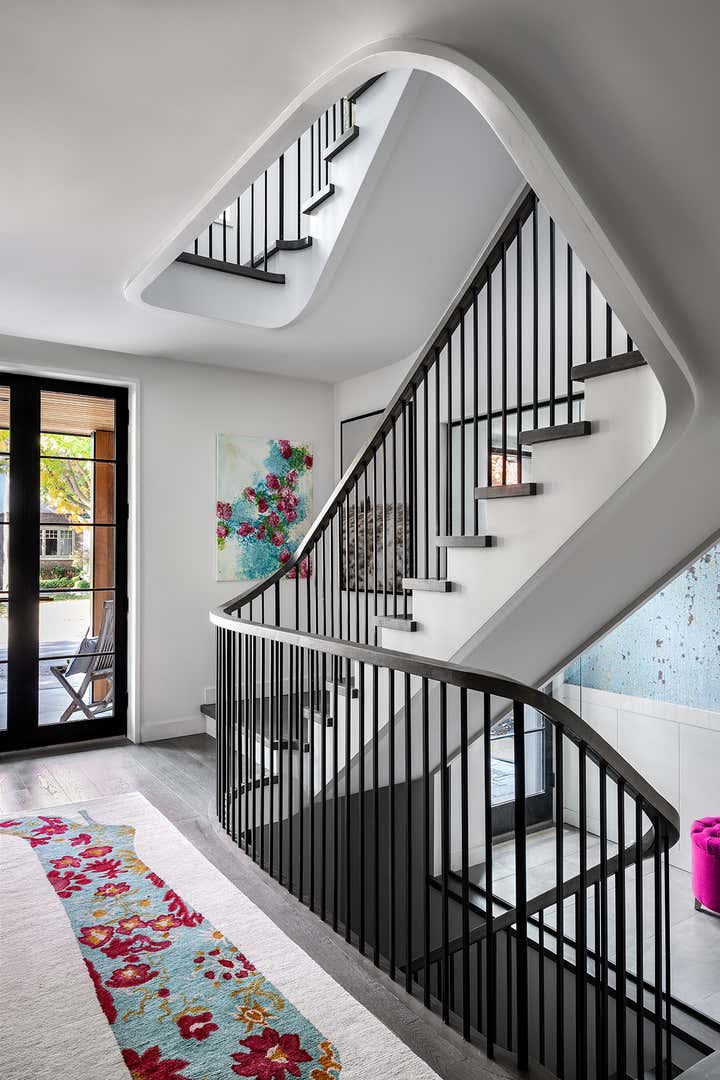 Taking an artist’s love of battered finishes, vintage and color, the design team, Dewson Architects Inc. and Sheree Stuart Design, created an interplay of modern design and rusticity which became a lynchpin for the relaxed, welcoming home for their client. The old-meets-new dichotomy starts with the home’s exterior. The quaint Tudor facade in front gives little indication of the broad, angular lines of the rear addition, where wall-to-wall glazing maximizes connectivity between indoors and out and creates a sense of expansiveness rare in 1920s architecture. Inside, the design team carefully avoided cluttering the modern space and balanced the palette, which shifts from area to area. Splashier colors reign in the four bedrooms and basement art studio, while the design team took a quieter approach on the main floor and instead layered in understated earth tones and evocative textures.