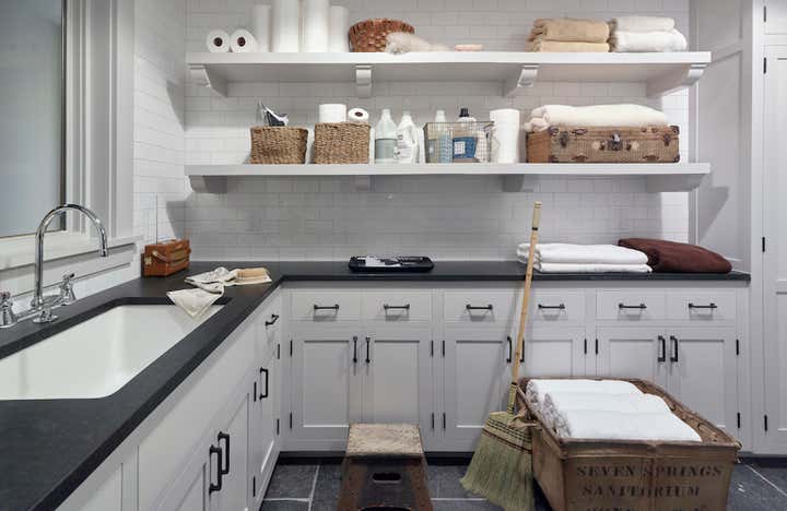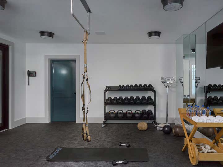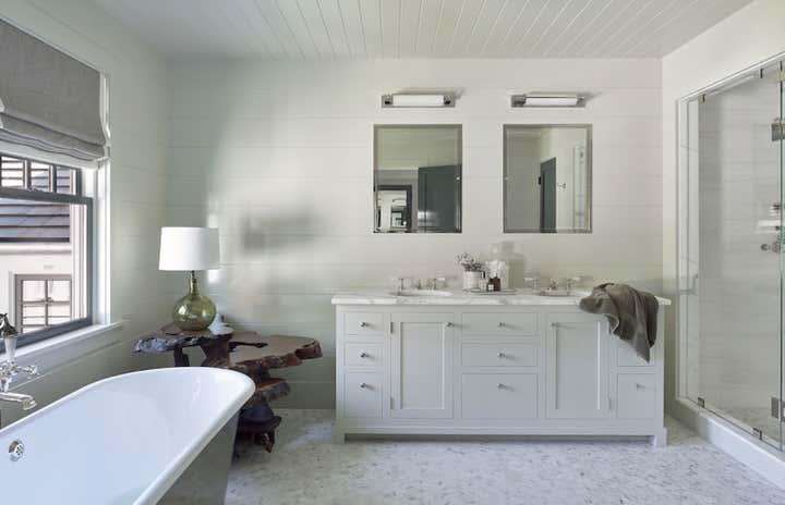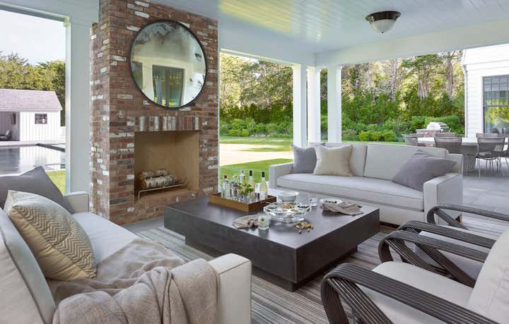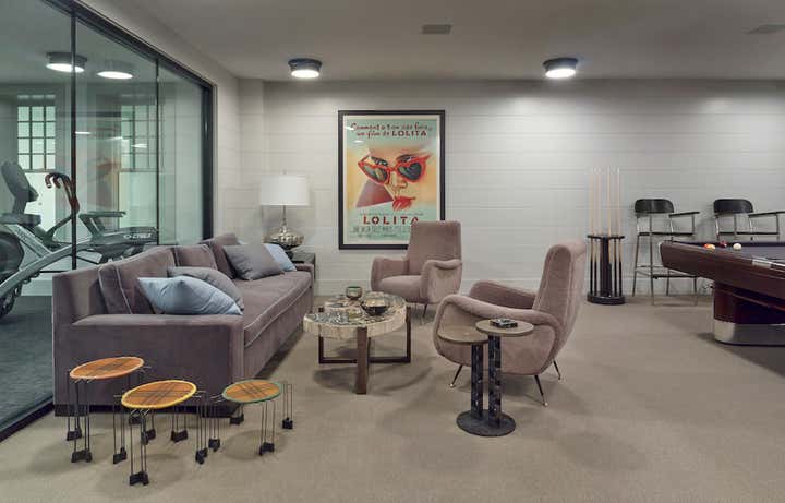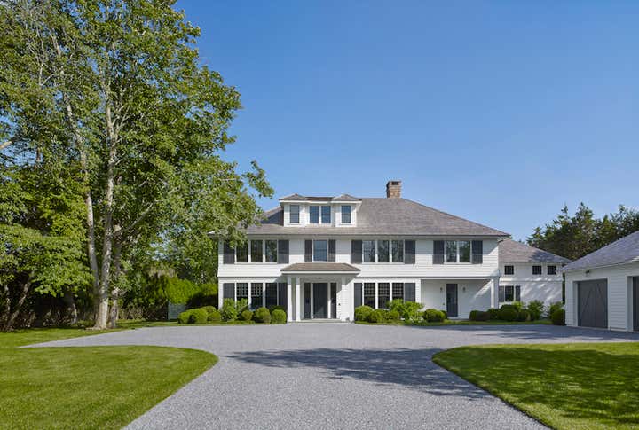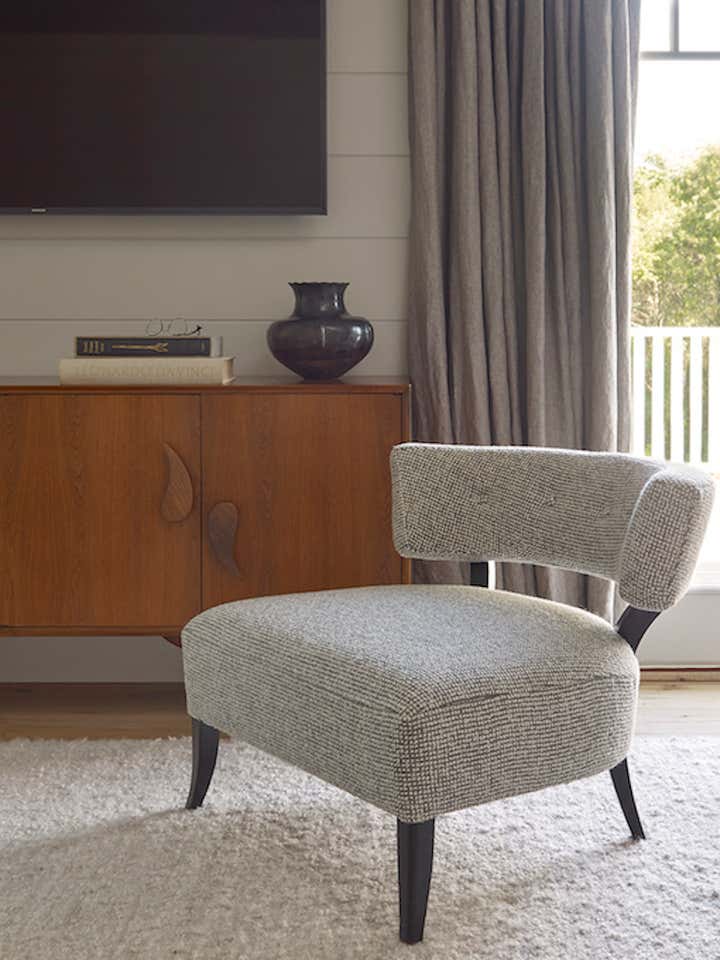 This 8,000 square foot home is located in the estate section of East Hampton and serves as a place for family and friends to gather during the summer months and on holiday weekends throughout the year. Dan Scotti designed the interiors, oversaw construction of the home itself, and collaborated on the architectural plans. The home is indicative of Scotti’s signature design aesthetic, which is defined by a combination of neutral tones, clean lines, luxurious textiles, mid-century furnishings, vintage industrial lighting and found objects. One of Scotti’s primary goals with this new-construction project was to create large spaces where the family could spend time together, while at the same time capturing the warmth and character of an older estate home. He designed a large kitchen with high ceilings and tons of natural light; but in order to make the large space feel relaxed and cozy, he hand brushed and repeatedly sanded the upper walls and ceiling to create a chalky, driftwood-like texture. A custom walnut breakfast table and vintage Eames side chairs were placed at the center of the space. In the cocoon-like media room, Scotti used a dark, high gloss ceiling, custom cashmere sectional sofa and vintage Lunel wall sconces. In the master bedroom, a chunky mohair rug is paired with a Widdicomb desk, Jeanneret armchair, and custom upholstered bed. For the dining room, Scotti paired a custom dining table and hand-knotted area rug with a Lindsey Adelman pendant fixture and a 1950’s Darrell Landrum console. Throughout the home, Scotti installed reclaimed oak flooring, vintage lighting, and repurposed vintage industrial hardware. In the mudroom, vintage bronze door handles now serve as great looking hooks for jackets and dog leashes. Scotti’s sophisticated color palette, contrasting textures, and mix of mid-century furniture, vintage lighting and accessories together create living spaces that are clean and modern, yet warm and inviting.