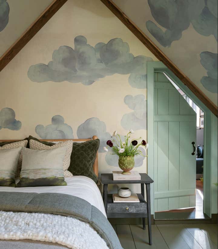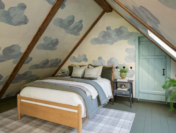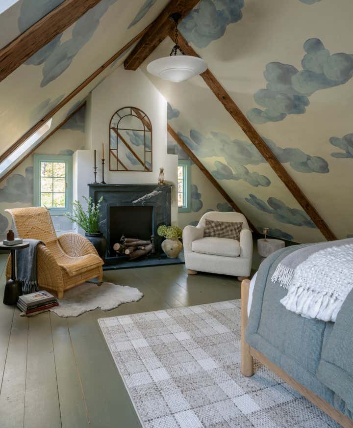 A gabled bedroom and loft transformed into a dreamy getaway.