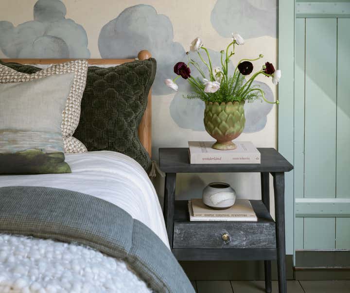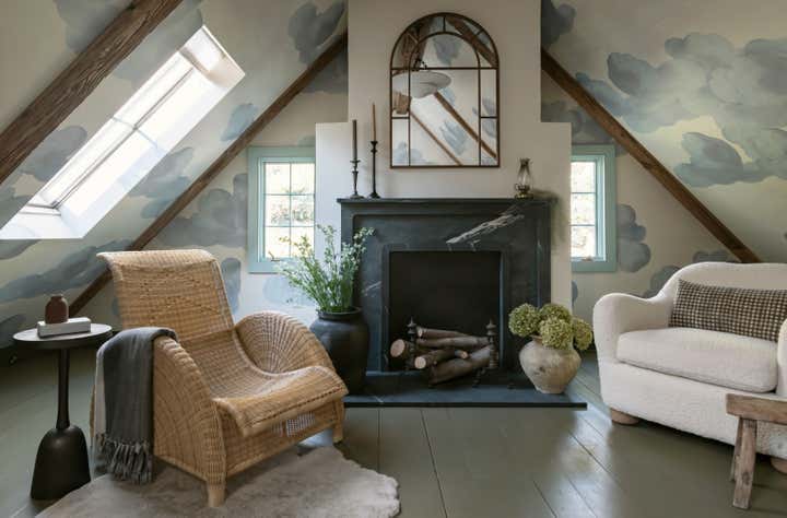 A once-forgotten space tucked into a historic home is brought back to life. With the home's rich architectural details found throughout the property, our team celebrated the use of historical elements combined with a soft modern palette. In collaboration with a local artisan, a custom wallcovering was designed for the ceiling, salvaged wood beams were added and a custom design stone fireplace surround were just a few details that developed our story.